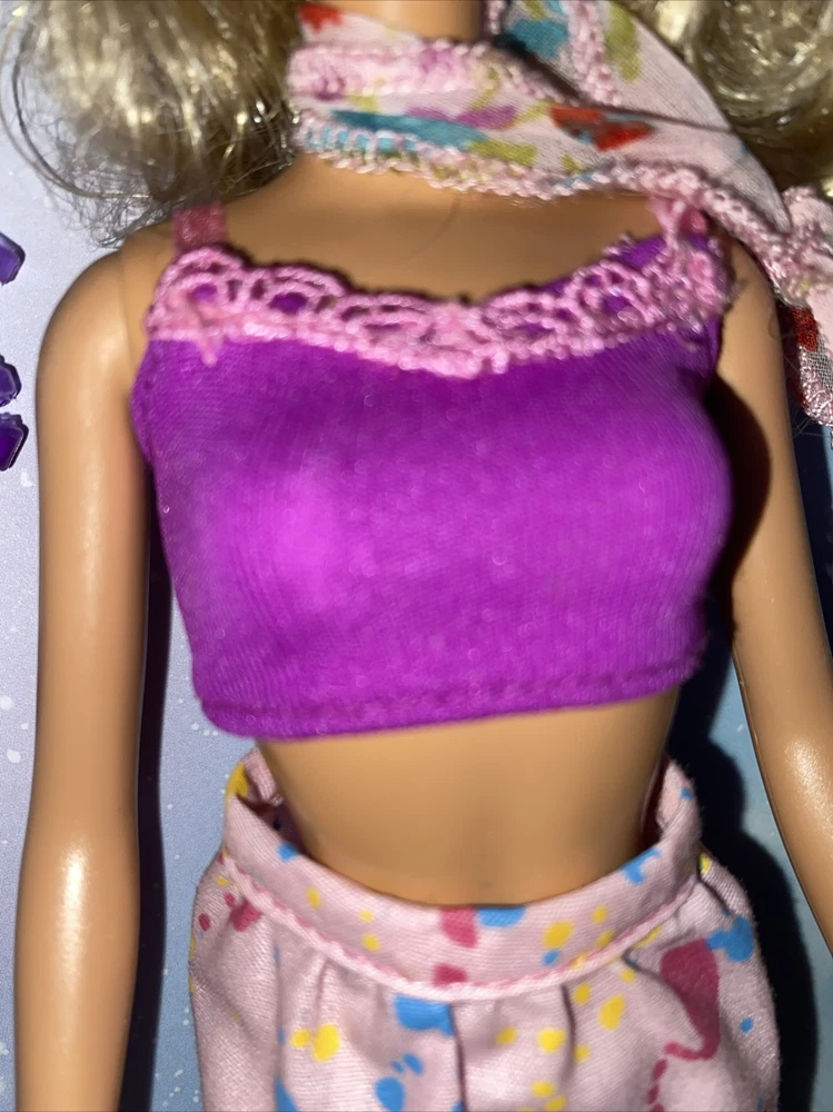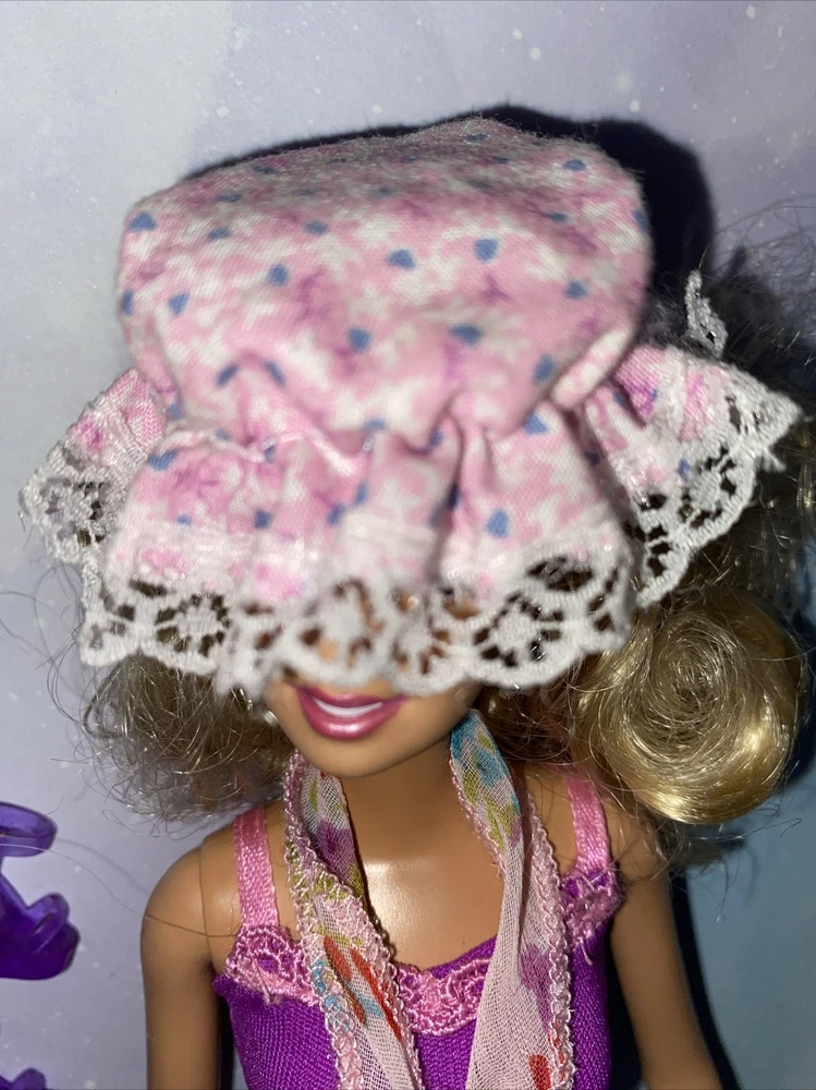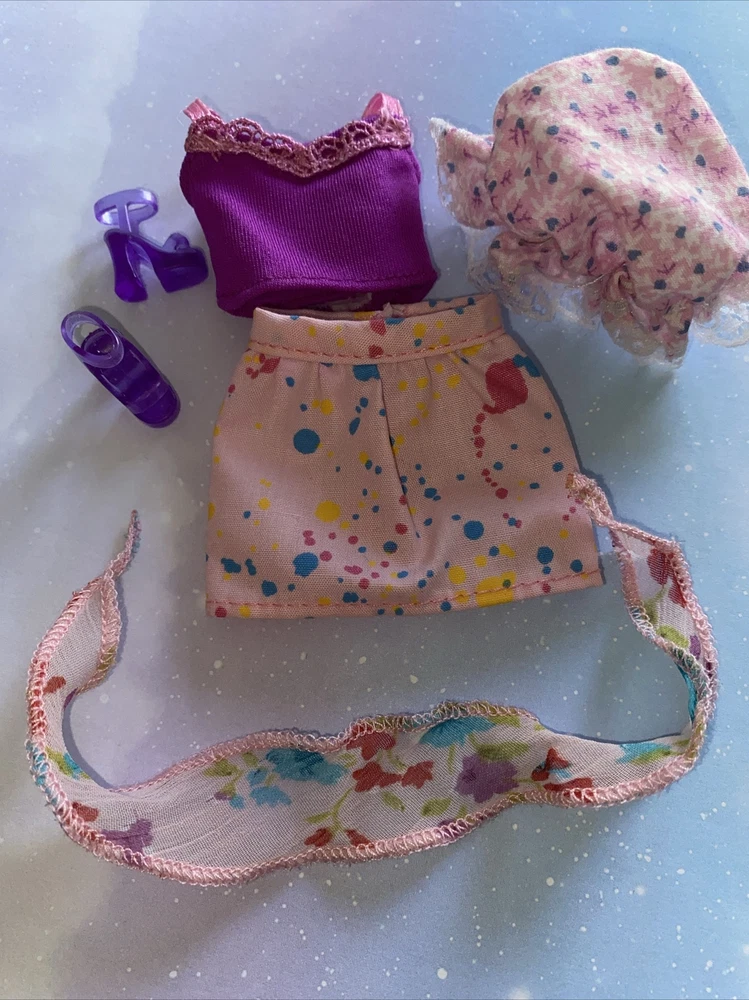 This set of Barbie clothing is perfect for any collector or fan of the iconic doll. The purple halter top and pink skirt are made from cloth material and are designed for a 12in. girl doll. The activewear and hobbies style of the clothing is perfect for any fun day out. In addition to the top and skirt, this set also includes a floppy hat and scarf, as well as a pair of shoes to complete the outfit. The set is in its original and authentic form, coming from Indonesia. Don't miss out on adding this adorable Barbie clothing set to your collection.