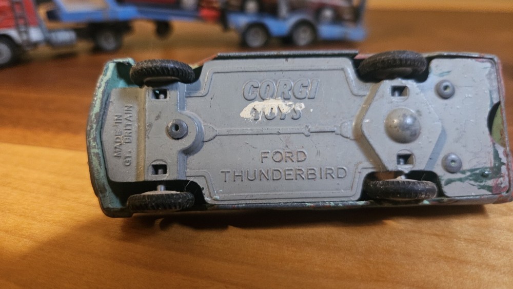 Corgi Major car Transporter with four cars. Ford Carrimore with car Transporter. Two Aston Martin DB4, Volkswagen van, and Ford Thunderbird. Great condition models, good to display or play with.