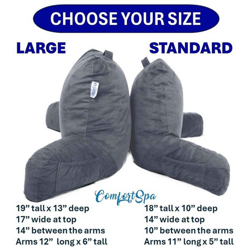Why struggle with stacks of pillows, trying to find a way to be comfortable while reading in bed or watching TV? Why the Reading Pillow is superior to similar products: - You will love the firm comfort and convenience of your new lounge backrest! Pillow is stuffed full of shredded foam that offers firm support while conforming to your position. - Bed backrest measures 19” high x 17” wide, and each arm extends a full 12 inches. Use the two bonus arm pockets to secure your book, phone, tablet, or TV remote. - If you’re on bed rest or suffer from GERD or heartburn, our bed chair pillow will provide excellent support so you can rest more comfortably. - Back support pillow comes compressed to shipping – simply shake and knead vigorously to separate clumps of shredded foam; pillow will be plump and firm in 24-48 hours. To clean polyester velour cover, simply wipe with damp cloth. We’re sure you’ll love our lounge pillow. Add one to your cart today, and consider picking up another as a gift for a friend! DELUXE READING PILLOW – The back pillow for bed sitting up is made of shredded foam that conforms perfectly to all body types for optimum alignment while relaxing upright. This large pillow measures 19 inches high by 17 inches wide, providing firm ample back support. Each arm extends out 12 inches to support your shoulders and neck, reducing stress on joints and muscles for optimum healthy comfort. BED WEDGE – The pillow for sitting up in bed is shipped compressed. Just remove the wrapping; loosen the shredded foam by shaking for 5 minutes, or by placing it in the dryer (low heat) for 5-10 minutes. Allow 24-48 hours for pillow to fully expand. NOTE: Cold weather shipping slows down expansion! Allow the full 48 hours for full expansion. VERSATILE COMFORT – The backrest pillow provides comfortable back support as a sitting up pillow adult for bed while reading a good book, watching TV, or surfing the internet. Features medical grade material for those on bedrest , suffering from GERD or heartburn. Use as a wedge to elevate your upper body to help you stay more comfortable while at rest or sleep . EASY CARE COVER – reading pillows feature a warm breathable velour cover that can easily be spot cleaned with a damp cloth but is removable and machine washable and dry when needed. This sitting up pillow features anti-clump shredded foam padding for a lifetime of soft comfort-ability. CUSTOMIZE YOUR PILLOW: reading pillows are fully customizable to fit your individual needs. Firmness is adjustable by removing or adding foam through the bottom zippers. The attached fabric handle makes it easy to carry your pillow with you from room to room. Featuring BONUS storage located in the arms side pockets for your phone, glasses, book, tablet, or remote.