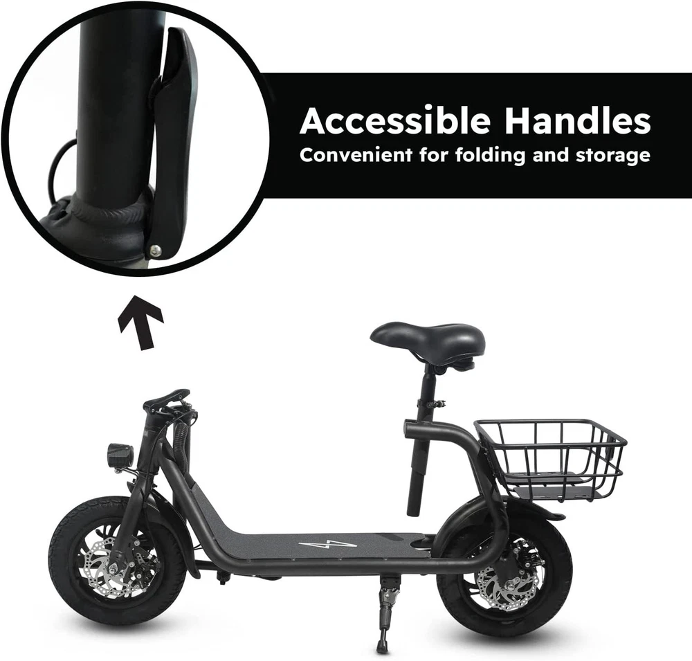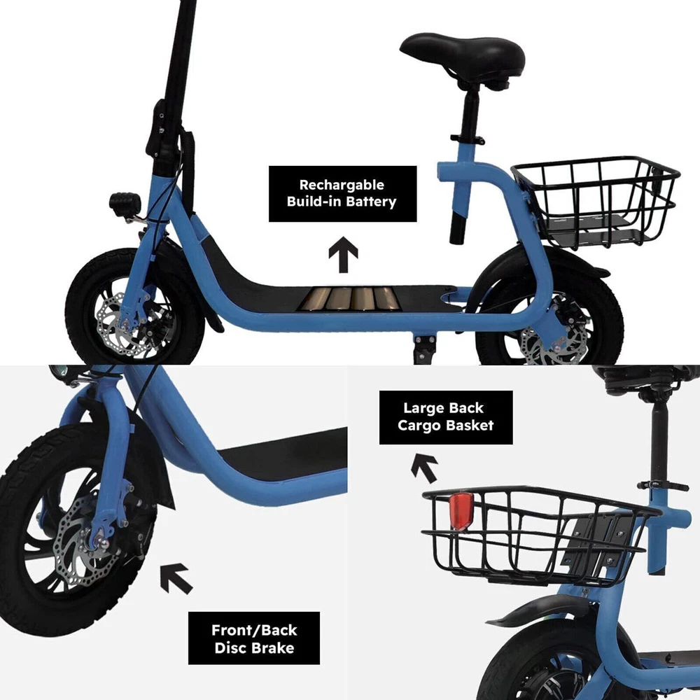 Adult Sports Electric Seated Scooter Folding E-Bike Commute UL 2849 Certified Feature Powerful Motor & Long Range: The adult electric bike comes with a 450W powerful brushless motor and large 40 cells 8.0Ah Lithium-ion battery, enables a 15-mile range, and a max speed of 15.5 mph. Portable & Lightweight: The foldable electric bike only weighs 42 lbs and can comfortably accommodate riders up to 265 lbs. This adult electric scooter can be easily folded and stored in the car trunk, which makes it perfect for commuters and students. Safe & Durable: With double braking systems, the front and back disc brake of the e-bike give you double safety. The 12" tires built for multi-terrain of daily use or outdoor activities. Detail Oriented Design: The E Scooter come with 13 x 11 inch rear carry basket and scooter deck, front LED light and rear reflectors for safety. Easy Assemble Required: The only assembly required is the seat and basket attachment. The handle bars are folded and just need to be erected. All tools are provided in the box. The E-bike have passed UL 2849 safety standard detec tionhttps://productiq.ulprospector.com/en/profile/ Package Listing 1 X E Scooter 1 X Charger 1 X User Manual 1 X Tool Kit After you receive the adults scooter, before first Riding, please do the follows: 1. Inflate the Tires before Riding. 2. Complete Charging (Light RED: Charging, Light Green: Charging Compelte). Payment Shipping Return Feedback Question Payment We accept payment via Paypal ONLY. Immediate payment is required & Shipping will be arranged only your payment is cleared. Shipping Same business day dispatch if paid by 4 pm EST(1 pm PDT). No shipping on weekend or Public Holidays & No responsibility for any customs duty. Return We stand behind our products. Items can be returned for exchange or full refund within 60 days from the date you receive your item. Return shipping is the responsibility of buyer unless the return is a result of our mistake (i.e., your receive the wrong item or damaged item). We will pay for shipping replacement back to you if an exchange is requested. If you want to initiate a return, simply clicks "Return this item" next to the transaction in My eBay, chooses a reason, and prints a return shipping label and packing slip. We’re automatically notified. Feedback Please leave us a FIVE star and POSITIVE feedback if you are satisfied with our product and service. Neutral or negative feedback will not solve problems happily. We believe communication will fix problems and hope every customer can have a good purchasing experience. Question All ebay message will be responded within 1 business day or less, except weekends and holiday!
