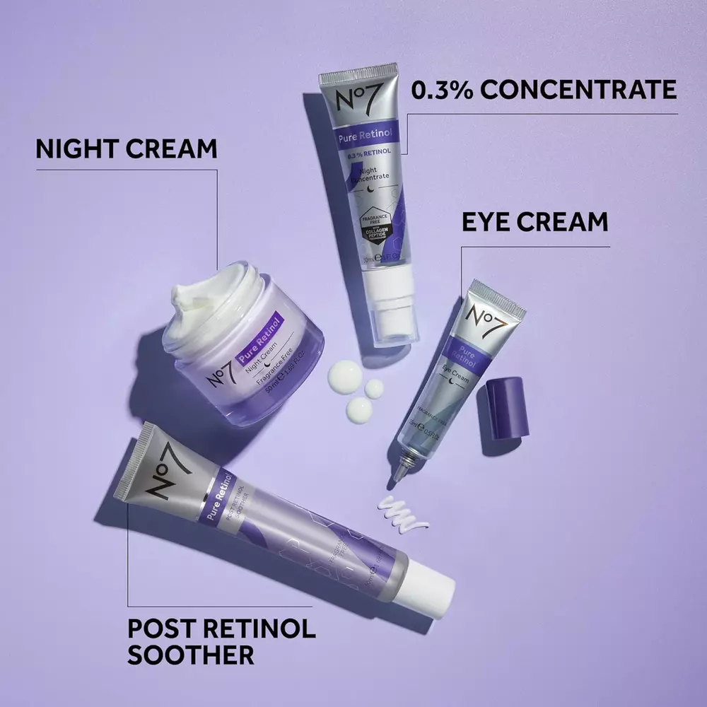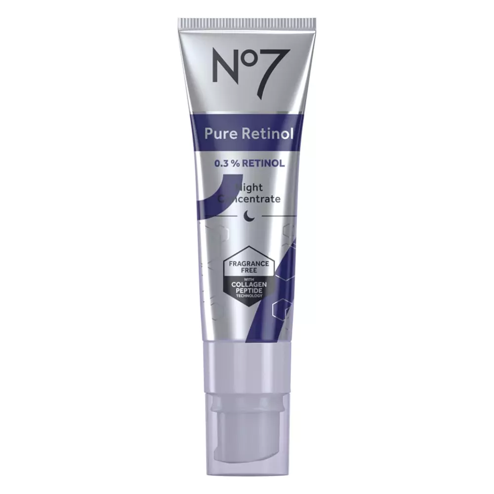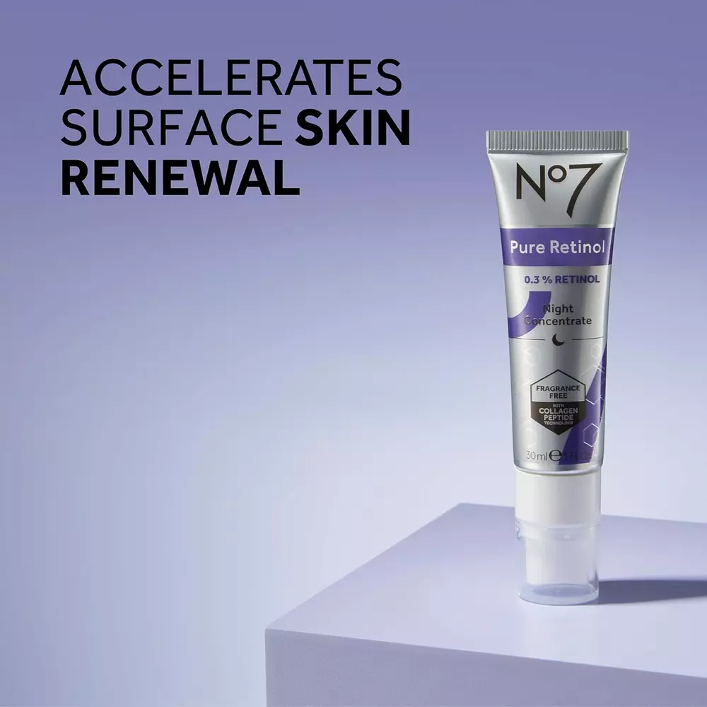 This night retinol concentrate offers a boost of overnight anti-aging power that reboots and renews skin, helping it act like younger, healthier-looking skin. This boosted anti-wrinkle serum also helps to refine pores acting as a pore cleaner. Age-Defying Ingredients & Technology - Now for the first time, No7 has combined two powerful age-defying skincare technologies in one expert night serum for face formula. With a next-generation retinol complex and our advanced peptide technology, Matrixyl 3000+™, this pore minimizer retinol serum is the ultimate anti-aging serum night time skincare users need in their rotation. For Skin that Looks Smooth & Firm - When using this retinol serum for face, lines look smoother, skin tone looks even and skin appears firm, lifted, brighter and more radiant while pores and texture look refined. The multi action formula acts as a wrinkle night serum and a pore minimizer for face while also targeting fine lines and wrinkles. Slow-Release Technology for Optimal Efficacy - This retinol night cream concentrate features a unique slow-release retinol delivery system that offers powerful retinol for face results while minimizing irritation commonly associated with retinol facial treatments and retinol for dark spot products. Empowering Women Since 1935 - No7 offers women luxurious and glamorous beauty, like this skin renewing retinol serum, at an affordable price. Our products give women the support, confidence and momentum to live life on their own terms. Discover more skin care products like this dual resurfacing retinol serum and pore cleaner, and other anti-aging serum night repair products at the No 7 Amazon store. Product Description The video showcases the product in use. The video guides you through product setup. The video compares multiple products. The video shows the product being unpacked. Discover the Pure Retinol Line Add to Cart Add to Cart Add to Cart Add to Cart Customer Reviews 4.4 out of 5 stars 275 4.5 out of 5 stars 1,819 4.5 out of 5 stars 851 4.3 out of 5 stars 68 4.6 out of 5 stars 1,237 Price — $22.93 $ 22 . 93 $15.99 $ 15 . 99 $8.00 $ 8 . 00 $28.95 $ 28 . 95 Pure Retinol Collection ✔ ✔ ✔ ✔ ✔ Description Accelerates skin renewal Accelerates skin renewal Wrinkles look visibly reduced Provides soothing moisture Gentler skin renewal formula Step in Routine Use once-twice weekly Use nightly Use every other night Use daily Use once-twice weekly For All Skin Types ✔ ✔ ✔ ✔ ✔ When to Use PM PM PM PM PM