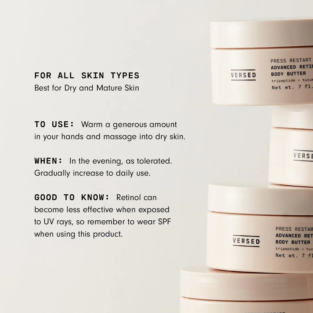 Fast Shipping Great Customer Support Satisfaction Guaranteed DESCRIPTION Shipping Shipping Shipping All domestic packages are shipped for Free (Unless other shipping method was selected during the checkout) Most items ship and arrive much sooner than the estimate delivery date. Usually within 2-3 days from payment. However, we have longer estimates to compensate for the occasional delay or supply chain breakdown. We do not accept P.O. BOXES - PLEASE PROVIDE A PHYSICAL ADDRESS Return Return Return In the event that you would like to return your purchase, we allow returns that are processed within the defined return date (the return date is to be found in the return policy/shipping and handling section) Please contact us for a return authorization and the return shipping address. Payment Payment Payment PayPal is our preferred method of payments it's the quickest, easiest and most secure way to pay for your goods or services online. PayPal offers buyer and seller protection should there be a problem. If you do not have a PayPal account, to get started and buy your first item with us is very easy. Simply click on the 'Buy It Now' button and follow the eBay checkout steps. Select PayPal as the payment method you then will be given the chance to enter your card details in to PayPal's secure checkout in order to pay for your order. Once the payment has been made, you will then be given the opportunity to make your own PayPal account to make paying for your items in the future very easy. Should there be a problem with payment please do let us know. Feedback Feedback Feedback Customer satisfaction is very important to us. If you have any problem with your order,please contact us and we will do our best to make you satisfied, please do not leave a negative feedback before we resolve your problem. We guarantee that your issue will be solved quickly. As long as you are happy with your purchase of , please leave us a positive feedback. Your feedback is very important to us it affects our search placement on eBay. We will leave a positive feedback for you in return automatically once we receive your feedback. Contact Us Contact Us Contact Us If you have any queries, please contact us via ebay. We usually respond within 24 hours on weekdays. Thank you for visiting our ebay store! Repair & Renew Your Skin - Formulated with 30% more encapsulated retinol than our best-selling Gentle Retinol Body Lotion, the Advanced Retinol Cream delivers maximum firming and skin-smoothing results in minimal time. Its whipped, nourishing formula features a powerful tripeptide that leaves your skin looking noticeably more radiant. Skin-Smoothing Ingredients - Keeping sensitive skin types in mind, each ingredient in our anti aging retinol lotion is good for you and your skin. Tucuma and cocoa butters deeply moisturize and nourish your body from head to toe. Real Skin, Real Results - Based on an eight-week trial of people aged 25-65, 100% saw improvement in the overall appearance of their skin, 100% agree skin feels softer and more supple, and 94% say their skin feels firmer, all thanks to our retinol body cream. How to Use - Warm a generous amount of the skin firming body lotion between fingertips and massage into dry skin. Start by applying in the evening, as tolerated and gradually increasing to daily use. Retinol can become less effective when exposed to UV rays, so remember your SPF when using this product! High-Performance, Not Hype - At Versed, we develop products that perform for your skin, body and the planet. Every single ingredient has a purpose, and unless that purpose is proven safe and effective, we skip it. We’re the first skincare brand that’s community co-created, so you could say listening is in our DNA. From concepting to testing, every product we make is approved by you. Advanced Retinol Body Butter 7 oz - Skin Firming Lotion with Tripeptide Click here to see description Fast Shipping Great Customer Support Satisfaction Guaranteed DESCRIPTION Shipping All domestic packages are shipped for Free (Unless other shipping method was selected during the checkout) We ship within two business days of payment, usually sooner Standard FREE shipping takes between 3-5 business days Expedited shipping takes between 2-3 business days Overnight shipping takes between 1-2 business days We do not accept P.O. BOXES - PLEASE PROVIDE A PHYSICAL ADDRESS We Ship Globally using ebay's GSP, the item is sent to a logistic center in KY and shipped from there to the rest of the world. International customers are responsible for all duties and taxes Contact your local authority for questions related to the amount of duties or taxes you will be responsible for Return In the event that you would like to return your purchase, we allow returns that are processed within the defined return date (the return date is to be found in the return policy/shipping and handling section) Please contact us for a return authorization and the return shipping address. Please contact us for a Return Merchandise Authorization (RMA) number. We advise you to use a reputable carrier service when returning your goods. Please pack all returns appropriately. We ship globally Via eBay's global shipping program (GSP). Thus we don't cover returns for items shipped globally. Buyers returning such items will be refunded ONLY for the item's cost and not for the shipping. please check the Voltage information and make sure it matches the one in your country. In case it's not stated in the description, do ask us. Payment PayPal is our preferred method of payments it's the quickest, easiest and most secure way to pay for your goods or services online. PayPal offers buyer and seller protection should there be a problem. If you do not have a PayPal account, to get started and buy your first item with us is very easy. Simply click on the 'Buy It Now' button and follow the eBay checkout steps. Select PayPal as the payment method you then will be given the chance to enter