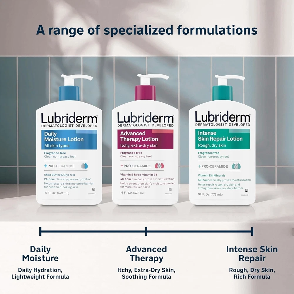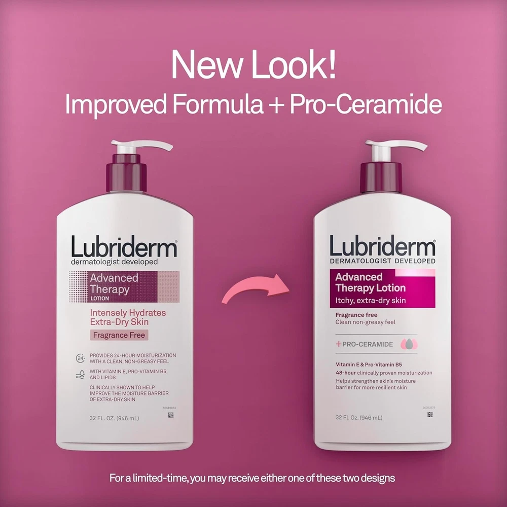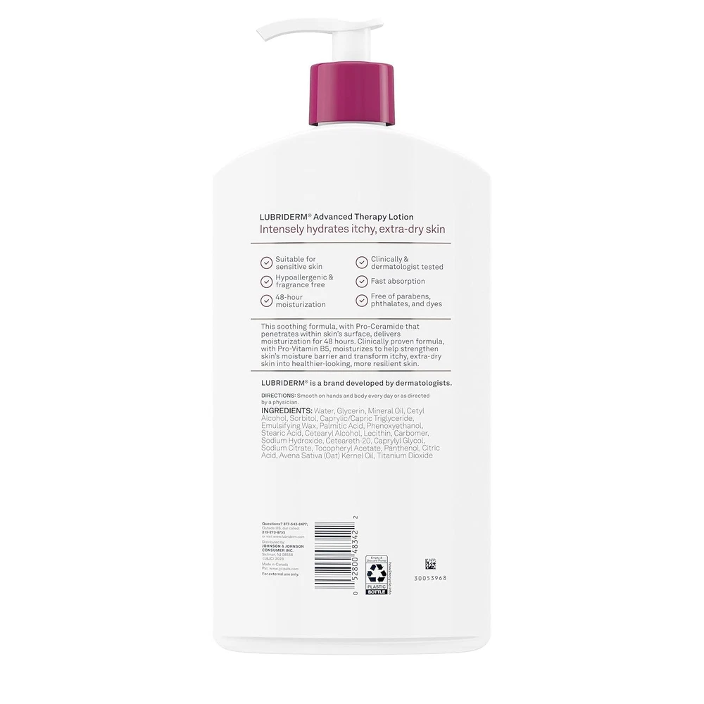 Advanced Therapy Moisturizing Hand & Body Lotion For extra dry skin - 32 Floz About this item 32-fluid ounce bottle of Lubriderm Advanced Therapy Fragrance-Free Daily Moisturizing Lotion+ Pro-Ceramidewith Vitamin E and Pro-Vitamin B5 itchy, extra-dry skinto help strengthen skin’s moisture barrier Specially designedunscented lotion intensely hydratesitchy, extra-dry skin. The soothing formula of the body lotion with Pro-Ceramide penetrates within skin's surface to deliver 48-hour clinically proven moisturization Body lotion is formulated with vitamins E and Pro-Vitamin B5which moisturizes to help strengthen skin's moisture barrier. The non-greasy lotion transforms itchy, extra-dry skin into healthier looking, more resilient skin Clinically- and dermatologist-tested lotion is hypoallergenic and fragrance free. The daily hand and body moisturizer suitable for sensitive skin is formulated free of parabens, phthalates and dyes Lubriderm, a dermatologist developed, advanced therapy lotion absorbs quickly and leaves a clean, non-greasy feel. To use, smooth on hands and body daily or as directed by a physician Product Description Lubriderm Advanced Therapy Fragrance-Free Daily Moisturizing Lotion + Pro-Ceramide intensely hydrates and helps relieve itchy, extra-dry skin. From a dermatologist-developed brand, this fragrance-free moisturizing lotion provides 48-hour clinically proven hydration and helps strengthen skin's moisture barrier for more resilient skin. The soothing formula of this non-greasy lotion is suitable for sensitive skin and contains Pro-Vitamin B5 and Vitamin E to moisturize and transform itchy, dry skin into healthier-looking skin. The fast-absorbing formula of this hypoallergenic body lotion has been clinically, and dermatologist tested and is free of parabens, phthalates and dyes. To use, smooth on hands and body daily or as directed. Advanced Therapy Lotion + Pro-Ceramide for extra-dry skin from Lubriderm, a dermatologist developed brand. From the manufacturer