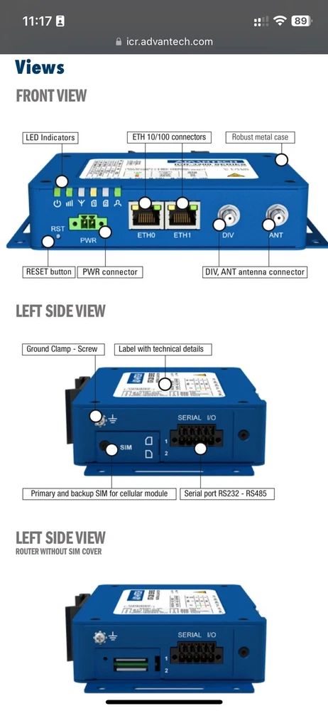 ICR-3232 is an industrial cellular router intended for the AUS/NZ/BRA market. This router is an ideal device for wireless communication in mobile networks that make use of LTE, HSPA+, UMTS, EDGE or GPRS technology. Due to the high speed of data transfer up to 150 Mbps (download) and up to 50 Mbps (upload) is this router an ideal solution for specialized M2M devices and IoT as well as for wireless connection of traffic and security camera systems, individual computers, LAN networks, automatic teller machines (ATM) and other self-service terminals. As a standard, the ICR-3232 router is equipped with two Ethernet 10/100 Mbit/s, one combined serial line RS232/RS485, one binary input and one output. ICR-3232 also contains two readers for 3 V and 1.8 V SIM cards, which are placed on the left side of the device. The router can be equipped with a WiFi module, but this must be part of the initial configuration – it cannot be added to the router at some point in the future. The router can be provided only in a metal casing. Refer link for additional details https://icr.advantech.com/support/router-models/detail/icr-3232 Note : Before placing order, Please refer to the specifications and ensure it works for your region. Returns are not accepted .