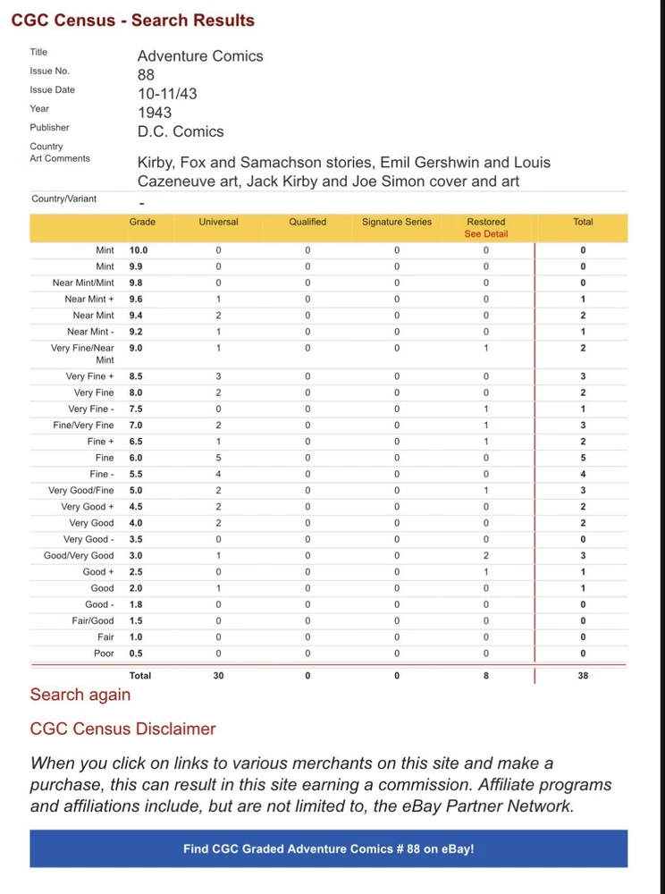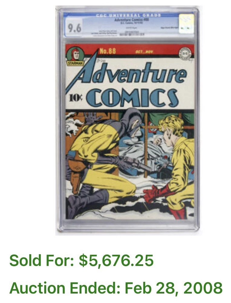 ⭐️ Adventure Comics #88 ⭐️ DC 1943, ⭐️ . CGC 7.0 Very Fine ⭐️ Terrific Simon & Kirby Sandman 🔥 ⭐️ . WWII Nazi Cover 🇺🇸 ⭐️ Very Cool Splash, Sandman, ⭐️ . Manhunter and Starman Art ⭐️ Digital examples included in photos ⭐️ Low Census (See Photos) ⭐️ DC-SandMan Collectina ⭐️ ⭐️ . Scarce Early Golden Age Adventure Comics including The Sand Man in Very Fine condition are very sought after books and are in high demand . The Sandman was originally one of the "mystery men" to appear in comic books and other types of adventure fiction in the 1930s, but later was outfitted with a Purple and yellow costume and developed into a proper superhero, acquiring a sidekick, Sandy, and founding the Justice Society of America (JSA) 🇺🇸 Wizard Magazine ranked The Sandman Wesley Dodds among the Top 200 Comic Book Characters of All Time, and he is the oldest superhero in terms of continuity to appear on the list. This Golden Age Very Fine beauty exemplifies American Patriotism during WWII ! This encapsulated gem is close to 80 years old and will provide the next proud owner a great investment for years to come! Happy Collecting !!