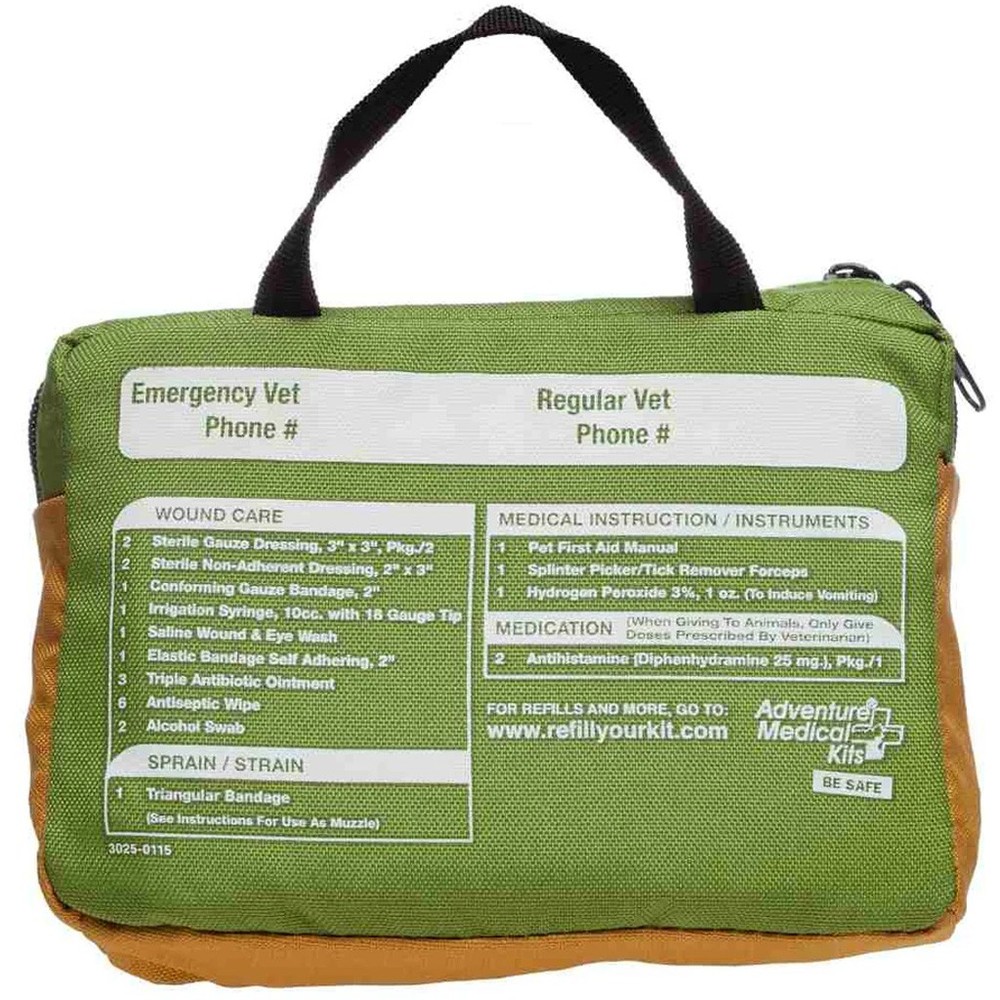 The Adventure Medical Trail Dog Kit is a compact, trail-ready first aid kit designed specifically for treating common canine injuries during hikes, camping trips, or travel. Weighing just 12 ounces, it includes essentials for wound care, tick removal, sprains, and more—all packed in a waterproof DryFlex bag. A Pet First Aid Handbook provides clear guidance for handling injuries on the go, while key items like cohesive bandages, irrigation tools, and a triangular bandage ensure you’re equipped for emergencies. Keep your dog safe and prepared, no matter where the trail leads. Designed to treat common trail injuries in dogs Includes Pet First Aid Handbook Packed in waterproof DryFlex bag Weight: 12 oz Dimensions: 7.5" x 5.3" x 1.5" Includes 2 sterile gauze dressings (3" x 3") Includes 2 non-adherent gauze dressings (2" x 3") Includes 1 roller gauze (2" x 4.1 yards) Includes 1 elastic cohesive bandage (2") Includes 1 triangular bandage (usable as a muzzle) Includes 1 wound irrigation tool (10 cc) Includes 1 splinter/tick remover forceps Includes 3 triple antibiotic ointments (single use) Includes 2 antihistamine tablets (Diphenhydramine 25 mg) Includes 1 hydrogen peroxide (3%, 1 oz) Includes 1 saline solution (100 ml)