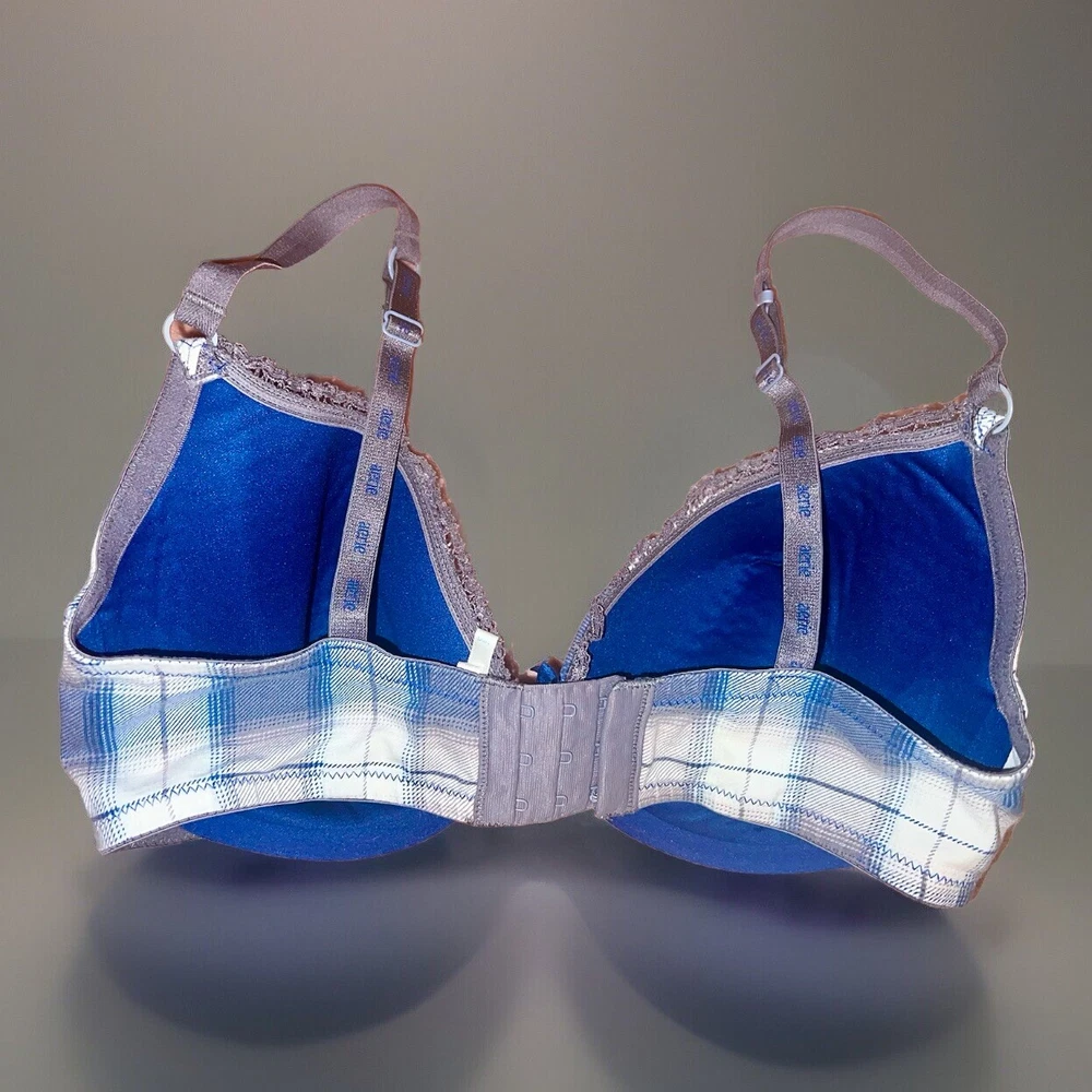 Aerie 34DD Sasha Bra- Blue & White Plaid Print. Condition: Very good for being from the early 2000s. Has been in storage is very clean, stain free, tear and rip free as well. No odor. Only worn a couple of times years back, very cute bra but no longer fits. Features: Lightly Lined, Has Underwire. Small dark blue bow in the middle of the bra. Adjustable straps.