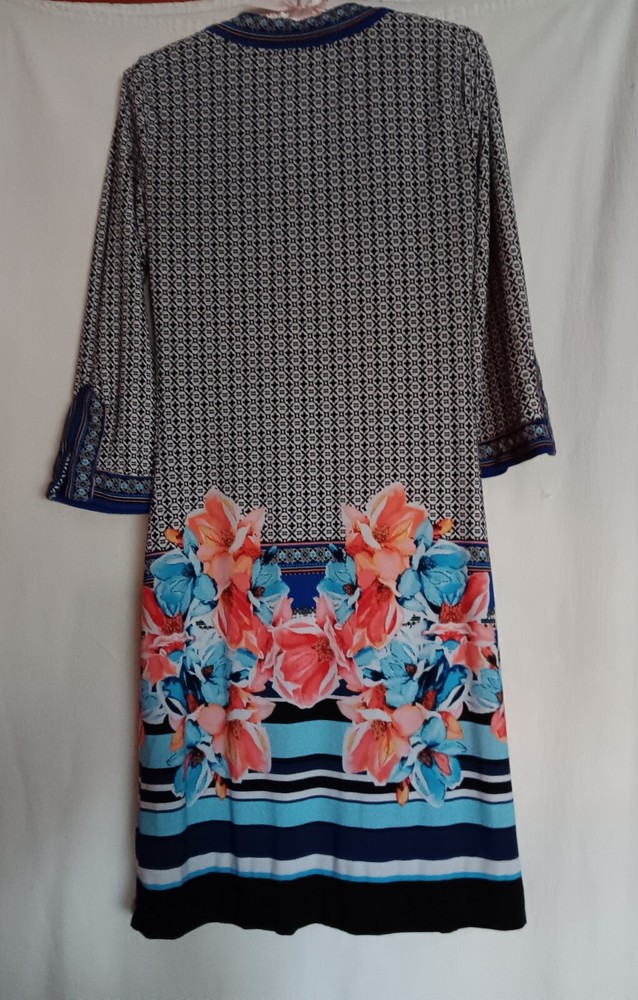 This beautiful dress from New York & Company is perfect for any casual occasion. The multicolor pattern and bohemian theme make it a unique addition to any wardrobe. The dress features a V-neckline and 3/4 sleeves, with a knee-length shift style that is both comfortable and stylish. Made from a combination of polyester and spandex, this dress provides stretch and comfort, and is perfect for sizes XS. The pullover closure and slit sleeves add to the overall design. This dress is not vintage and was manufactured in Vietnam. Add this dress to your wardrobe today and enjoy its beauty and comfort.