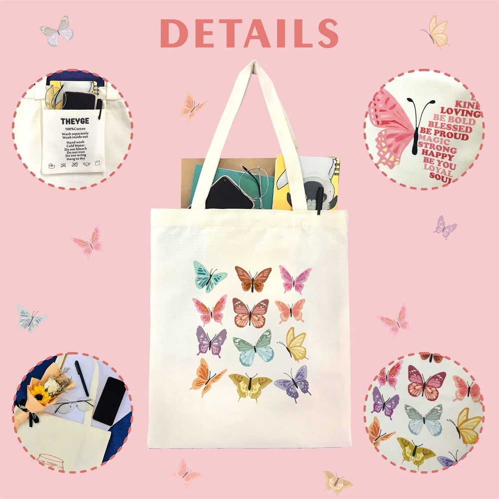 【Exquisite Gift】: The recommended minimum age of use shall be above 6 years old, which is the perfect gift for women, teen girls on a special day, appointment, graduation, anniversary, birthday, party, Valentine's Day, Mother's Day, Thanksgiving, Christmas, etc. 【Material】: This cute tote bag is made of high-quality cotton canvas, which is lightweight, durable, reusable, and portable. 【Large Capacity 】: This reusable grocery bag size : 15" Lx13" W, handle length: 10"L, which has large storage capacity for your daily necessities, such as laptop, iPad, mobile phone, books, magazine, keys, charger, water bottle, pencil, umbrella, wallet, makeup and sunglasses. 【Two-side Design】: Unique different patterns on front and back, it's both fashion and eye-catching, suitable for many occasions, such as daily shopping, party, beach surfing, outdoor picnic, office, school universities, travel. 【Multipurpose 】: It can be used as a casual bag, casual hand bag, daily shopping bag, grocery bag, shoulder bag, tote handbag, school bag, book tote, work bag, beach bag, camping storage bag, travel bag. 【Features】: Two-side Pattern; Large Capacity; Inner Pocket; Long Handle; Lightweight; Reusable; Portable; Durable; Practical.