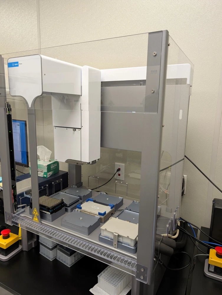 The Agilent Bravo Automated Liquid Handler 96LT includes a Keyence Light Curtain, Chiller, and Comp. It is designed for use in Biological Laboratories. This comes with everything pictured, we also have boxes of agilent brand tips as well if interested.