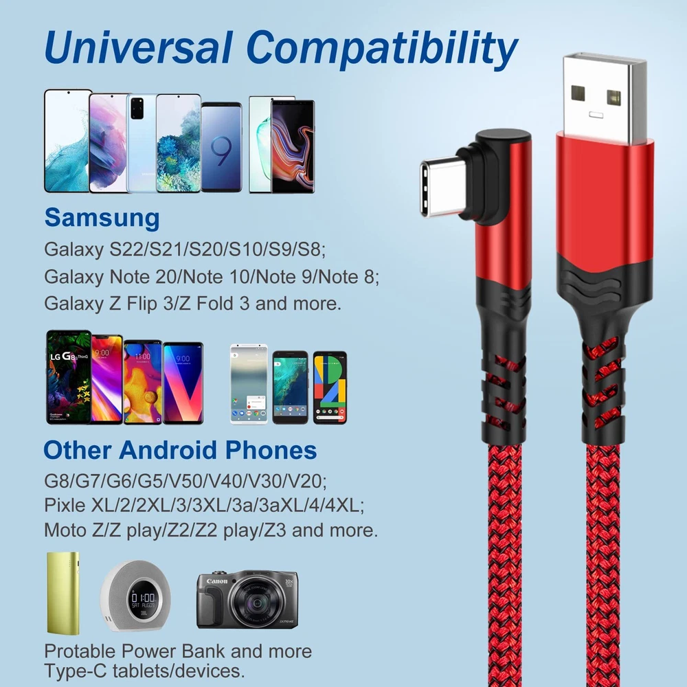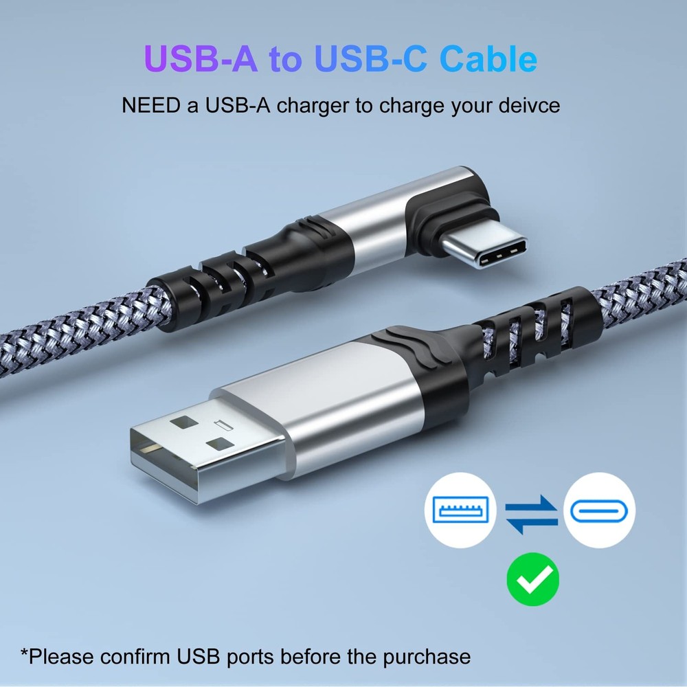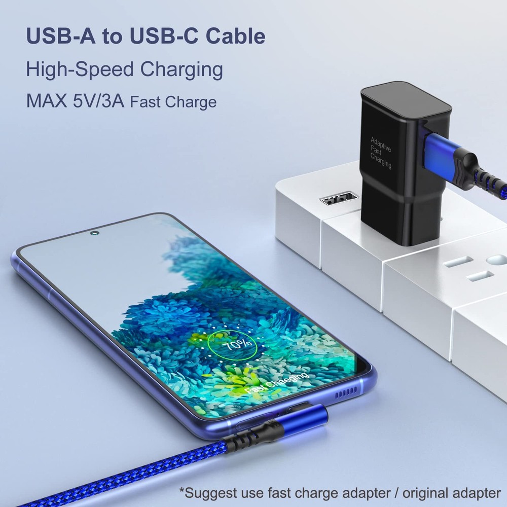 Agtray USB C Cable 10Ft, 4-Pack Long Braided USB-A to USB-C 90 Degree Plug Type C Right Angle Fast Charging Cord Compatible for Samsung Galaxy S23 S22 S21 Note 20 10, Pixel 7 7A (Black Grey Red Blue) ▷【Long Right Angle USB C Cable】- The USB-C 90 degree connector design is convenient to play games or watch videos while charging, reduce bending and prolong the service life of USB C cable. 10 feet extra-long length can let you play phones freely while charging, you can lie on the couch/bed or use in the car. *NOTE: Do NOT fit for thick phone case, allowed thickness of phone case is 0.05 inch. ▷【USB-C Broad Compatibility】- Works with USB-C port devices. Compatible for Samsung Galaxy S23/S22/S21/S20/S10/S9/S8, Galaxy Z Flip 3/Z Fold 3, Note 20/Note 10/Note 9/Note 8, Galaxy A51/A50s/A70/A70s/A71/A80/A90; LG G5/G6/G7/V20/V30/V40/V50, Stylo 4/5; Pixel 7/6/5/4/3/3a/2 XL, Moto Z/Z play/Z2/Z2 play/Z3; Also compatible with iPad Pro/iPad Air 5 4/iPad mini 6, Switch and more USB Type-C tablets/devices. ▷【Fast Charging Type C Cord】- This USB-A to USB-C cable supports safe and high-speed charging at up to 3A/60W max, much faster than normal cables. Data transfer speed of USB 2.0 port up to 480mb/s, can transfer large files like HD photos or movies quickly. *NOTE: Charging with a Fast Charge Adapter or Original Adapter is recommended. ▷【Durable & Reliable Cable】- Premium nylon braided threading around the cable so that adds additional durability and tangle-free. Metal end and strengthen tail of connectors are of decent quality with a 10000+ bend tested, no easy to break and crack. ▷【What You Get】- 4 pack 10 feet braided USB-A to USB-C 90 degree angle cables, our friendly customer support. If you have any concerns about our product please tell us directly via Amazon. ▷【Long Right Angle USB C Cable】- The USB-C 90 degree connector design is convenient to play games or watch videos while charging, reduce bending and prolong the service life of USB C cable. 10 feet extra-long length can let you play phones freely while charging, you can lie on the couch/bed or use in the car. *NOTE: Do NOT fit for thick phone case, allowed thickness of phone case is 0.05 inch. ▷【USB-C Broad Compatibility】- Works with USB-C port devices. Compatible for Samsung Galaxy S23/S22/S21/S20/S10/S9/S8, Galaxy Z Flip 3/Z Fold 3, Note 20/Note 10/Note 9/Note 8, Galaxy A51/A50s/A70/A70s/A71/A80/A90; LG G5/G6/G7/V20/V30/V40/V50, Stylo 4/5; Pixel 7/6/5/4/3/3a/2 XL, Moto Z/Z play/Z2/Z2 play/Z3; Also compatible with iPad Pro/iPad Air 5 4/iPad mini 6, Switch and more USB Type-C tablets/devices. ▷【Fast Charging Type C Cord】- This USB-A to USB-C cable supports safe and high-speed charging at up to 3A/60W max, much faster than normal cables. Data transfer speed of USB 2.0 port up to 480mb/s, can transfer large files like HD photos or movies quickly. *NOTE: Charging with a Fast Charge Adapter or Original Adapter is recommended. ▷【Durable & Reliable Cable】- Premium nylon braided threading around the cable so that adds additional durability and tangle-free. Metal end and strengthen tail of connectors are of decent quality with a 10000+ bend tested, no easy to break and crack. ▷【What You Get】- 4 pack 10 feet braided USB-A to USB-C 90 degree angle cables, our friendly customer support. If you have any concerns about our product please tell us directly via Amazon. Shipping from the USA All of our products are shipped from the USA, ensuring quick delivery to your destination. Payment We offer the following payment methods: PayPal, credit card, bank transfer, and eBay's secure payment system. Free Shipping & Free Returns Shipping within the USA is FREE. Additionally, any return is absolutely free for you. Risk-Free Purchase You have the option to return an item within 30 days without any justification. We cover the return shipping costs! Fast Shipping We ship immediately upon receipt of payment. Generally, the package is delivered within 2-3 days in the USA. If it takes longer, we will contact you. Quality and Costs Made in Europe, USA, China No customs fees or additional charges Total satisfaction guarantee Invoice with declared VAT available upon request in .pdf format Feedback Your feedback is very important to us. After you pay for your purchase, you will automatically receive positive feedback from us.