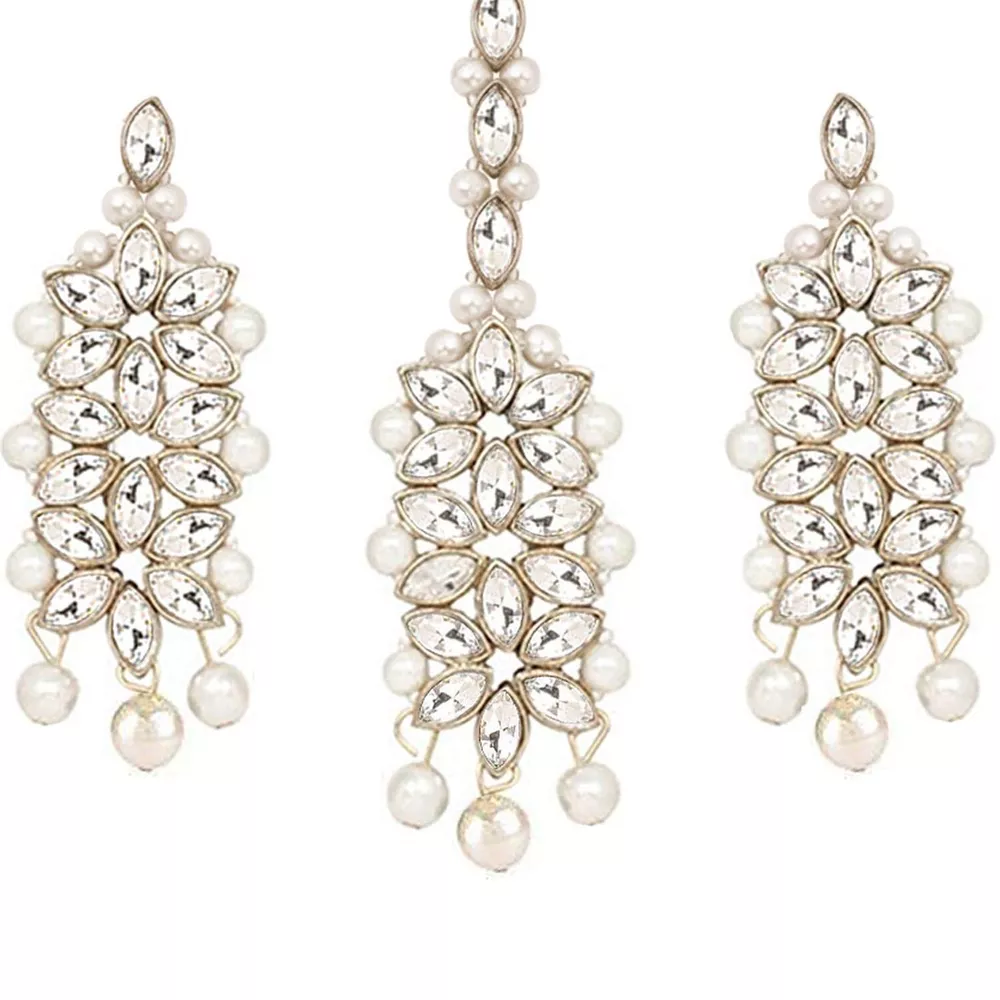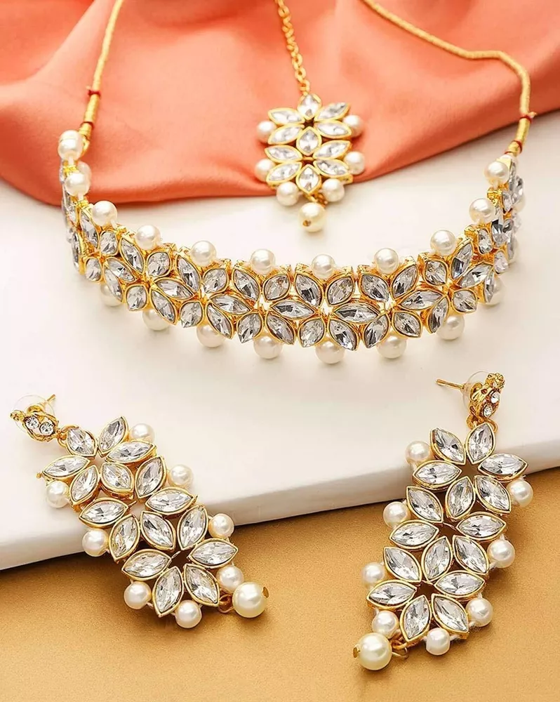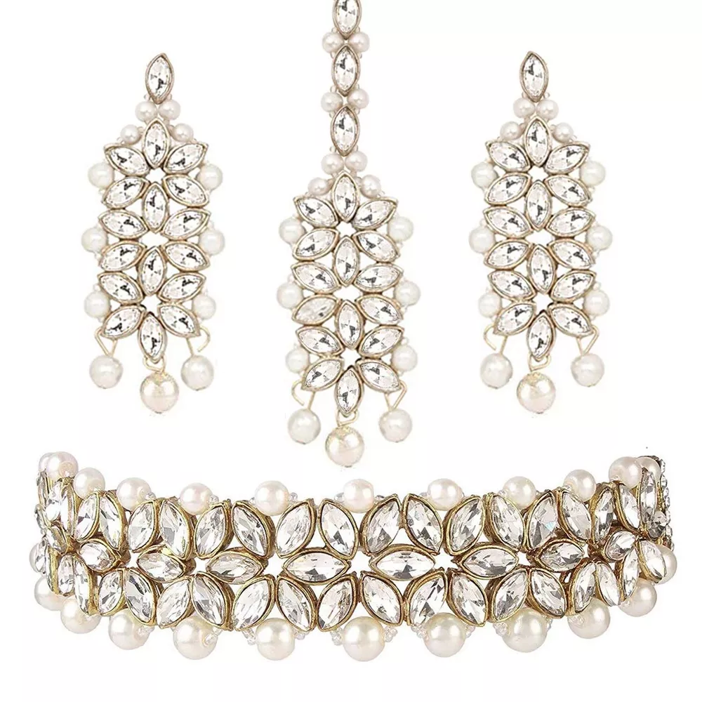 Aheli Gold Plated Kundan Jewelry Necklace with Earring Set Gift for Women Product Details Color: White Brand: Aheli MPN: AH-PF25BRC105W UPC: Does not apply EAN: Does not apply Department : womens Date First Available : October 22, 2020 Brand, Seller, or Collection Name: Aheli Metal stamp: Not stamped Metal: No Metal Type Material: Zinc Gem Type: No Gemstone Item Length: 7.87 inches Clasp: Lobster Clasp Ring size: adjustable Model number: AH-PF25BRC105W