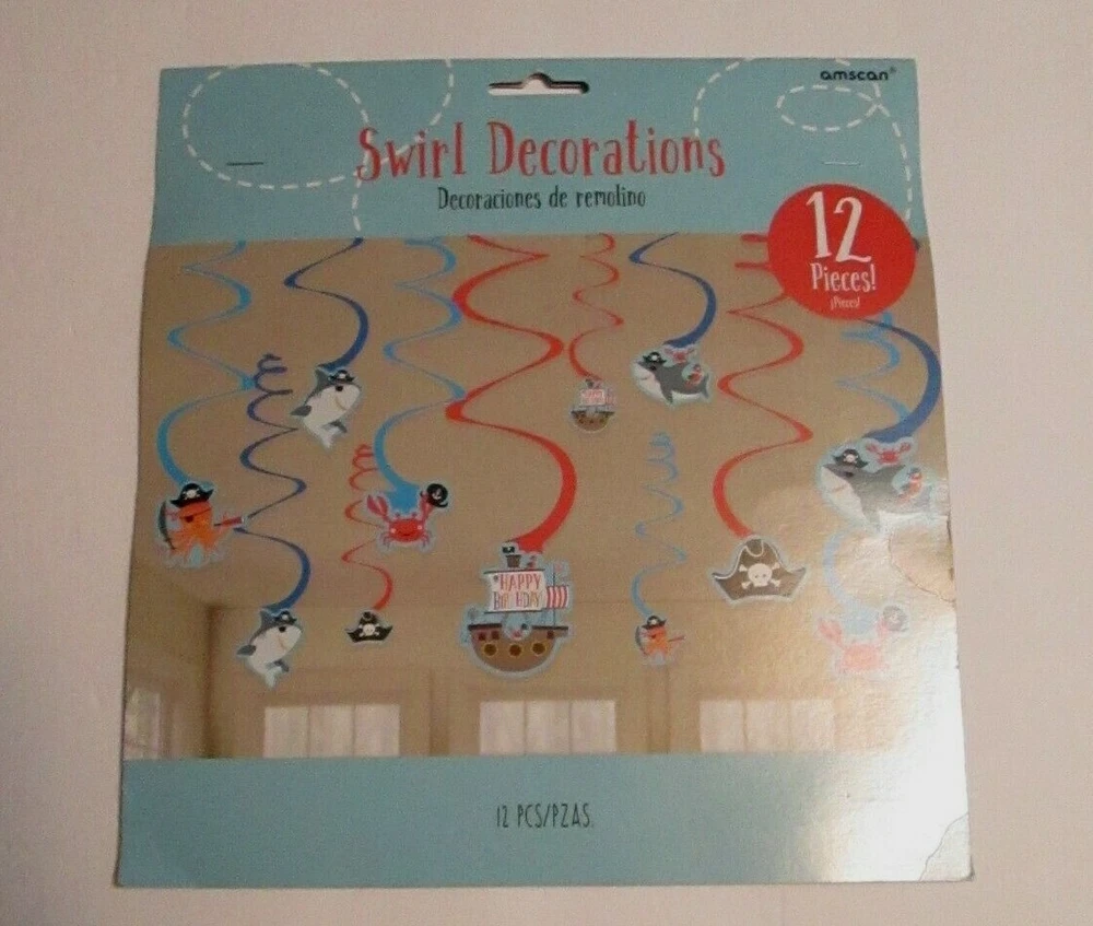 Ahoy Nautical Pirate Birthday Party Table Decorating Kit 11 Piece Includes : 1 Large Wave Centerpiece 10 smaller Table Décor Pieces Sharks, Crabs, Ship, Octopus & Treasure Chest! Plus Bonus Matching 12 Piece Kit As A Gift! 12 Matching Swirl Decorations Additional Swirl Kits Sold Separately See Photos