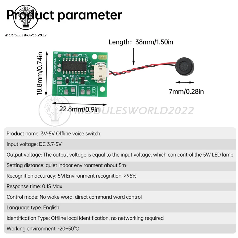 Store Categories Store Categories Other Product View Details Features 1. 3.7V-5V working voltage universal: support 3.7V to 5V working voltage, compatible with a variety of power supply devices, whether lithium batteries or USB power supply, can work stably, applicable to a wide range. 2. monochrome light switch and brightness control: users can easily control the switch and brightness adjustment of monochrome LED lights through voice commands to achieve intelligent management of lights. 3. Recognition distance of about 5 metres: the module has excellent long-distance recognition ability, the effective recognition distance of about 5 metres, even in a large room can accurately receive voice commands, to ensure that the user experience is smooth. 4. Recognition accuracy >95%: with advanced voice recognition technology, the recognition accuracy is up to 95% or more, almost no misuse, users can use it with peace of mind and enjoy the convenience of smart life. 5. with power reverse protection: built-in power reverse protection function, even if the power polarity is accidentally reversed, it will not damage the module, effectively extend the service life and ensure the safety and reliability of the device. Specification Input voltage: DC 3.7-5V Output voltage: output voltage is equal to the input voltage, can control 5W LED lights Distance: about 5m in a quiet indoor environment. Recognition accuracy: 5M environment recognition degree: >95 Response time: the fastest 0.1S Control mode: no wake-up word, direct command word control Language type: English Recognition type: offline local recognition, without networking Working environment: -20~50℃ Product size: 22*18*3mm Package Includes 1 x Module Shipping Policy Payment Method Returns Policy Shipping Policy Payment Method Returns Policy Home Payment Shipping About us Contact us Copyright©2018 datacaciques Home Payment Shipping About us Contact us Store Categories Store Categories Other Product View Details Features 1. 3.7V-5V working voltage universal: support 3.7V to 5V working voltage, compatible with a variety of power supply devices, whether lithium batteries or USB power supply, can work stably, applicable to a wide range. 2. monochrome light switch and brightness control: users can easily control the switch and brightness adjustment of monochrome LED lights through voice commands to achieve intelligent management of lights. 3. Recognition distance of about 5 metres: the module has excellent long-distance recognition ability, the effective recognition distance of about 5 metres, even in a large room can accurately receive voice commands, to ensure that the user experience is smooth. 4. Recognition accuracy >95%: with advanced voice recognition technology, the recognition accuracy is up to 95% or more, almost no misuse, users can use it with peace of mind and enjoy the convenience of smart life. 5. with power reverse protection: built-in power reverse protection function, even if the power polarity is accidentally reversed, it will not damage the module, effectively extend the service life and ensure the safety and reliability of the device. Specification Input voltage: DC 3.7-5V Output voltage: output voltage is equal to the input voltage, can control 5W LED lights Distance: about 5m in a quiet indoor environment. Recognition accuracy: 5M environment recognition degree: >95 Response time: the fastest 0.1S Control mode: no wake-up word, direct command word control Language type: English Recognition type: offline local recognition, without networking Working environment: -20~50℃ Product size: 22*18*3mm Package Includes 1 x Module Shipping Policy Payment Method Returns Policy Shipping Policy We will arrange shipping for you within 24 Hours after payment cleared except the holidays. -We ship items to Worldwide. Thank you! -we will ship out the order in 1-2 business days after payment cleared .Since it is international shipping ,delivery time is about 15--28 business days to arrive to most countries. Payment Method We accept PayPal payment ONLY, and must be received within 5 days from the date of purchase. 2. It is easy and safe for you to pay by credit cards, debit cards, bank transfers and PayPal account balances. 3.Buyers are responsible for import duties,custom fees and taxes, if any, please check your country. Returns Policy 1.We believe our items are so outstanding. We are convinced you will be happy with your Purchase. 2. If you do not satisfy with our items. Please simply return to us within 30 Days in original condition. Just pay for the returned postage. Then we can issue full refund or resend the item to you after the returned item arrived at our warehouse. 3. Please include your eBay ID and item number with any email requests.