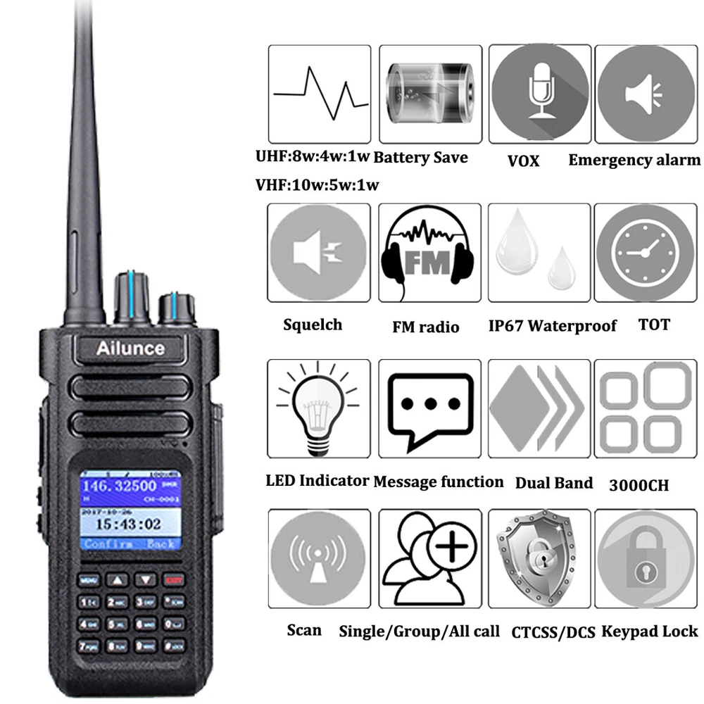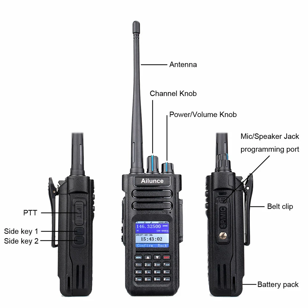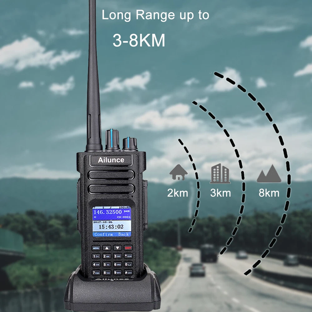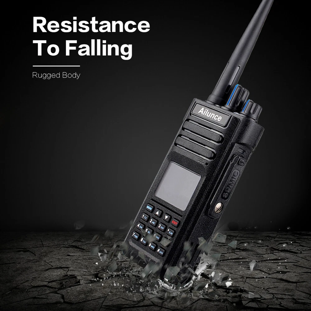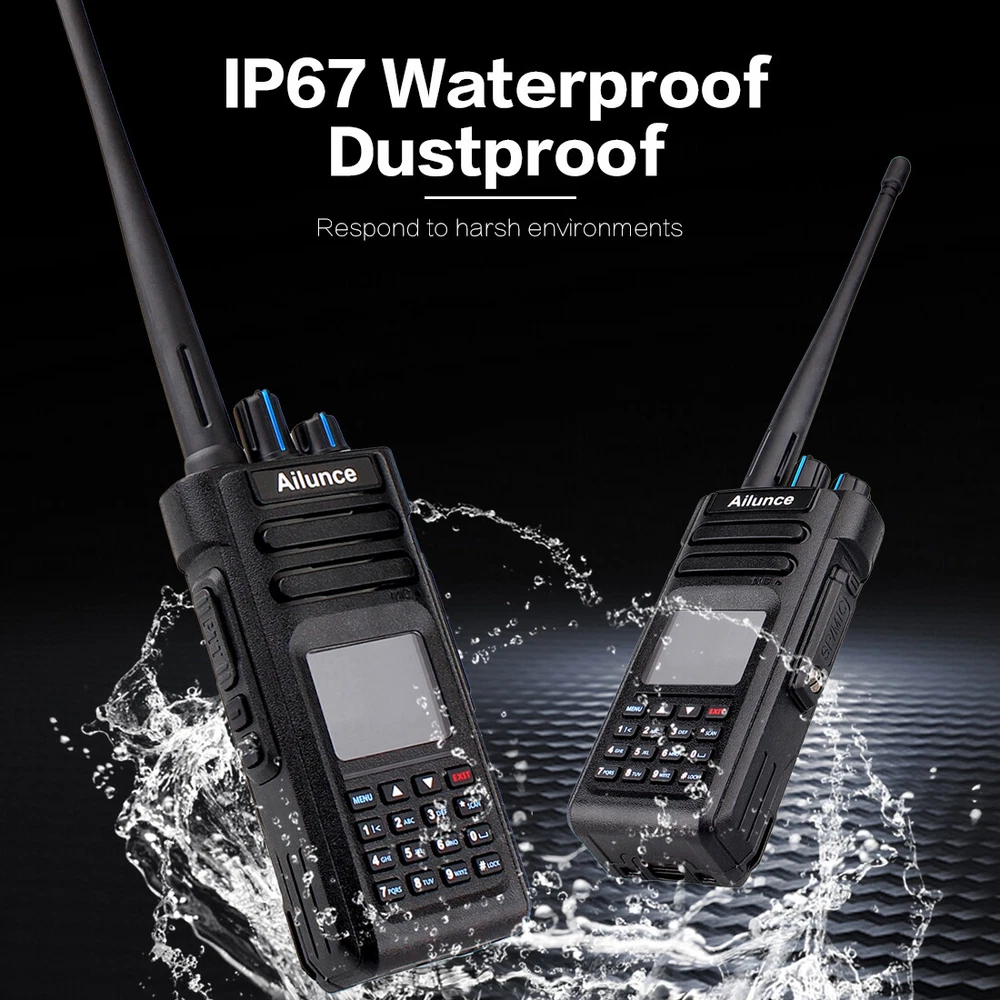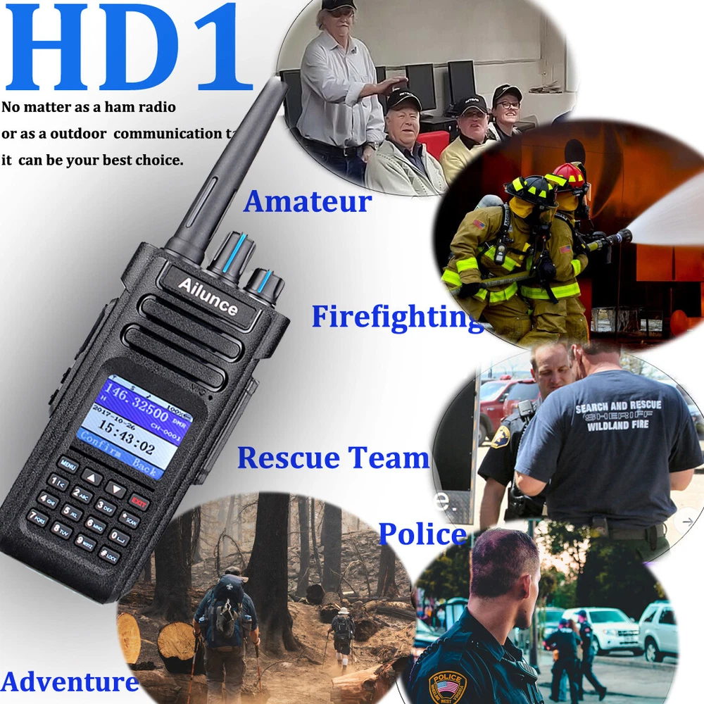 General specifications Frequency 136-174&400-480MHz &76-107.95MHz(Receive only ) Channels 3000 Operating Temperature -30℃~+60℃ Operating Voltage 7.4V DC Dimension 150 x 64x 40mm Weight 360g(with battery) Battery Type Li-ion Battery Capacity 3200mAh Antenna Impedance 50Ω Transmitter Power UHF:8w:4w:1w VHF:10w:5w:1w Transmit current Analog≤1.6A Digital≤0.9A Frequency Stability ±1.0ppm FM modulation mode 12.5KHz@11K0F3E 25KHz@16K0F3E 4FSK digital mode 12.5KHz(data only):7K60FXD 12.5KHz(data and voice):7K60FXW Modulation distortion <5% Vocoder AMBE+2TM Adjacent channel power 60dBm@12.5KHz 65dBm@25KHz Audio Response +1~-3dB Digital Protocol ETSI-TS102 361-1,-2,-3 Receiver Analog Sensibility 0.35uV/-116dBm(20dB SINDA) 0.22uV/-120dBm(Type) Digital Sensibility 0.30uV/-117dBm(BER 5%) 0.70uV/-110dBm(BER 1%) Adjacent Channel Selectivity TIA603C:65dB ETSI:60dB Spurious Response TIA603C:75dB ETSI:70dB Audio Response +1~-3dB Rated Audio Distortion ≤3%(Type) Audio Power ≥500mW Package Includes: 1 x HD1 two way radio 1 x Battery 1 x Antenna 1 x Charger 1 x User’s manual 1 x Belt clip 1x Mic 1 x Sling LCD operation The LCD display and backlit full numeric keypad, the display information can be seen at a glance and easy to operate even in bright light.Almost all functions can be operate by keypad, extremely easy to learn and save your time. SMS function/message The product supports DMR data functions and allows sending and receiving messages; the maximum length of each message is 144 characters and less than 50 lines. Long rechargeable battery life Digital technology is more energy efficient than analog’s, allows communicate quickly, resolve issues quickly and resolve emergencies,so the HD1 radio reduce battery consumption and shorten talk time. 3200mAh rechargeable battery life can be extended by up to 40%,the standby over 30 hours. Digital-analog compatible, smooth switching Supports both digital and analog modes, compatible with existing analog systems, users can gradually switch analog terminal settings according to budget and actual communication needs. Digital broadcasting has many advantages over analog’s, including higher voice quality,high power, long distance, longer battery life, and more. Main Feature: FM and DW Fucntion when a call comes, radio can automatically get the signal and stop the FM radio. Once the call was finished, it will switch to FM mode So no call will be missed. Waterproof and dustproof 100% IP67 waterproof DMR radio with a sturdy and durable body ensure work well even in harsh outdoor environments such as sand, rain, and snow, and avoid poor communication due to environmental problems. Promiscuous function Ailunce HD1 has the promiscuous function when you choose 'On', It will make you listen all the signal, even if you are not in the same group. About us