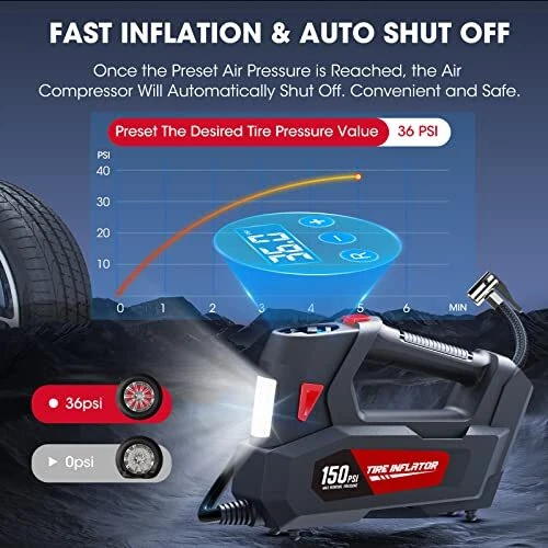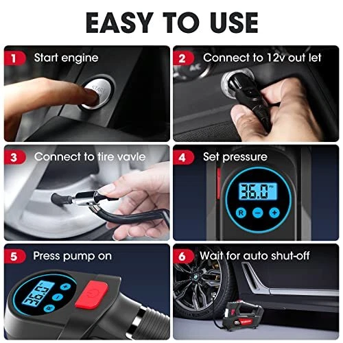 Return Policy Fast Delivery Trusted seller Air Compressor Tire Inflator Portable Air Pump DC 12V Auto Tire Pump with Digital Pressure Gauge,150PSI with Emergency LED Light for Car Tires, Motorcycle, Bicycle and Other Inflatables Product Description FAST INFLATING SPEED & EASY TO USE:Simply plug it into the 12V power outlet in your car and attach the hose to the tire you wish to inflate. You can just flip the switch and the car air compressor will do all the work for you.The maximum pressure of car tyre pump is 150PSI and the air flow is 35L/min. It can inflate the 195/65/R15 car tire from 0 to 35psi under 5 minutes.It is more efficient and faster than traditional pumps. (Note: not suitable for truck tires) LED LIGHTING FOR NIGHT TIME:To be a proper solution for night time inflating job, the electric air pump comes with a SUPER LED-lighting(Contains 16 LAMP Beads)feature to support your inflating needs in low-light environment. Coupled with the 10ft power cord, both of the front and the rear tires will be fully taken care of with less efforts as it eliminates the unnecessary hassles of unplugging the appliance every time you switch from one tire to the other. PROGRAMMABLE INFLATION:Use the "R" button to change pressure units among PSI, KPA, BAR and kg/cm², and then press the "+" and "-" buttons to set the desired pressure. The air compressor will automatically shut off when it reaches the pre-set pressure (Please make sure the pressure you set is higher than the current pressure of your tire). MULTI-PURPOSE:The portable air compressor pump is equipped with different air nozzles adapters. American air nozzle can use for car tires, motorcycle, bike. French air nozzle adapters can use for some mountain bikes. Air needles can use for basketball, football, and rugby. The small air nozzle can use for the balloon, Swimming laps, and family party inflatable decoration, or outdoor travel air mattress. BUY WITH CONFIDENCE:Gifts for men women. Easily stow the compressor away in your car or garage and it will be ready to use at a moment’s notice. Package includes 1* digital air compressor, 1*Storage Bag, 1* Replacement Fuse, 1*Air Nozzle Cone, 1* Ball inflation Needle, 1* Presta to Schrader Adapter, 1* User Manual; If you have any questions or concerns, please feel free to contact us. Shipping Returns Payment Shipping Shipping is FREE to all addresses other than APO/PO boxes in the lower 48 states. All our stock ships from US-based warehouses. Shipped via USPS or UPS (depending on location and package weight) Unless stated otherwise, all orders will ship within 24-72 hours of your payment being processed. Check our feedback to see the great reviews of FAST shipping we offer. Returns Seller does not accept returns Payment We currently accept payment via eBay managed payments only. Once payment is cleared, we will dispatch your shipment within 1-3 business days. Please refer to the "Shipping" tab for more information regarding shipping speed to your destination.