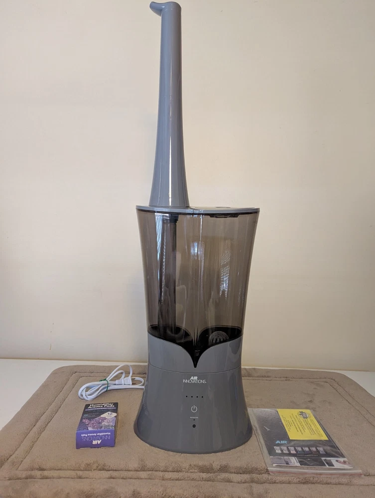 Air Innovations Clean Mist Top-fill Sensatouch humidifier and Aroma tray MH-903XL used no remote tested.and working properly. Pictures showing it operating and also when it senses no water in reservoir (pictures 2 and 3). Despite having no remote you can touch the sensor to manually adjust the speed. I used it once and then moved and have no use for it in my new home. Including in the purchase is the box of 11 lavender essential oil aroma therapy inserts-used 1. It can be used on the tabletop or floor and will run without needing to be refilled for up to 15 days on the low setting since the tank holds 2 gallons per manufacturer. The notch at the bottom of the wand is where it inserts into the cannister and is not a chip or damage (picture 16 and 17). Well cared for . I would also encourage you to use distilled or filtered water since manufacturer says this will prevent hard water staining. Includes the instruction manual as well. Packaged with care. Questions, please don't hesitate to ask. Thank you.