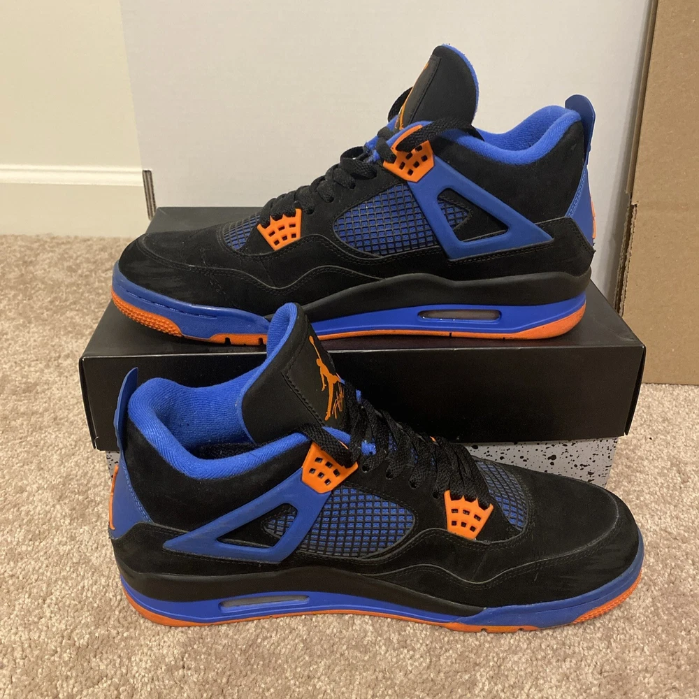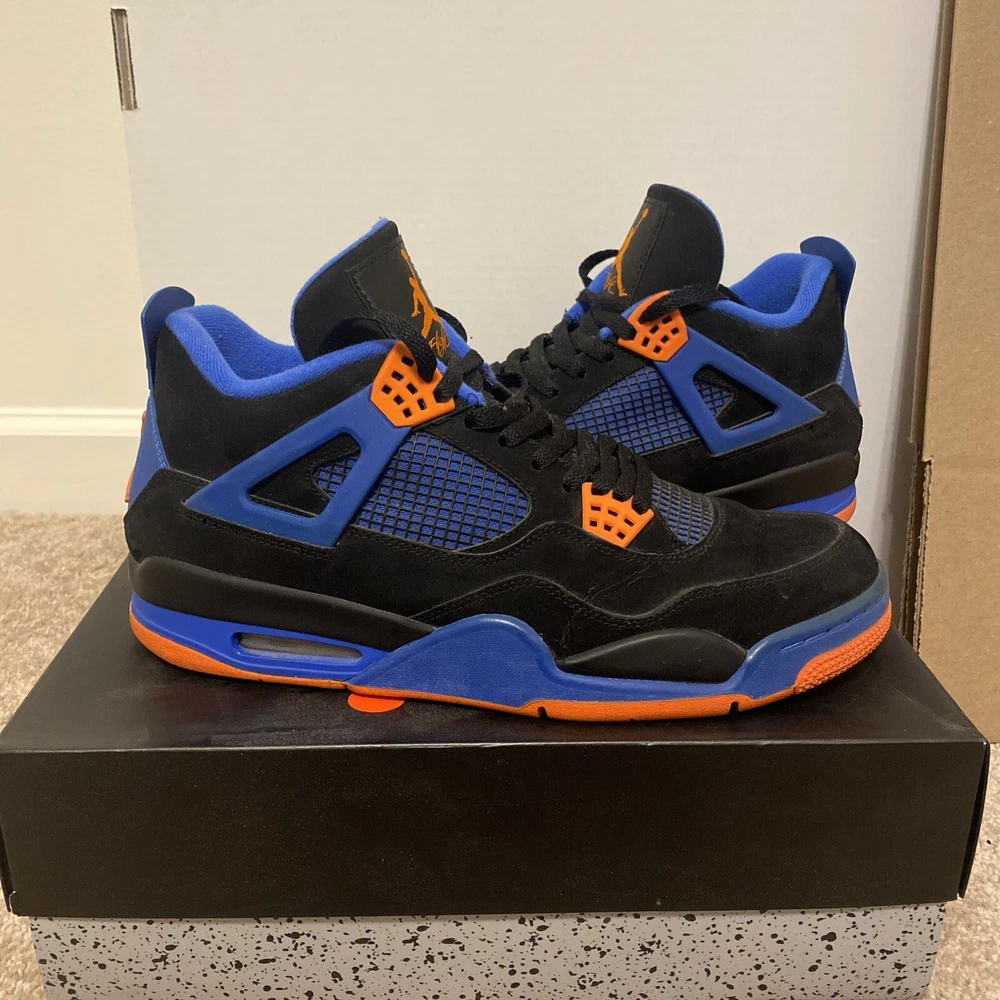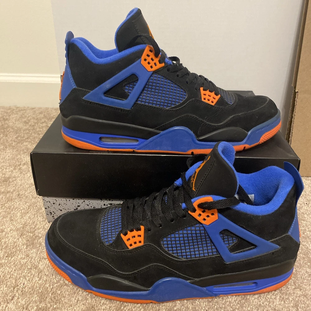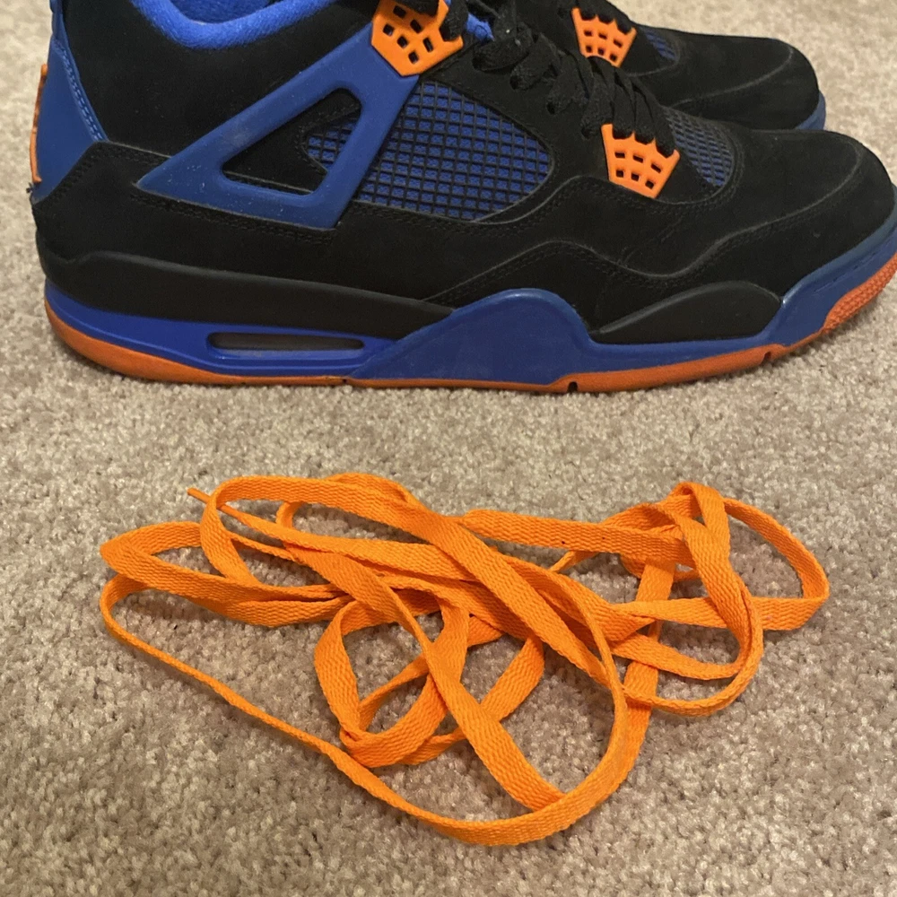 Selling my used size 12 cavs. Signs of wear include toe box creasing/scuffs, marks on midsole & outsole. Still in good condition & wearable. Extra orange laces included ——— Elevate your sneaker game with these Air Jordan 4 Retro Cavs. These stylish sneakers come in a classic black colorway with accents of safety orange and game royal. The nubuck upper material gives them a luxurious feel and the Cavs nickname adds a touch of personality. These sneakers are perfect for any athletic occasion and are sure to turn heads with their sleek design. The size 12 fit is ideal for men and the Air Jordan product line guarantees quality and style. Don't miss out on the chance to add these must-have sneakers to your collection.