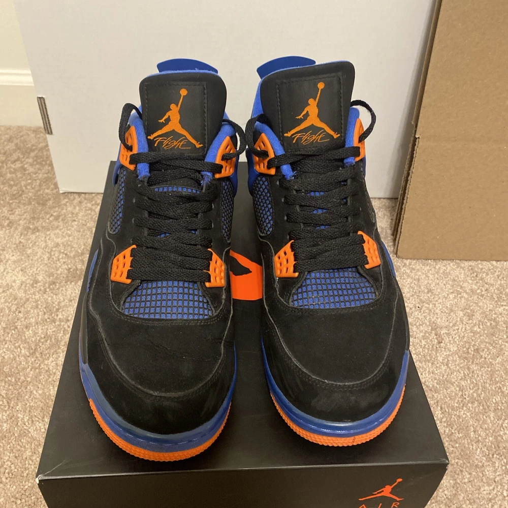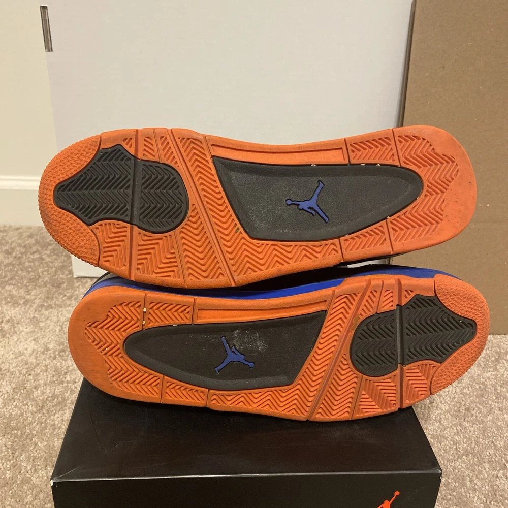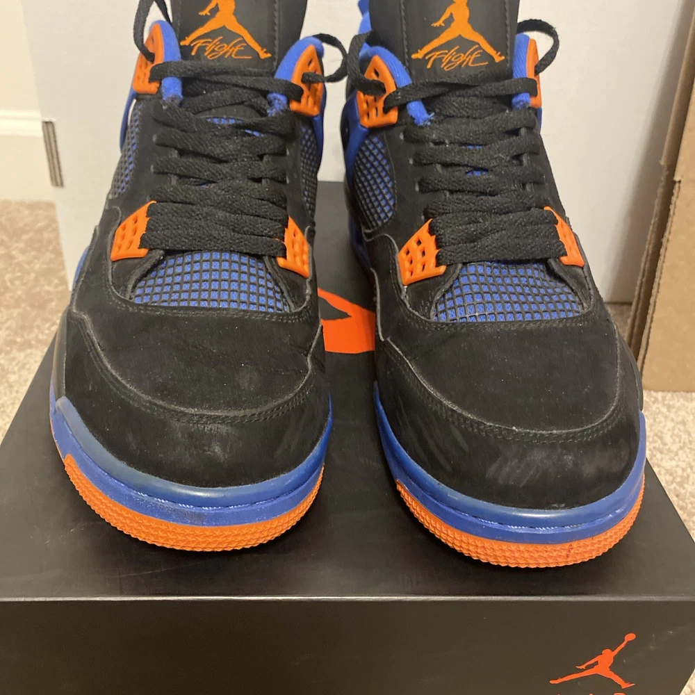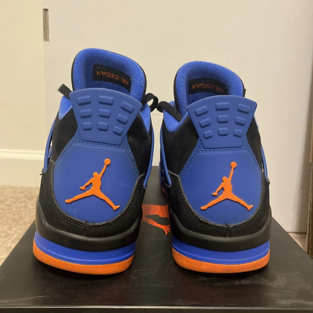 Selling my used size 12 cavs. Signs of wear include toe box creasing/scuffs, marks on midsole & outsole. Still in good condition & wearable. Extra orange laces included ——— Elevate your sneaker game with these Air Jordan 4 Retro Cavs. These stylish sneakers come in a classic black colorway with accents of safety orange and game royal. The nubuck upper material gives them a luxurious feel and the Cavs nickname adds a touch of personality. These sneakers are perfect for any athletic occasion and are sure to turn heads with their sleek design. The size 12 fit is ideal for men and the Air Jordan product line guarantees quality and style. Don't miss out on the chance to add these must-have sneakers to your collection.