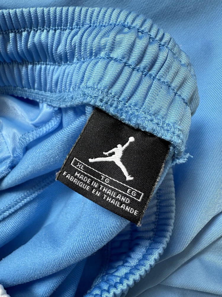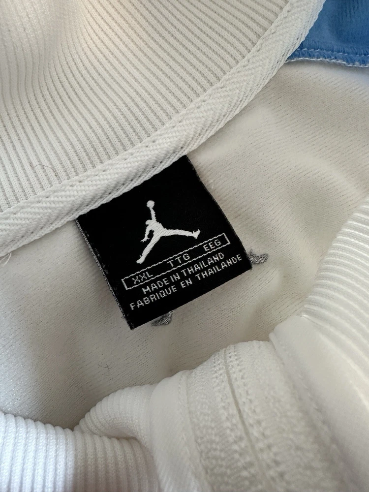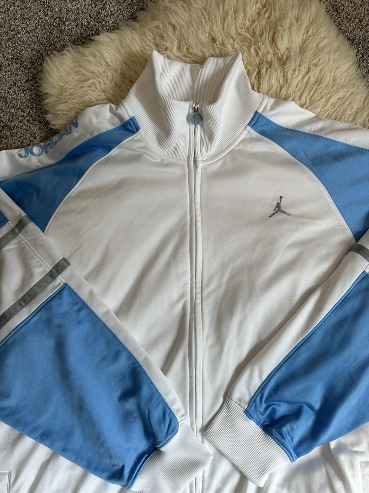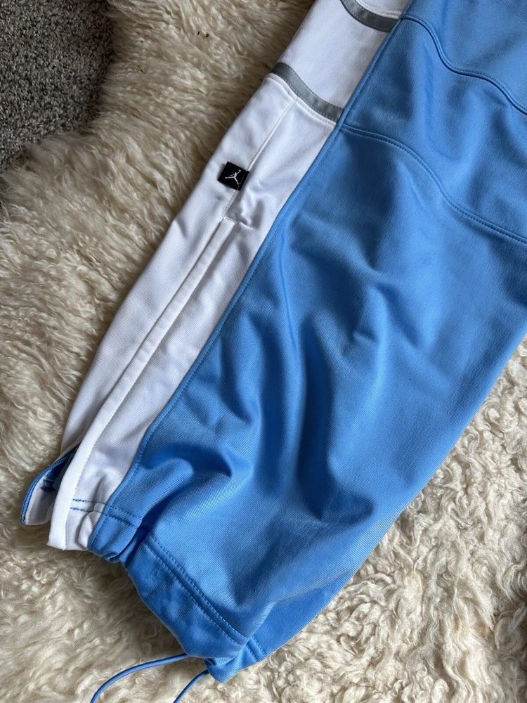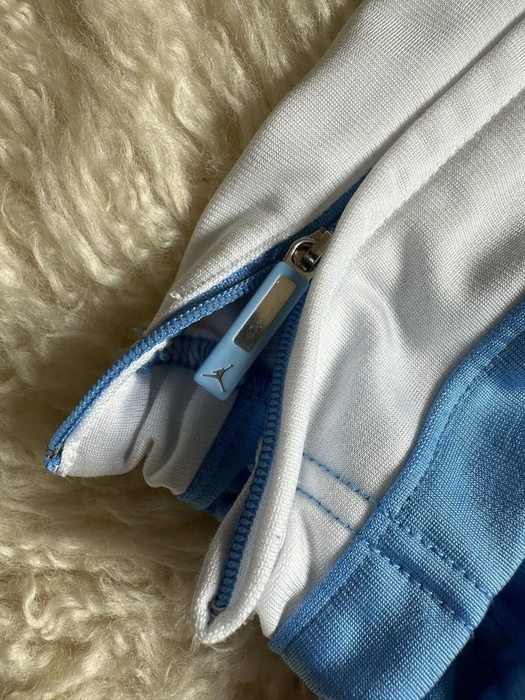 Air Jordan Jumpman North Carolina Michael Jordan Tar Heels Blue White Basketball Track Suit Jacket Pants Excellent condition Size XL Snap hip and rear pockets Zip and drawstring ankle cuffs Full zip jacket with raglan sleeves and snap hip pockets Baby blue and white North Carolina colors