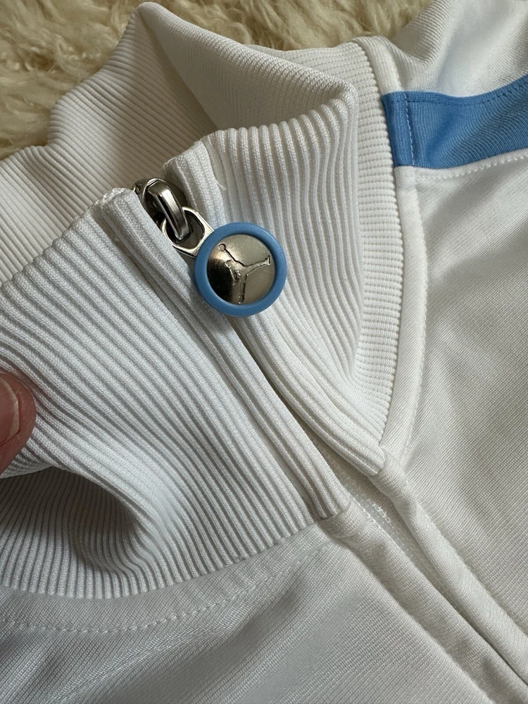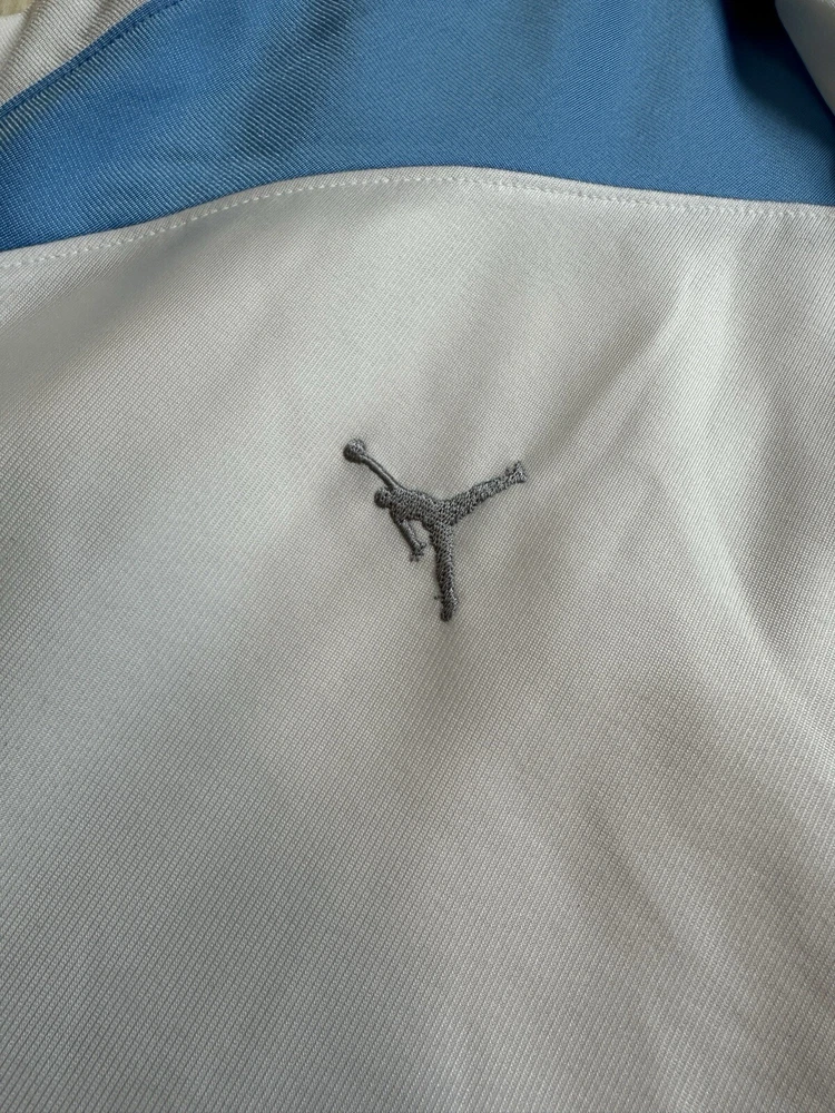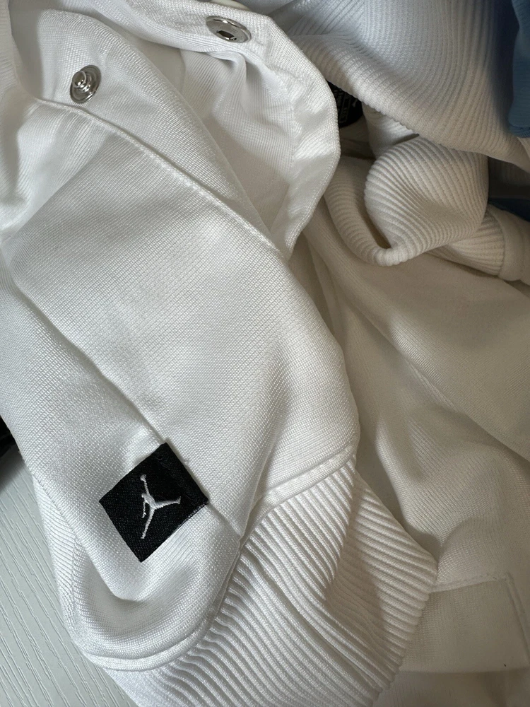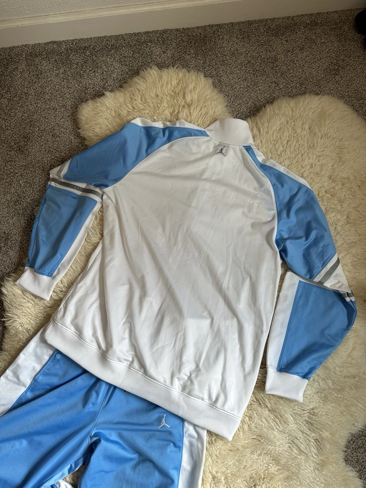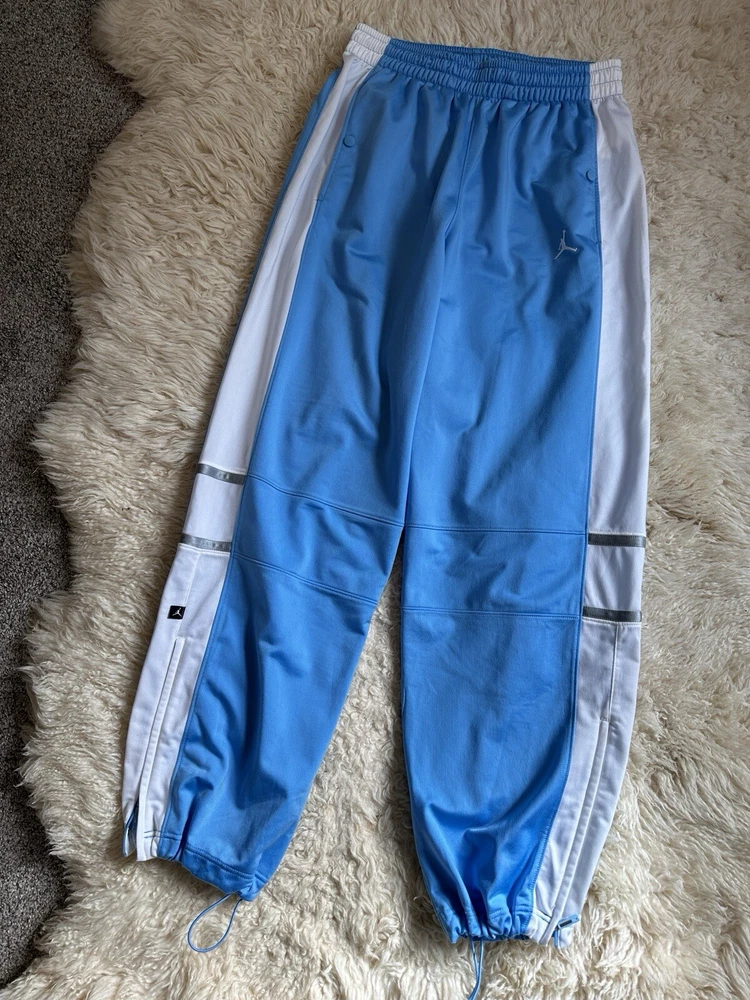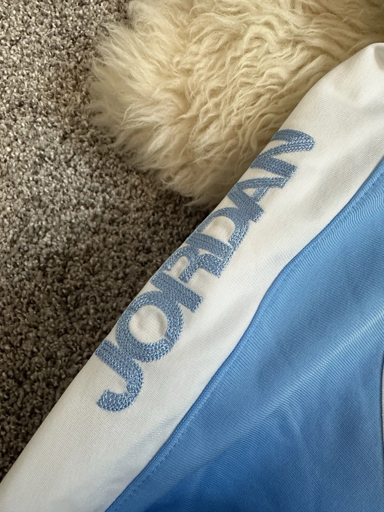 Air Jordan Jumpman North Carolina Michael Jordan Tar Heels Blue White Basketball Track Suit Jacket Pants Excellent condition Size XL Snap hip and rear pockets Zip and drawstring ankle cuffs Full zip jacket with raglan sleeves and snap hip pockets Baby blue and white North Carolina colors