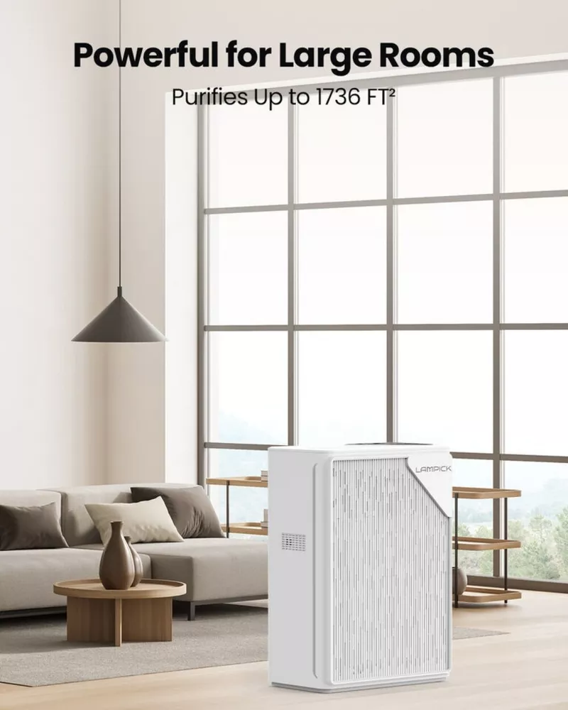 About this item [High Efficiency Air Purifier] The air purifiers for bedroom that covers up to 1736 feet within 1 hour. The home air purifiers have a powerful 4-stage filtration system that can efficiently capture 99.97% of air particles from all around as small as 0.3 microns. Turn on the high-efficiency air purifier large room to enjoy a new and comfortable air environment all the. [Original Patent: Unique Room Air Purifier Air Inlet Design] When turning on the HEPA air purifiers for home, the meteor shower light will turn on like an aurora, purifying the air while bringing the aesthetic enjoyment. 2 choosable light moods: light and strong. To ensure the light effect please keep the label down when place the air filter in. [Fragrance Sponge] The top of the large room air purifier is equipped with an essential oil cotton pad. Add the essential oil to enjoy fresh and fragrant air. [PM2.5 Detector] The built-in PM2.5 detector works while the air purifier for bedroom turns on, monitoring the real air quality. The larger the value, the worse the air quality, while the smaller the better. Please note that the PM2.5 value is for reference only and is not authoritative. [Ultra-Quiet Sleep Mode] The air purifiers for pets work at sleep mode at 15dB, which is ultra quiet. Enjoy a comfortable and soft environment when sleeping. All keys' light will turn off, while the meteor shower light should be turned off manually. [Filter Replacement Reminder] The air cleaner large room is equipped with a filter replacement reminder, guaranteeing to enjoy fresh air all the. When the filter reaches the end of the life, the reminder will turn red and flash. After replacing the filter, please press and hold the reminder button for 3-5 second, and the filter reminder will be reset. To ensure the purification effect of the HEPA filter air purifiers, please use official "LAMPICK" filter elements. [5 Timer Setting] The pet air purifier is designed with an adjustable timer for 2/4/6/8/12 hours. Set the usage flexibly and refresh the air at regular intervals. [3 Fan Speeds] The bedroom air purifier offers three choosable gears of air flow from Ⅰ, Ⅱ to Ⅲ. When the office air purifier works at the auto mode, the machine will automatically select the appropriate based on the air quality detected by the sensor. [Child Lock] Press the "Lock" button to lock the current setting of the smart air purifier at any to prevent children or pets from accidentally touching the buttons. Color White Brand LAMPICK Product Dimensions 12"D x 16"W x 6"H Floor Area 1736 Feet Specification Met FCC Certified, ETL Certified, CARB Certified Power Source ac Item Weight 8 Pounds Control Method Filter Type HEPA Air Purifier x1 HEPA Filter x 1 User Manual x1
