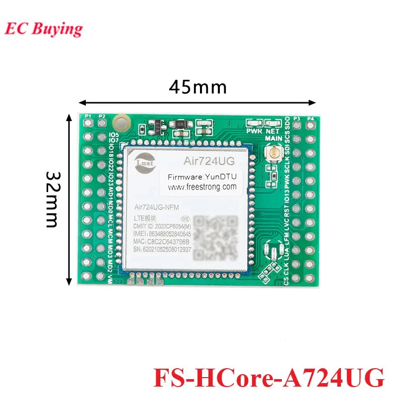 FS-MCore-A724UG Product description: FS-MCore-A724UG(AT)Is based on the universe 4G Cat.1 Communication module Air724UG A communication module designed with good stability, high cost performance, ultra- small package and low power consumption. The module has been equipped with a good peripheral circuit, using7PIN Pluggable design, can be directly connected with MCU Communication shortens the development cycle, saves R&D costs, and facilitates customer evaluation and testing or direct batch application.Product specifications. FS-HCore-A724UG Product description: FS‑HCore‑A724UG(AT)Is based on the universe 4G Cat.1 Communication module Air724UG A communication module designed with good stability, high cost performance and low power consumption. The module has been equipped with peripheral circuits, which can be directly connected with MCU Communication . The user only needs to pass a simpleAT Command configuration can realize product networking. This product supports TCP, UDP, FTP, HTTP, NTP, MQTT And other communication protocols.