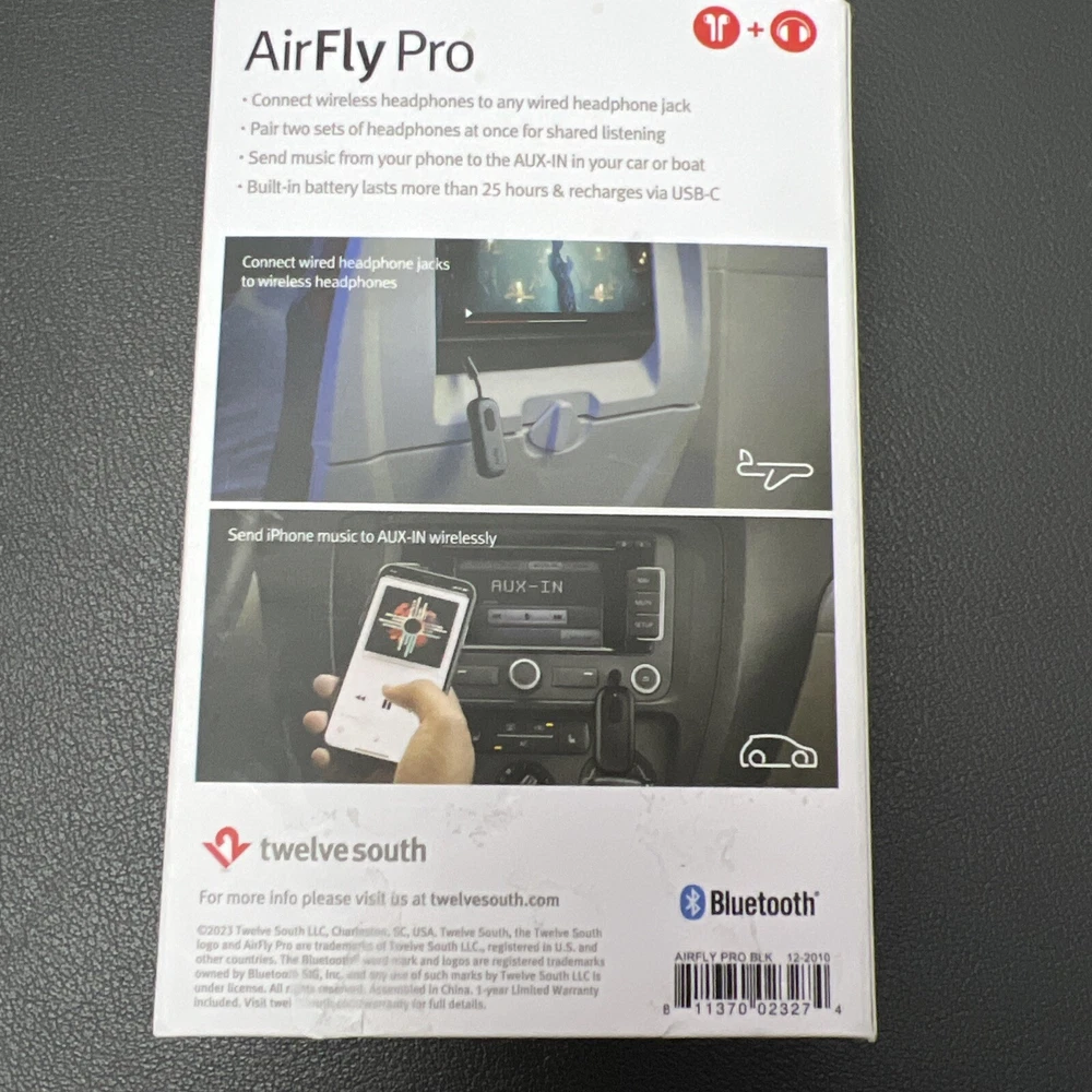 This is an AirFly Pro Bluetooth WiFi Audio Transmitter/Receiver made by Twelve South. It allows you to connect up to 2 AirPods or headphones and transmit audio wirelessly through Bluetooth connectivity. The device is designed to fit audio receivers and is perfect for use with computers, tablets, and other networking devices.