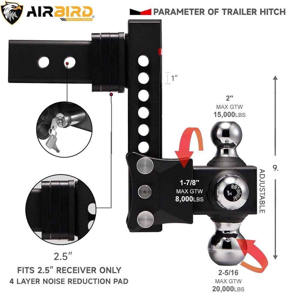 ITEM DESCRIPTION ⚠️ : This is not a brand-new product. However, it offers highly competitive prices. The accessories are complete, but there are some scratches. Material: Steel Ball Size: 1-7/8", 2" and 2-5/16" Adjustable Height: 7" Drop/ Rise Loading capacity: 1-7/8"Ball-8,000 lbs; 2 " Ball-15,000 lbs; 2-5/16" Ball -20,000 lbs Pin Hole Diameter: 5/8" Compatible with: Vehicles with 2.5-inch Hitch Mounts Package Includes: Adjustable Steel Tailer Shank 3 Balls (1-7/8", 2" & 2-5/16") 1 Anti-theft Pins Locks With 2 Keys 1 Iron Pad And 3 Rubber Pads 2 Pins with R clips 1 Allen Key Wrench