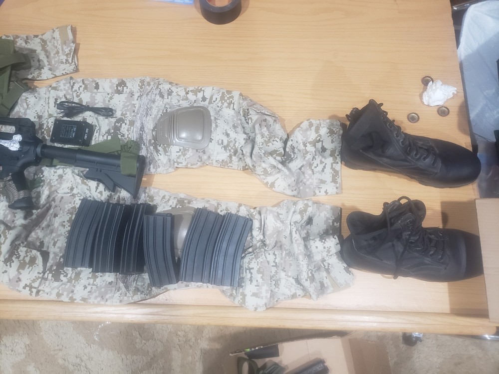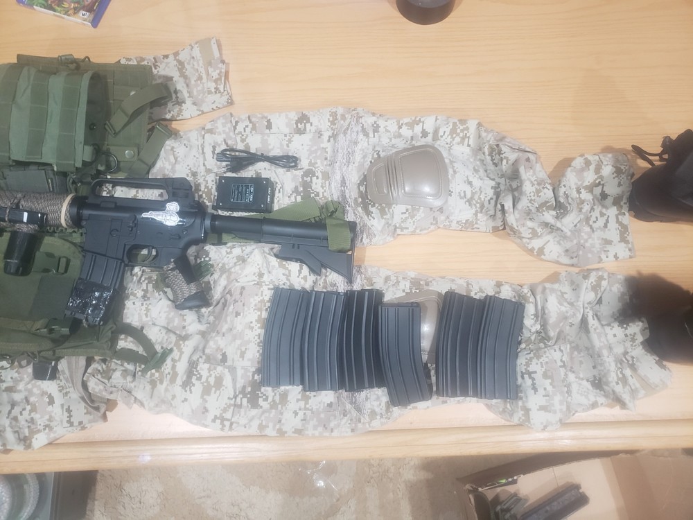 The product is an Airsoft Starter Kit Lot, including a vest, uniform, boots, and an E&C M733 Airsoft Gun as well as a Grenade. The items are all branded with the Airsoft E&C logo. The kit is designed for beginners and features high-quality, authentic components from the United States, China, Japan or Taiwan. The comprehensive set allows users to enjoy the sport of Airsoft with all the necessary gear to enhance their experience and performance on the field. Eyepro can be included in the lot but only if a message is provided prior to purchase. What is included? Digital BDUs, Vest, 7 Mags, 1 Airsoft M733, Battery and Charger, a Pair of Boots. Brands: Gun: E&C Vest: London Bridge Trading Co., LBT-9019A Load Bearing Vest — comes with 3 pouches. BDUs: Knockoff Cryes Methinks Boots: No idea but were $120. Can include eyepro if asked with no extra charge.