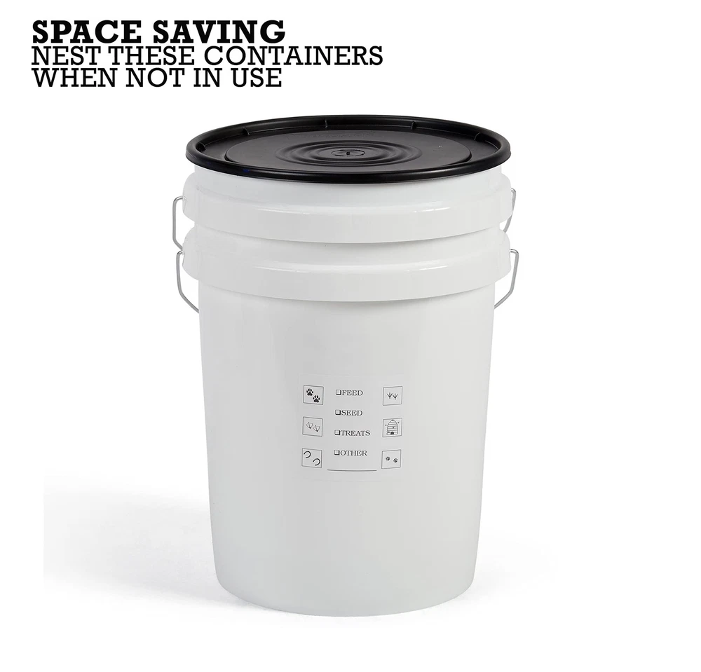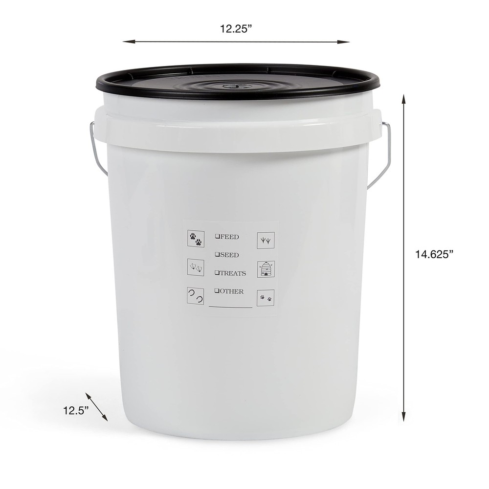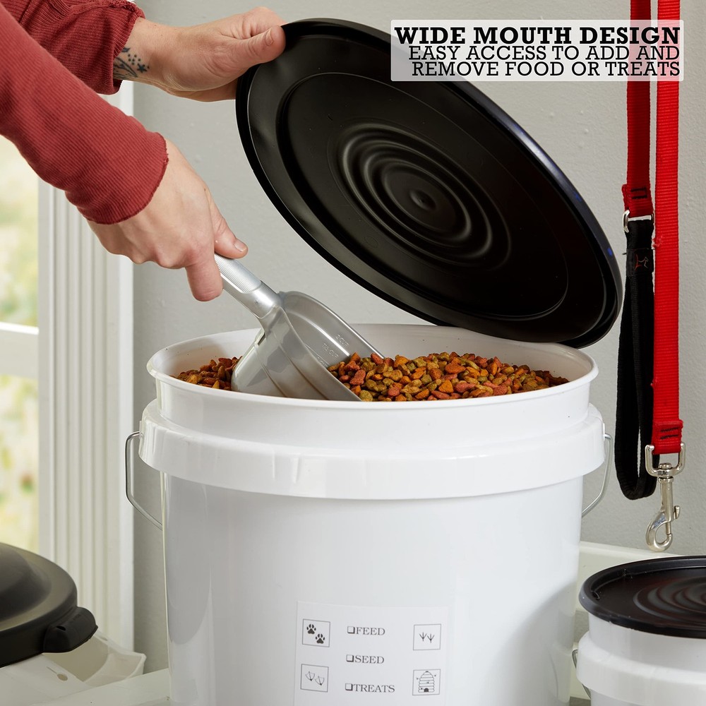 AIRTIGHT STORAGE – The airtight design of this pet food storage container preserves the freshness of your pet’s treats or feed. The durable quality also helps with odor control, and keeps moisture, humidity, and pests from entering the container. WIDE MOUTH DESIGN – This dog food storage container is designed with a wide mouth opening for easy access. Easily dispense your pet’s treats and dry food into their cat or dog food bowl without the hassle of opening and closing a large bag. VERSATILE USE – This storage bin is great for birdseed, cat litter, kibble, dry pet food, and more. Not only for pet storage, this container is also great for use as a dog toy bin, dry food storage, rice storage, bulk food organization, and more. EASY IDENTIFICATION – airtight food storage containers are equipped with a decal to indicate what’s inside. The decal allows you to specify whether the bin contains feed, seed, treats, or something such as pet supplies or litter. SNAP-TIGHT LID – This 5 Gallon pet food container is equipped with a durable snap-tight lid to prevent your pets from getting into their treats or pet food. It also stays tight to prevent dog food, bird feed, or cat food from getting stale.