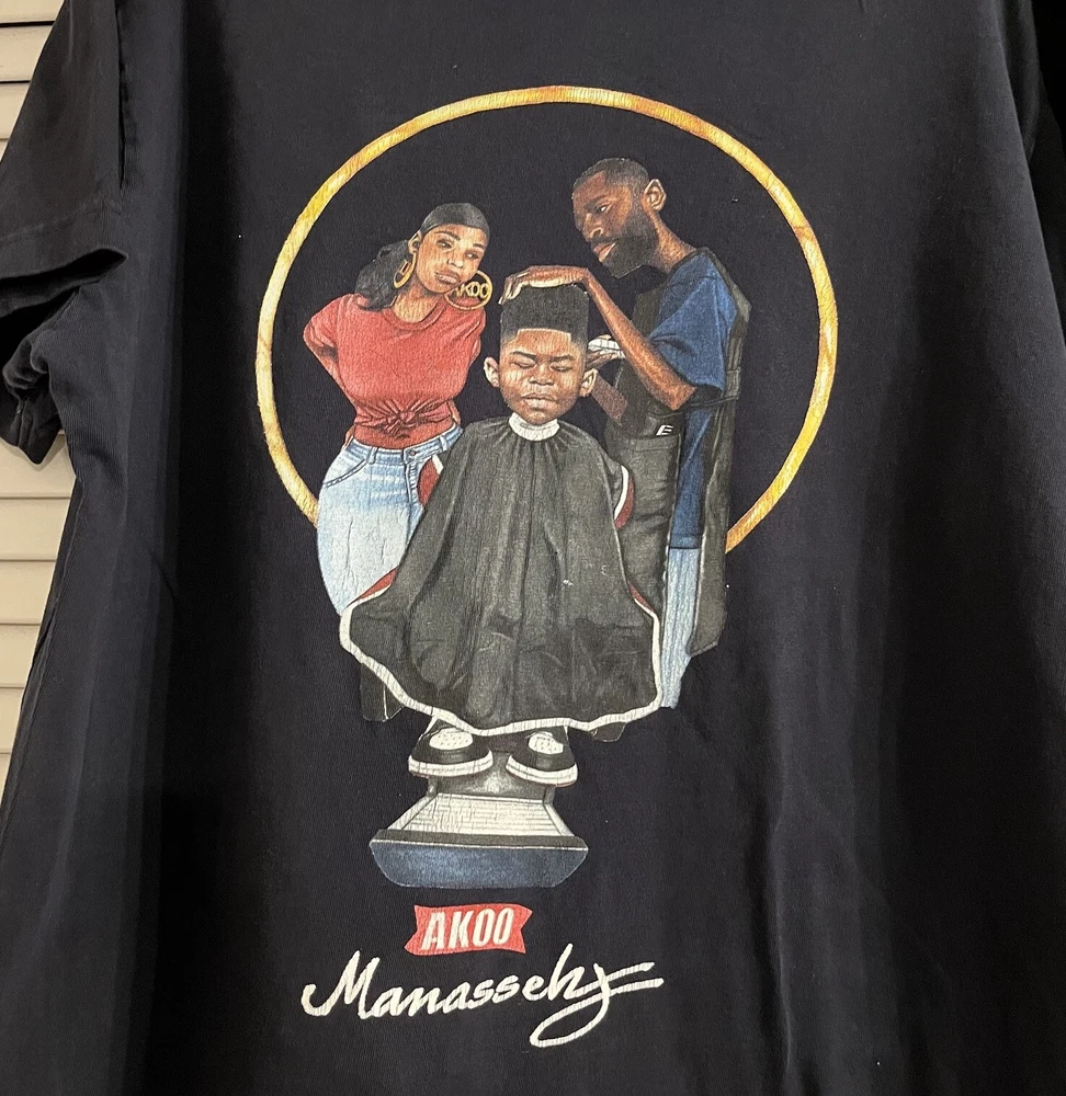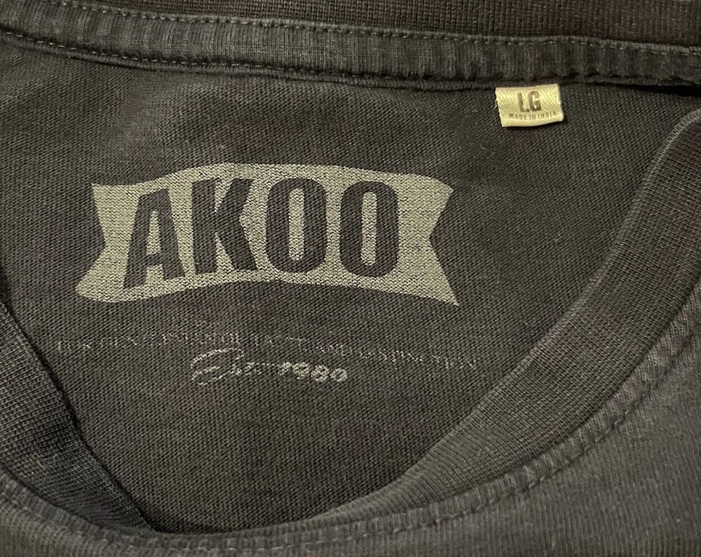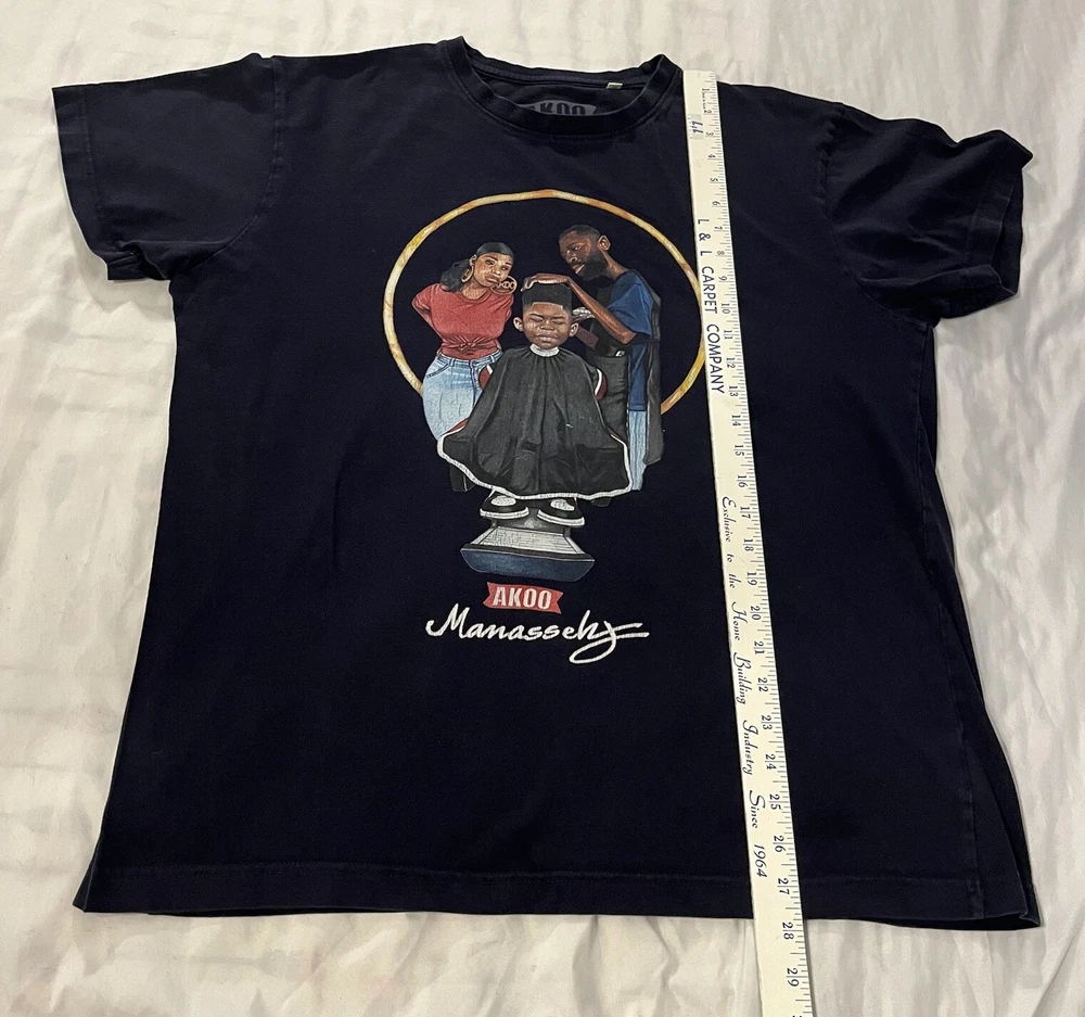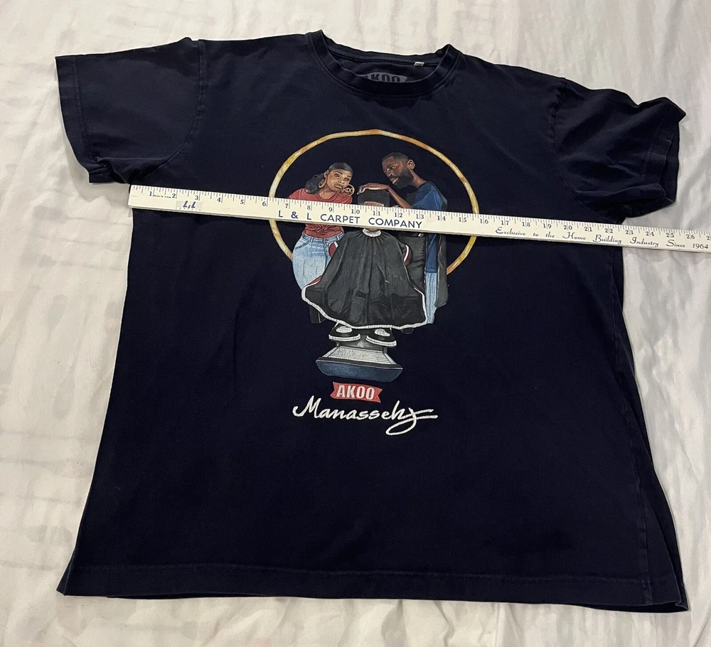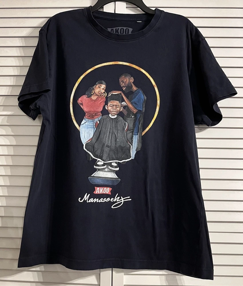 Elevate your casual wear with the Akoo x Manasseh Men's T-Shirt, a perfect blend of comfort and style. The black tee, adorned with a distinctive graphic print, pays homage to the legendary Muhammad Ali, making it an ideal pick for fans of boxing and hip hop culture. Its versatile design transcends seasons, making it a year-round go-to piece. Crafted for a regular fit, this short-sleeved, crew neck t-shirt comes in a size large, suited for most body types. The knit fabric ensures breathability and ease of care, being machine washable for your convenience. Whether you're out on the streets or enjoying a casual day at home, this AKOO branded tee will keep you comfortably in style.