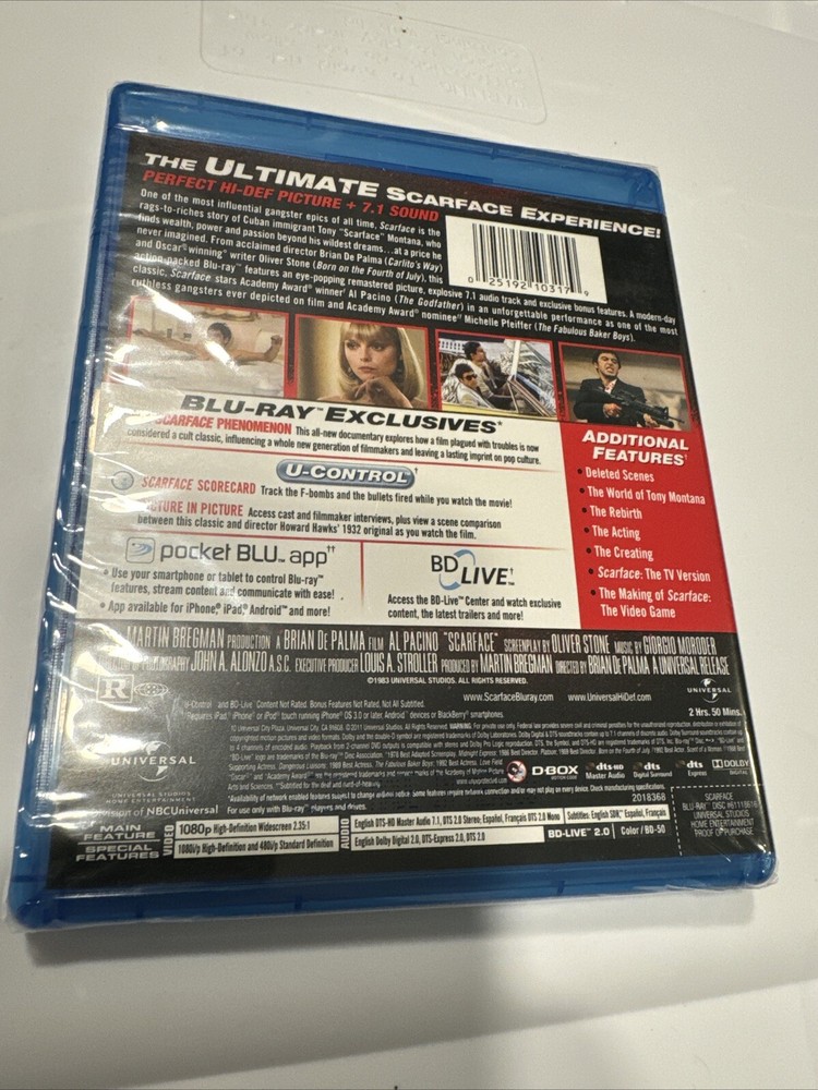 Experience the iconic performance of Al Pacino in "Scarface" remastered in high definition on Blu-ray. This classic action film is a must-have for any movie fan's collection. With a rating of R, this edition is perfect for those who want to experience the intense and thrilling storyline in stunning visuals and audio quality. This Blu-ray disc features the remastered edition of "Scarface" starring Al Pacino, and it is compatible with Blu-ray players. Get ready to immerse yourself in the action and experience the storyline in a whole new light. Add this film to your movie collection today.