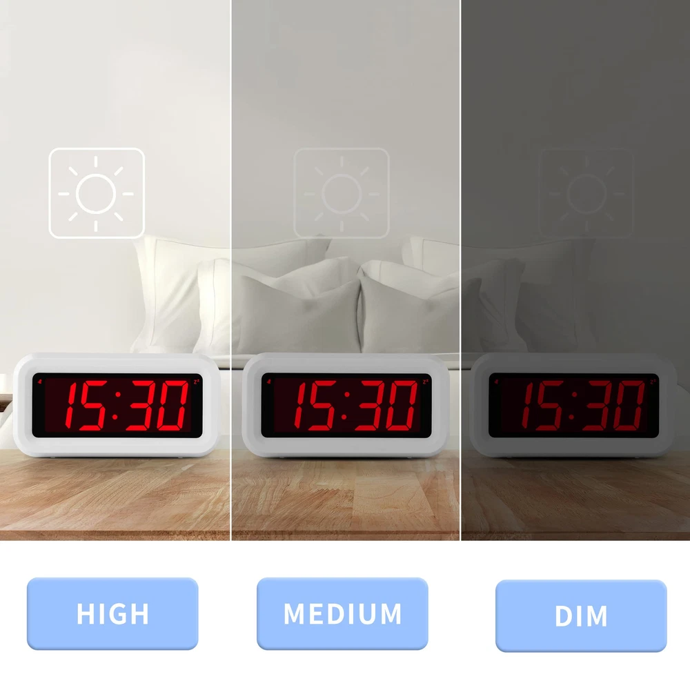 Alarm clock & battery operated clock - This basic clock is powered by 4 x AA alkaline batteries only (not included), which can keep Constantly Big 1.2'' LED digit time display for more than 12 months. Bright LED time display, 24hour light up 1.2" large led time numbers can let you check your time clearly from a distance or even in the dark. It is a simple clock. Easy to set - Intuitive and Clear Marked Button, Great alarm clocks for and the elderly, they can operate the clock, set time, alarm, dimmer and 12Hr/ 24Hr. When the alarm is beeping, simply touch the top big snooze to pause the alarm to get extra 7 minutes nap, press any button to stop alarm today, and it will still sound the next day. Press “AL ON/OFF” to cancel the alarms and the alarm icon on the top-right corner will disappear. Alarm clock for bedroom - There are 3 levels of brightness for your options (day time), high/middle/low. The clock will enter into Night-mode and dim automatically at 8:00pm~6:00am to protect your eyes at night and save energy. No blinding lights or any annoying sounds disturb your sleep, create an peaceful environment for sleep. Perfect alarm clock for bedroom, beside, nightstand, desk, shelf and table. Digital alarm clock - Alarm clock will continue for 90 seconds ensuring definitely waking up. The alarm bell will louder every 30 seconds. There is also a 7-minute snooze that can be continually pressed repeat 3 times. The time accuracy of this clock is less than +/-30s per month. Small wall clock & desk clock - 1 holes on the back for easy wall-mounting for a small wall clock. It is also table-top for a simple desk clock. Perfect gifts for , toddlers, teens, adult, seniors, elderly, boys or girls, friends or families, ideal for gifts alarm clock.