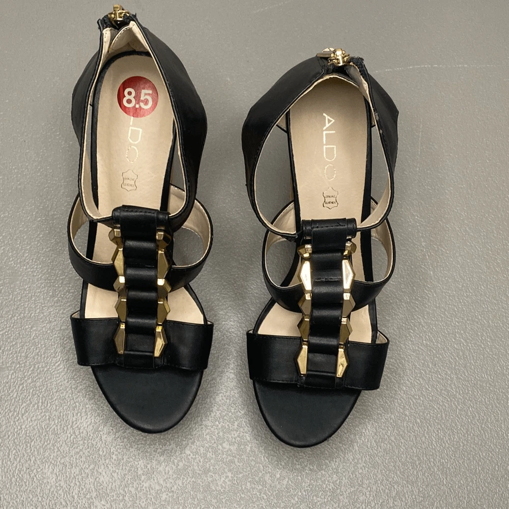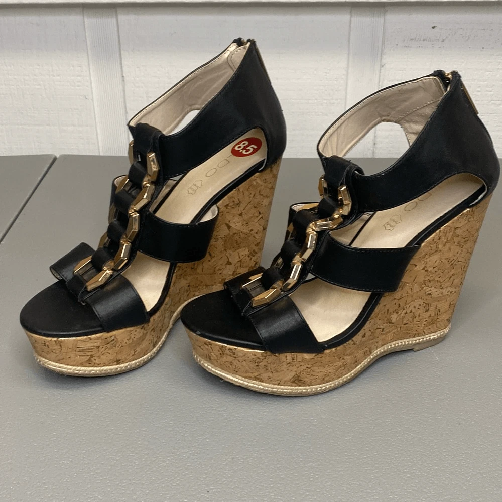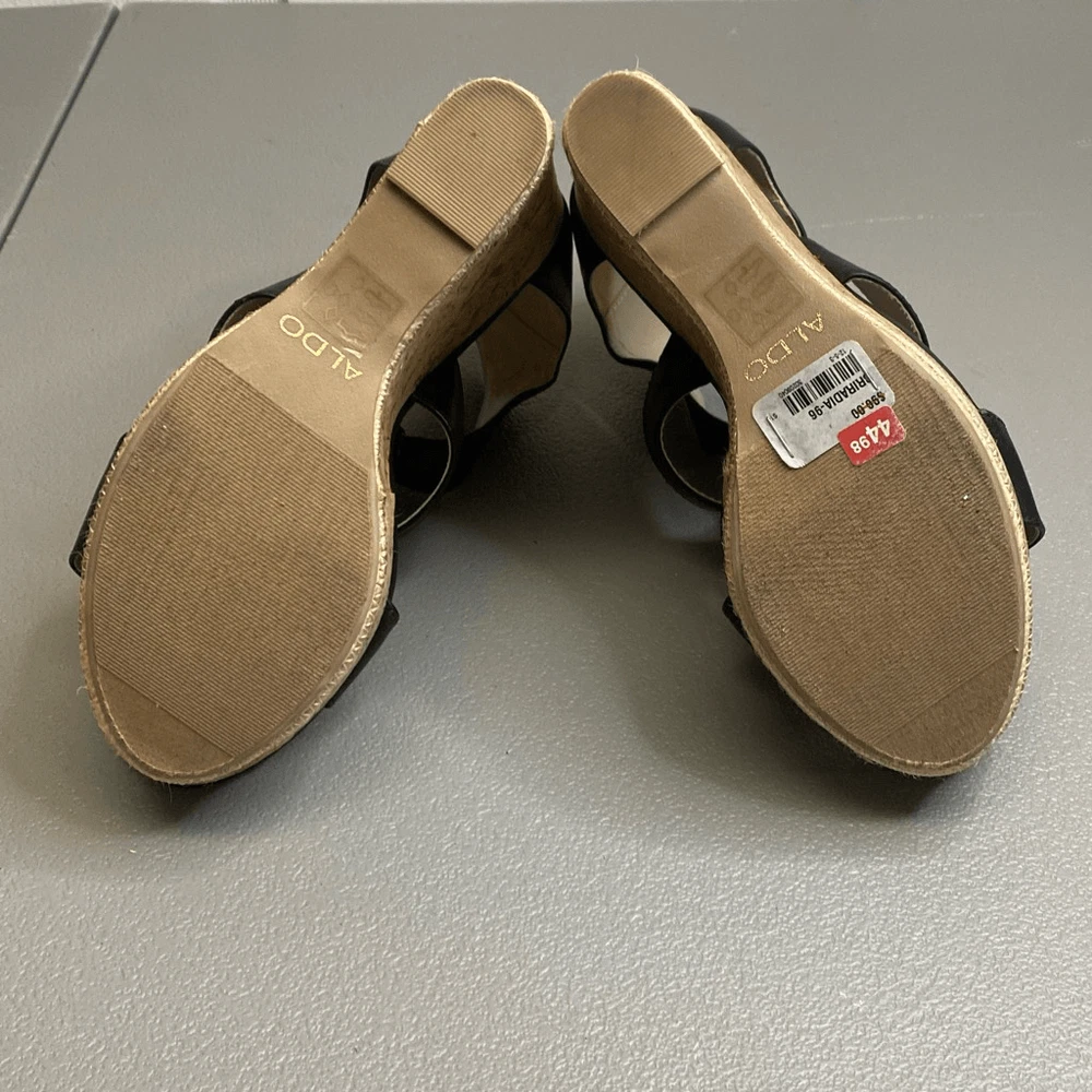 NEW Sexy Aldo Wedge Platform Strappy Sandal Cork Leather Black Gold Sz 8.5 Pair of NEW unworn wedge sandals. Old stock, some minor scuffs. Please see pictures. The platform at the front of shoe is approx 2” high. The back heel from floor to insole is approx 5.25”. Zipper feature in back at heel, zippers work.