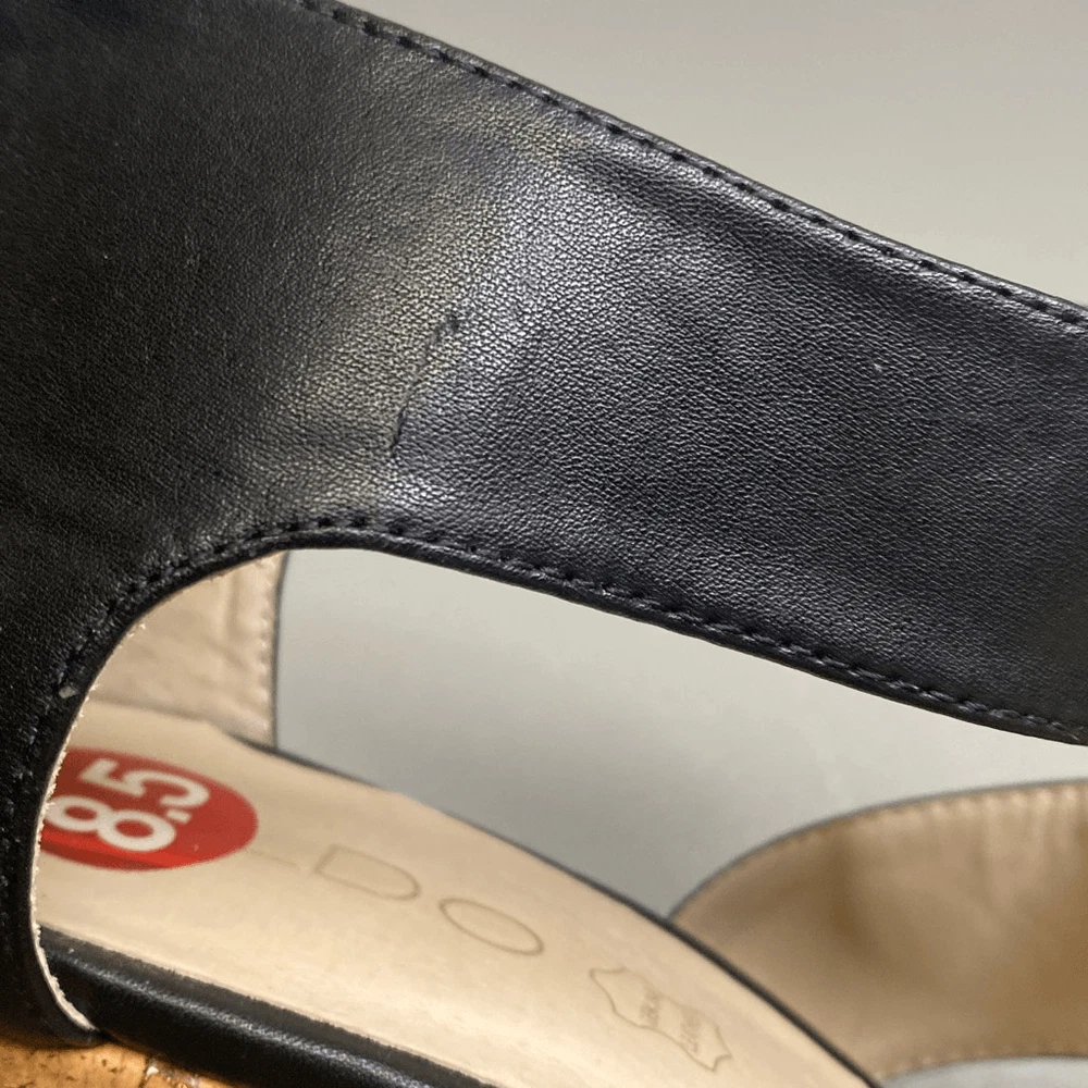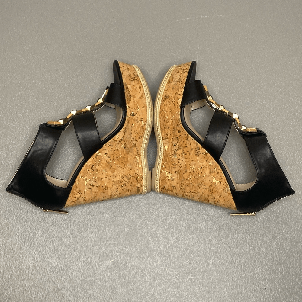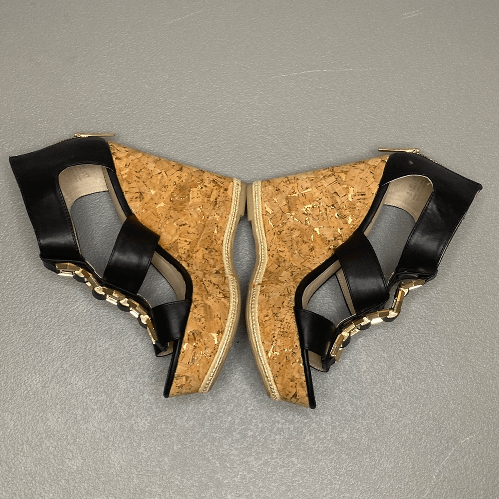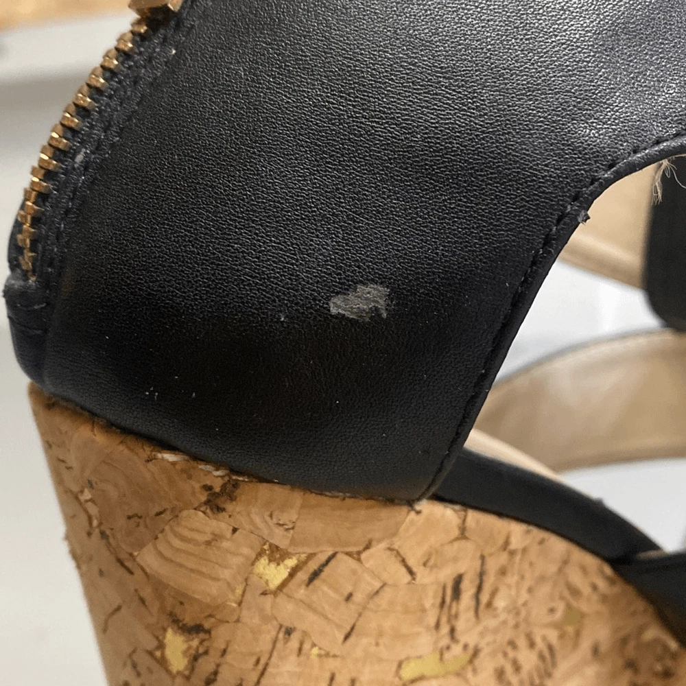 NEW Sexy Aldo Wedge Platform Strappy Sandal Cork Leather Black Gold Sz 8.5 Pair of NEW unworn wedge sandals. Old stock, some minor scuffs. Please see pictures. The platform at the front of shoe is approx 2” high. The back heel from floor to insole is approx 5.25”. Zipper feature in back at heel, zippers work.