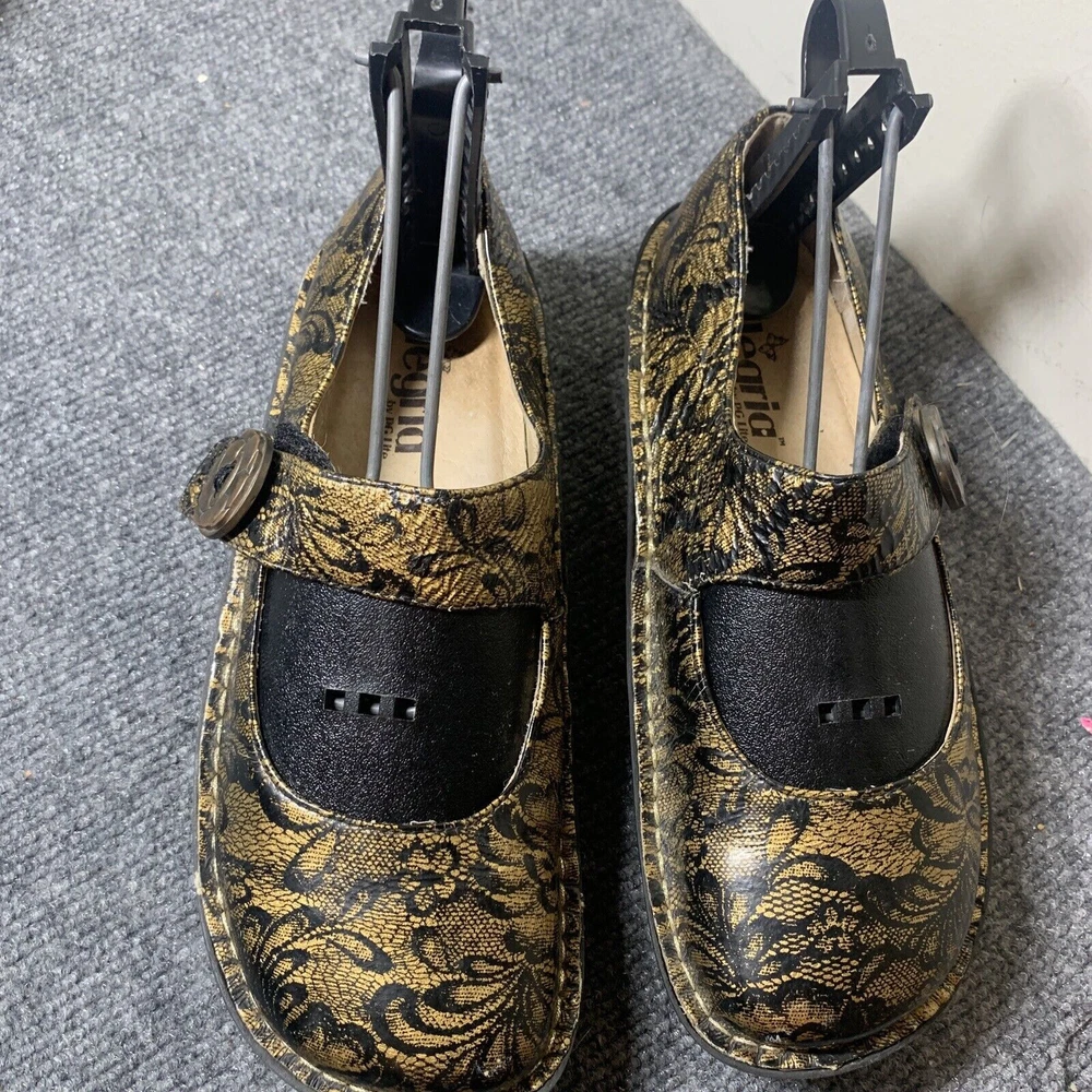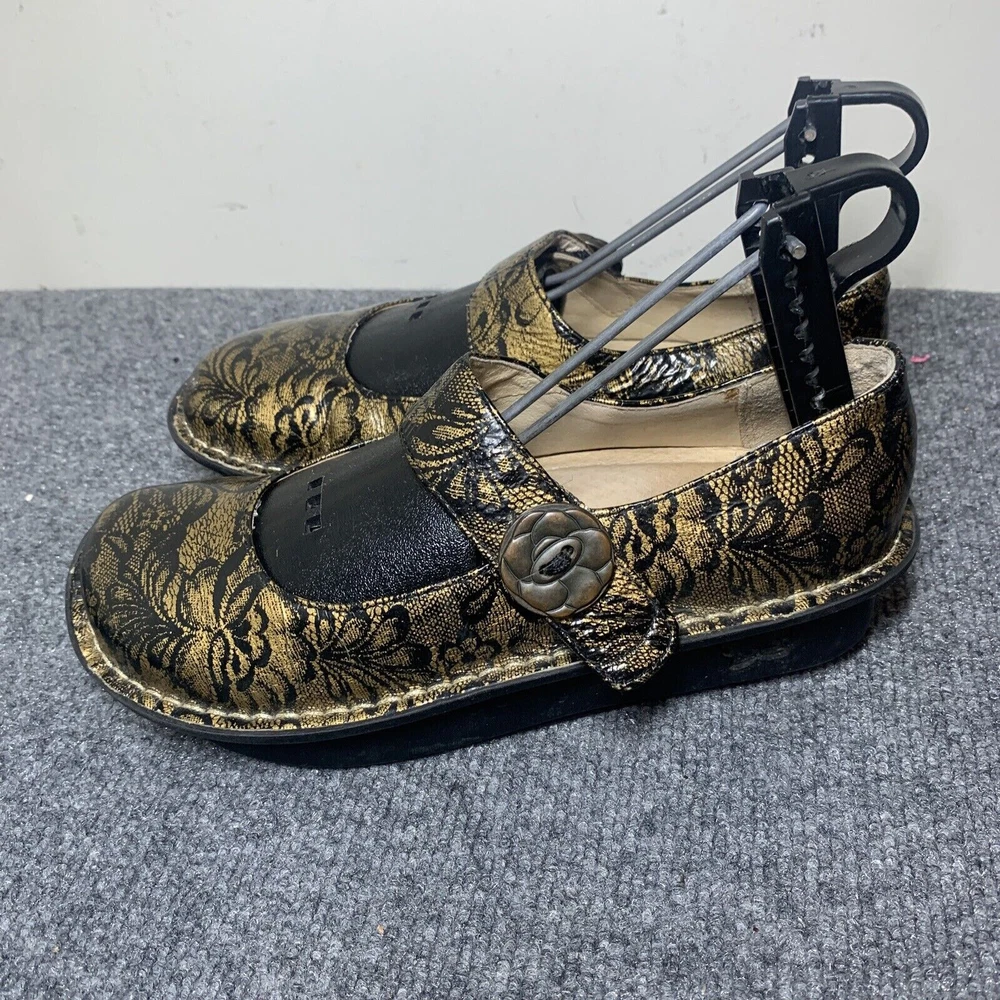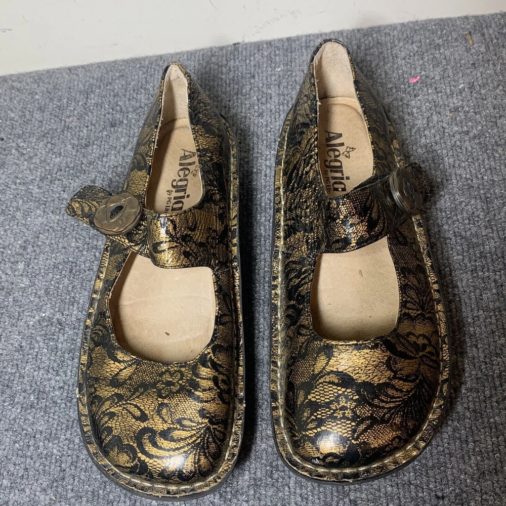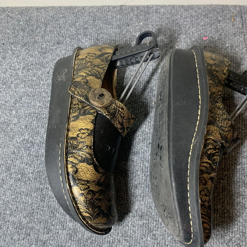 Genuine leather, smashing print for holiday parties when you don't want to wear heels. Classic mary jane styling and a slip-resistant, classic rocker outsole teams up with the signature Alegria footbed for a supportive and comfort-driven feel on your foot. 1 3/4 ergonomic rocking footbed. Adjustable hook-and-loop closures on the strap. A slight padded collar gives you extra support at the back of the ankle and hand-stitching adds an extra ounce of delight. BUYERS: Questions are always welcome:). Stock photos are for illustration-items are generally in good used condition unless stated otherwise from a smoke-free, pet-friendly home. Please check all details to be sure the size, style, and condition will be comfortable for you before bidding. Payment is required within 2 days-please ONLY bid if you truly intend to pay! I ship promptly, just remember I have no control over the current USPS mail delays. Sales are usually final, but contact me if you run into an issue so I have a chance make everything right.