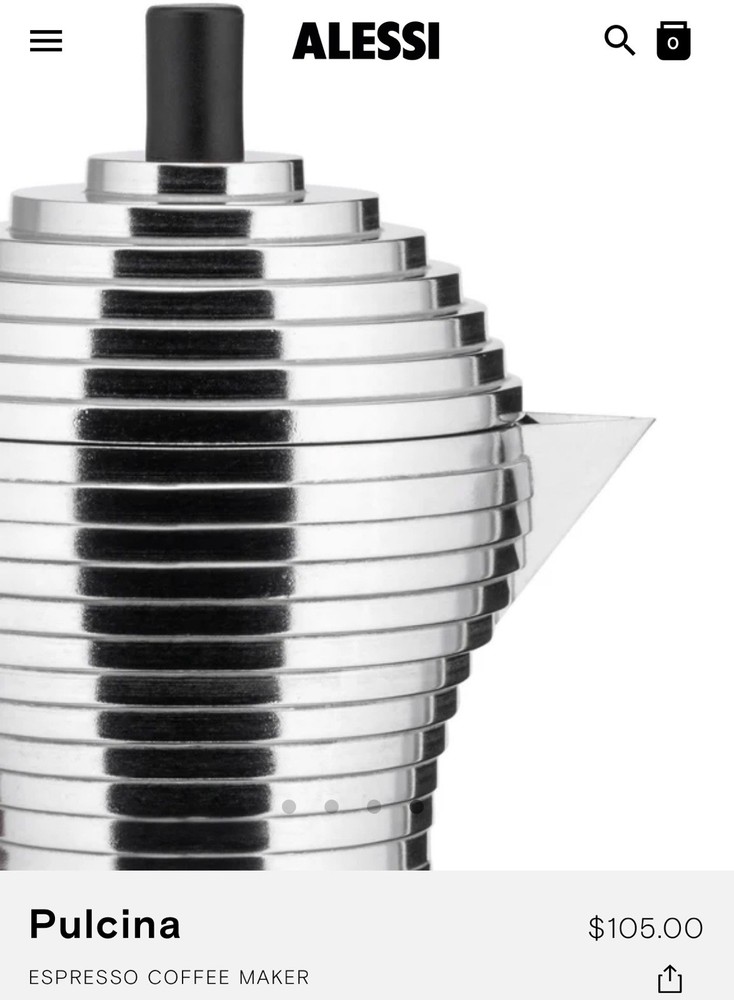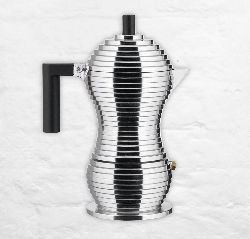 The Alessi Pulcina Espresso Coffee Maker is a revolutionary moka that combines the technology developed by illycaffè and the design experience of Alessi. It was designed by Michele de Lucchi and encapsulates a small but substantial design innovation that stops dispensing the drink at the right time before the coffee gets a bitter aftertaste. The spout, which recalls a chick's beak, allows it to perfectly stop the drop.