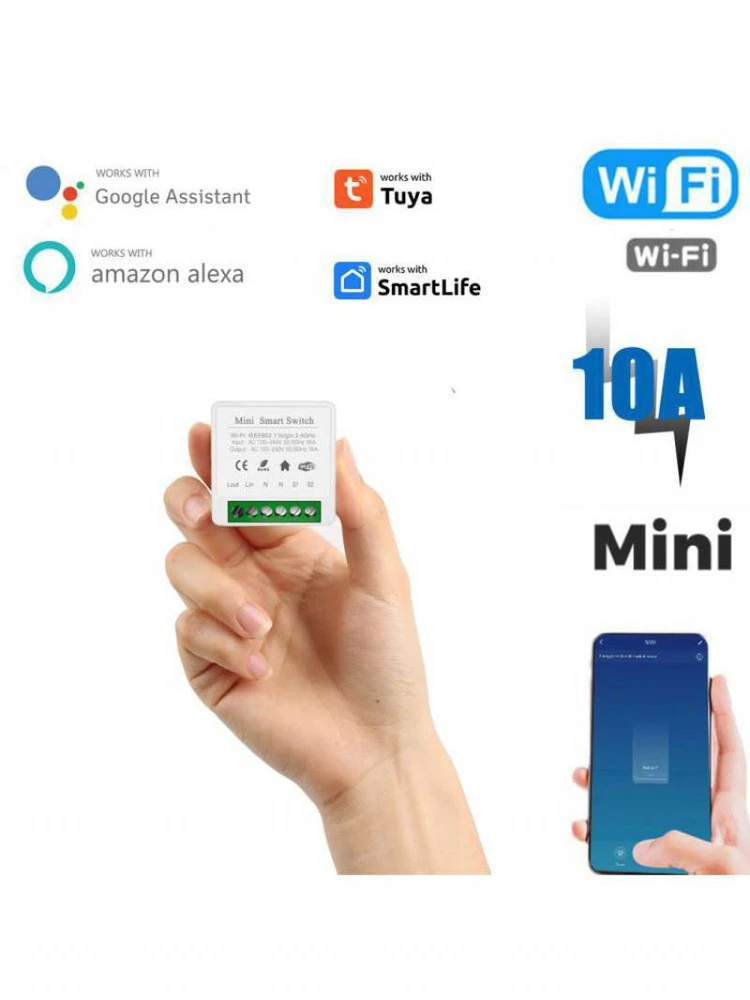 Alexa Tuya Wifi Switch Smart Home Domotica Yandex Station Alice Wireless Interruptor Module 110V 220V Light Socket Description: 1. Turn non-smart appliances or equipment into smart; 2. Mobile App control. Control switch, timing, countdown and other functions of device through mobile phone 2. Voice control. Support voice assistants such as Tmall Wizard, Alexa, GoolHome, etc., to realize functions such as switches; 3. Remote control. It can realize the remote control of the light by mobile phone, no matter where you are in the earth, as long as your mobile phone can connect to the network, you can control it; 4. Networking technology. mobile phone can control switches, and switch can be controlled by mobile phones at the same time; 5. Group control. The lights can be grouped to achieve unified control (simultaneous switching, timing, etc.); 6. The Internet of Everything. Through settings, it can be linked with other intelligent scenes to make life smarter; 7. Sharing and security. The main account can be shared with other members of the family, and the functions and settings are completely retained and copied; security: once the lamp is added by the main account, the lamp will be and other users can no longer find and add; it needs to be actively shared before others can use it . 8. fast matching: turn on , the phone will quickly find the device Specifications: Color:white Output: 100-240V 50/60Hz Input: 100-240V 50/60Hz -Fi:IEEE 802.11b/g/n Material:PCV-0 Certified product:CE ROHS Maximum current:10A Package Included: 1*mini smart switch module,1*Manual
