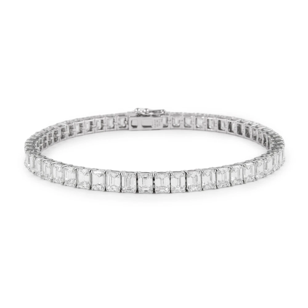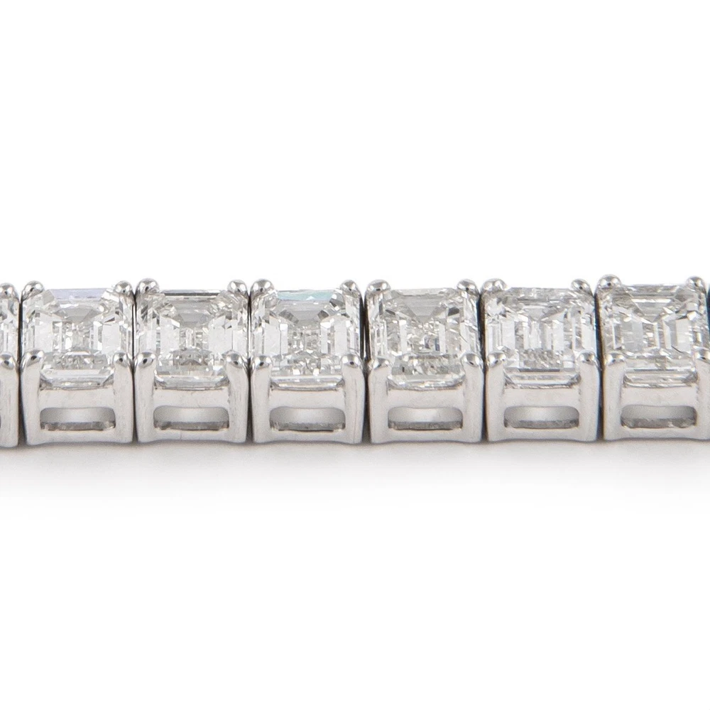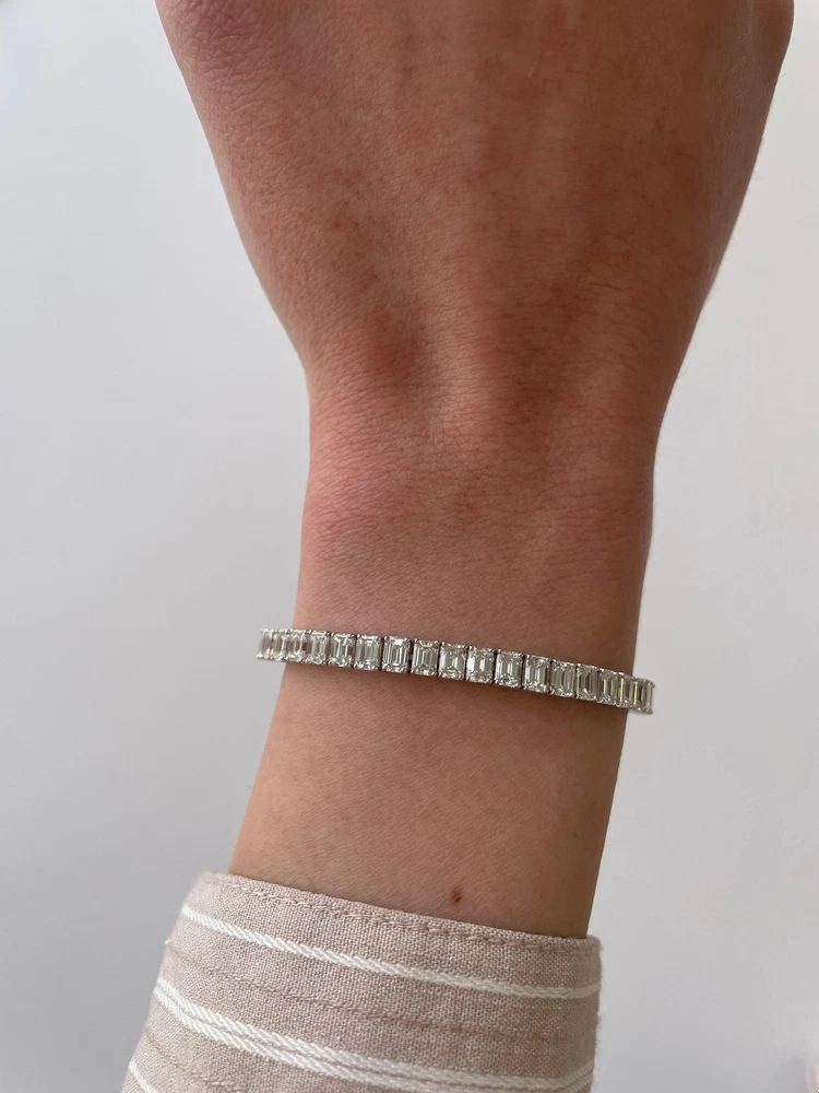 Stunning modern straight emerald cut diamond tennis bracelet. High jewelry by Alexander Beverly Hills. 54 emerald cut diamonds, 12.67 carats (apx 0.23ct each). Approximately F color and VS1 clarity. 18k white gold, 11.53 grams. Accommodated with an up-to-date digital appraisal by a GIA G.G. once purchased, upon request. Please contact us with any questions. Item Number BS1416