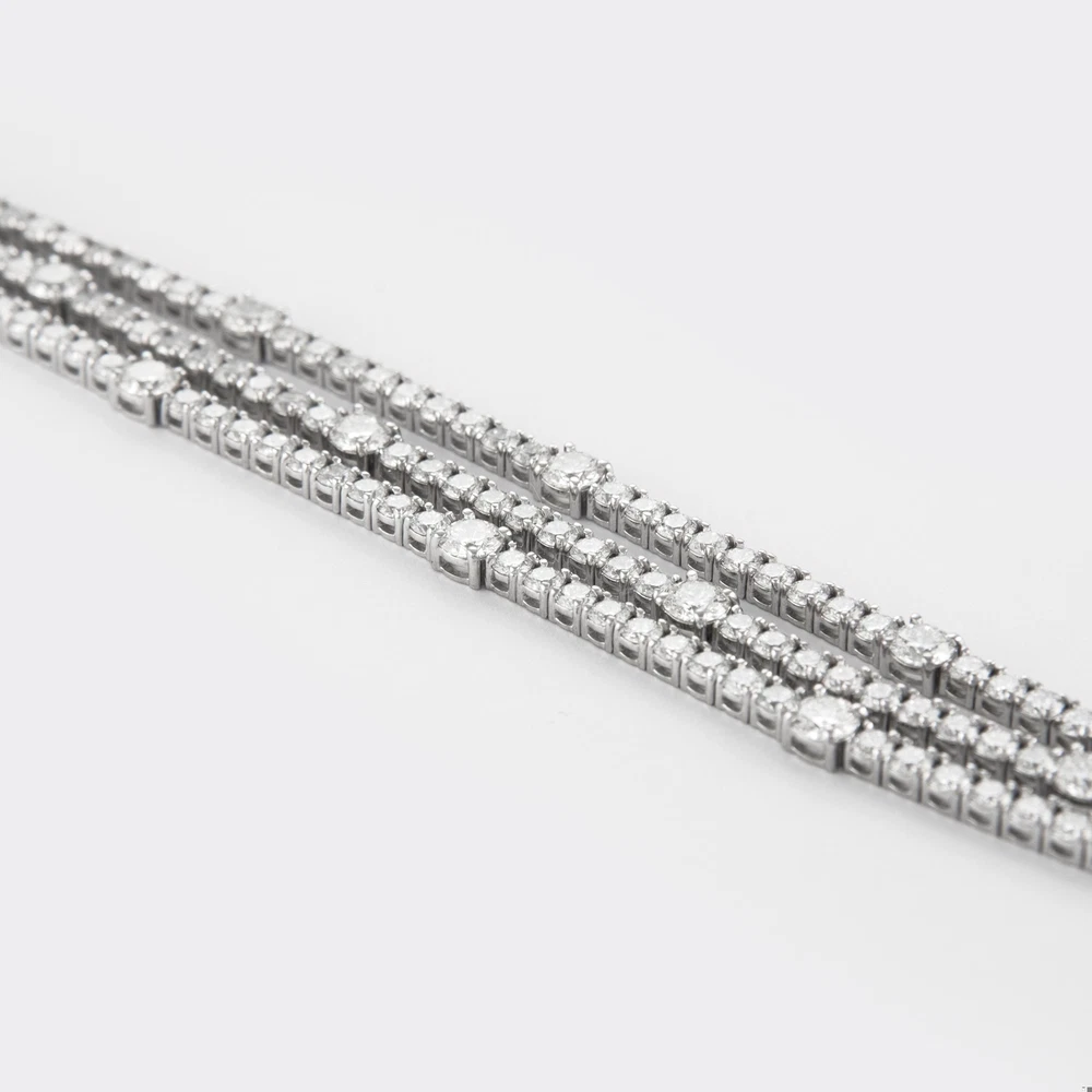 Exquisite and timeless three row diamonds tennis bracelet. By Alexander Beverly Hills. 174 diamonds total, 17.40 carats total. 15 larger round brilliant diamonds 4.68ct, approximately H/I color and SI clarity. 159 round brilliant diamonds 12.72ct, approximately H/I color and SI clarity. Prong set in 18k white gold, 7in. Accommodated with an up-to-date digital appraisal by a GIA G.G. once purchased, upon request. Please contact us with any questions. Item Number B3663