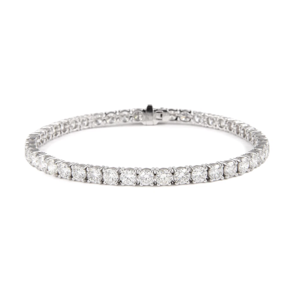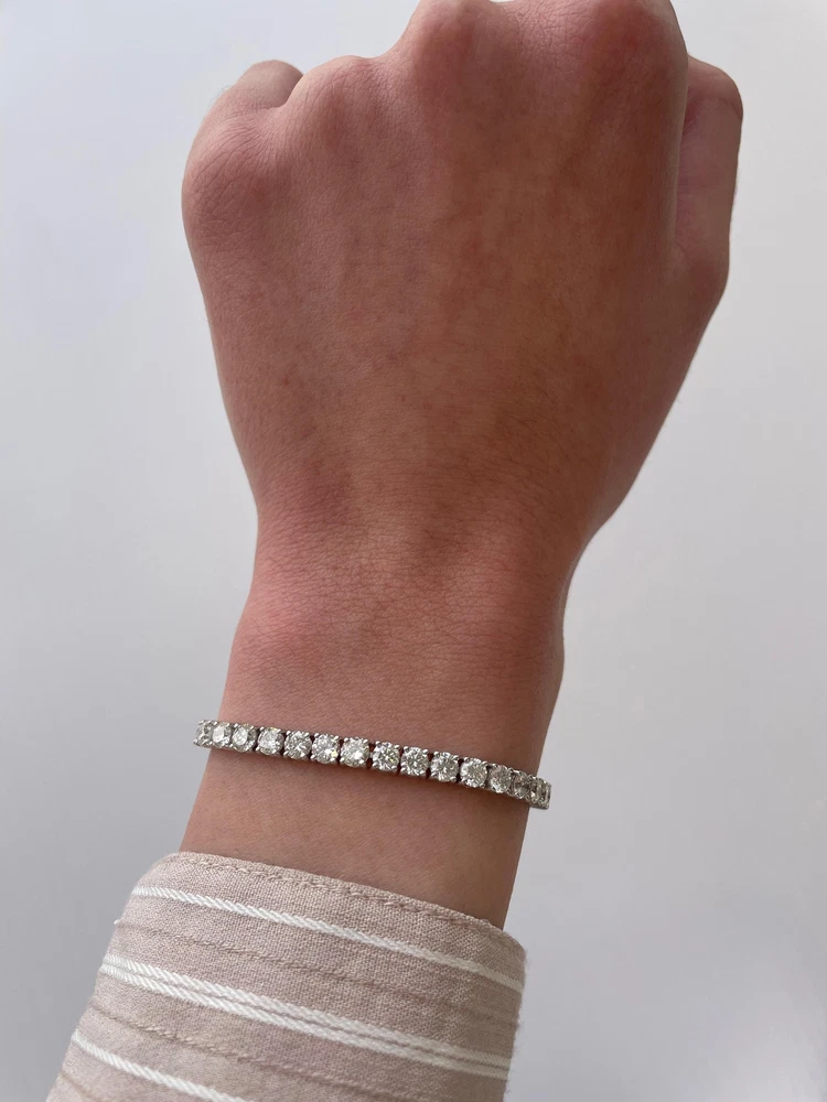 Exquisite and timeless diamonds tennis bracelet, by Alexander Beverly Hills. 45 round brilliant diamonds, 9.55 carats. Approximately D-F color and VS1/VS2 clarity. Four prong set in 18k white gold, 11.03 grams, 7 inches. Accommodated with an up-to-date digital appraisal by a GIA G.G. once purchased, upon request. Please contact us with any questions. Item Number MD025NP