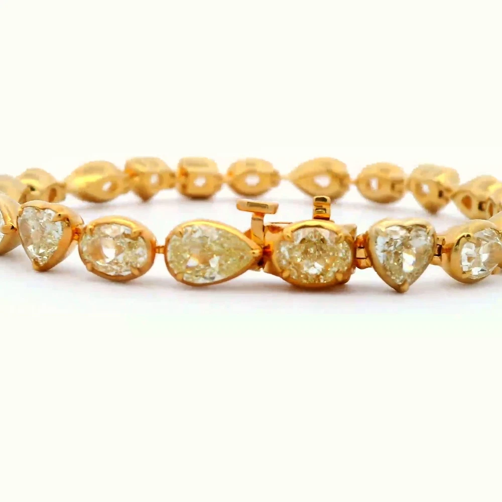 Sensational modern alternating multi yellow diamond bezel set tennis bracelet, EGL certified. High jewelry by Alexander Beverly Hills. 21 oval, heart, pear, and cushion shape yellow diamonds, 21.75 carats (avg 1.03ct). Fancy-Fancy Light Yellow color grade and VS1 clarity. 18k yellow gold, 33.00 grams, bezel / prong set, 7in. Accommodated with an up-to-date digital appraisal by a GIA G.G. once purchased, upon request. Please contact us with any questions. Item Number BD1299