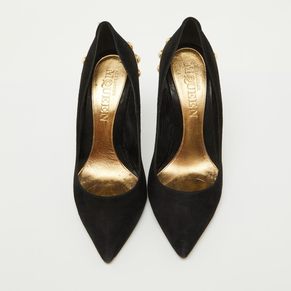 Make a chic style statement with these designer pumps. They showcase sturdy heels and durable soles, perfect for your fashionable outingsCertified by The Luxury Closet - This item has gone through a detailed authentication process overseen by our experts. We offer a lifetime guarantee of authenticity on all our items. Import duties, taxes and charges are not included in the item price. These charges are the buyers responsibility. Please check with your country’s customs office to determine what these additional cost will be prior to buying. Our eBay Store About Us Contact Us Add to Favorite Sellers Alexander McQueen Black Suede Gold Trimmed Faux Pearl Pumps Size 39 $203.5 Make a chic style statement with these designer pumps. They showcase sturdy heels and durable soles, perfect for your fashionable outings Product Details Brand Color Black Dimensions Material Suede Size 39 Outsole Width 8.5 cm Outsole Length 25 cm Heel Height 10.5 cm Includes The Luxury Closet Packaging Certified by The Luxury Closet This item has gone through a detailed authentication process overseen by our experts. We offer a lifetime guarantee of authenticity on all our items. How We Check The in-house team of experts at The Luxury Closet is highly trained to verify the authenticity and the condition of the luxury products. They ensure that only 100% authentic items are put on sale.The evaluation process is unique with its own mix of assessment criteria and differs according to the category. Each item is evaluated based on the following combination of hallmarks, hardware, stitching, symmetry, material, craftsmanship, stamping, codes, hologram stickers, and packaging. Our authenticators also check if the items have been modified or amended (e.g., aftermarket diamonds, replaced batteries, repaired bags, etc.) International Buyers Import duties, taxes and charges are not included in the item price. These charges are the buyers responsibility. Please check with your country’s customs office to determine what these additional cost will be prior to buying.