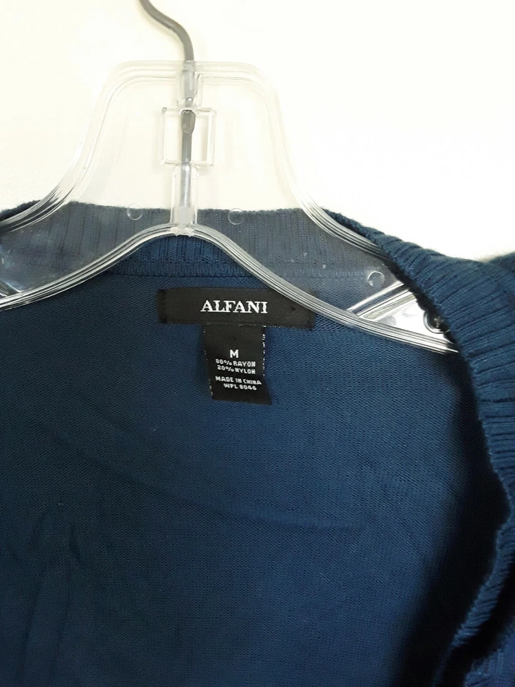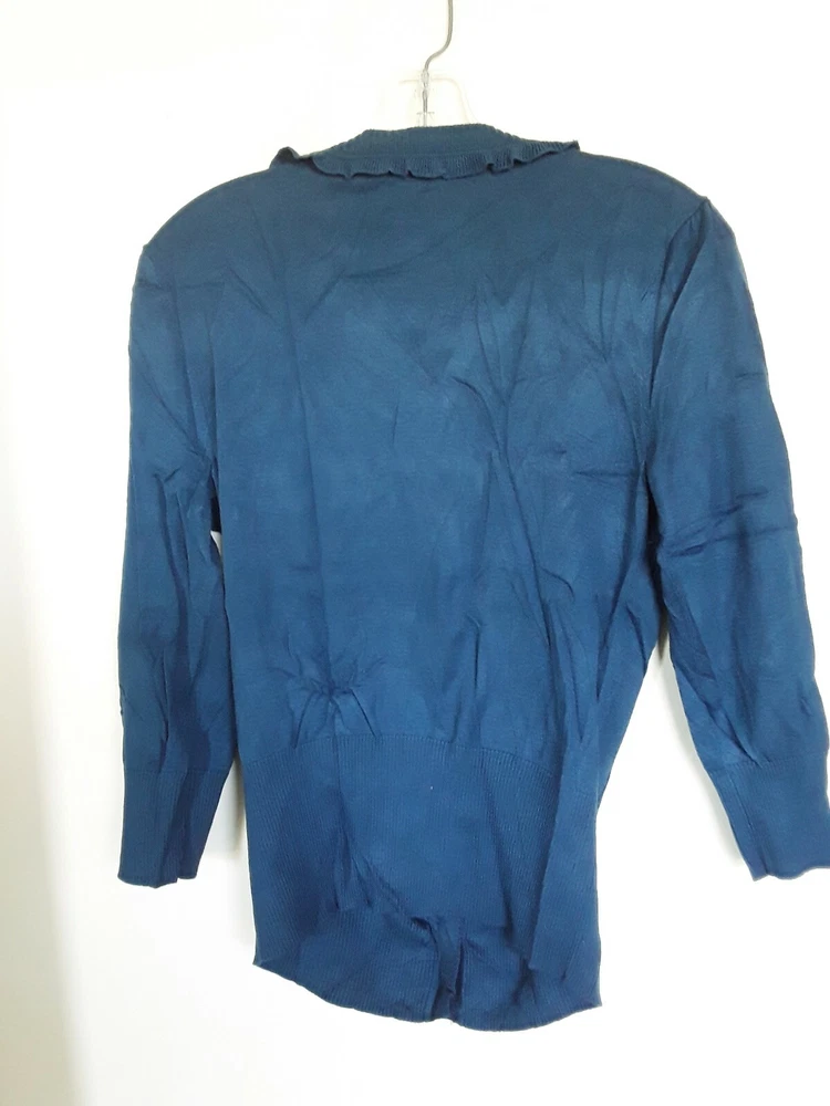 Alfani Womens Medium Teal Ruffle 3/4 Sleeve Cardigan Sweater Armpit-armpit: 19" Sleeve Length 18" Length: 23" AT Combined Shipment: USA : Highest item shipping cost + $3.00. for each subsequent item.Or, you can purchase as many items as you choose and pay the flat rate of $18.75 for your Priority Mail Large Flat Rate Box which covers your entire order. Please read the disclaimer below. INTERNATIONAL SHIPMENTS: Highest item shipping cost + $5. for each subsequent item. Please read the disclaimer below. DISCLAIMER on Shipping Costs: Our intention is to keep our shipping costs as low as possible. However, depending on the item purchased (weight) and the destination, shipping rates can vary; especially 30 Day?s No Questions Asked Returns Policy: Your satisfaction is very important to us. We have a 30 days NO QUESTIONS ASKED returns policy. The item must be returned in the condition in which it was purchased. If there are labels/tags they should not be removed. If they are, the item will be sent back to you. ANY SHIPPING COSTS WILL NOT BE REFUNDED. BOTH WAYS, receiving and any returns. Please contact us for the return shipping address and authorization. ALL COMMUNICATIONS MUST BE IN WRITING & TAKE PLACE THROUGH THE EBAY SITE ONLY. No private direct email correspondence. A customer care rep. will respond to you within 24 hrs (Mon-Fri). Once we have received the merchandise and inspected it, please allow 72 hours for a refund to be issued. NO See my other listings for more great items! We accept PAYPAL. Also we have a virtual terminal with PayPal through which we can accept Visa, MasterCard, Amex, and Discover. If you do not have a PayPal account, it takes virtually minutes to open International shipments: PLEASE DO NOT PAY until we determine your shipping costs. Most of our items also have an International Flat-Rate. Although, if due to the destination or the weight we are unable to honor the rate mentioned in the item?s listing, we will cancel your order and leave you positive feedback. Usually we use the US Postal Service. The best international rate for an international shipment is First Class (up to 4 lbs.)If your items exceed 4 lbs. we may pack them into two separate packages (and notify you of this).You still are eligible to take advantage of the combined shipping rates, even if we have packed them into two separate packages. The fees for packaging, shipping, insurance, Customs Duty Charges on international shipments are all the responsibility of the Buyer and are not included in the purchase price. If the item(s) are gifts, we could indicate ?GIFT? on the customs form so you would avoid paying more on duty.