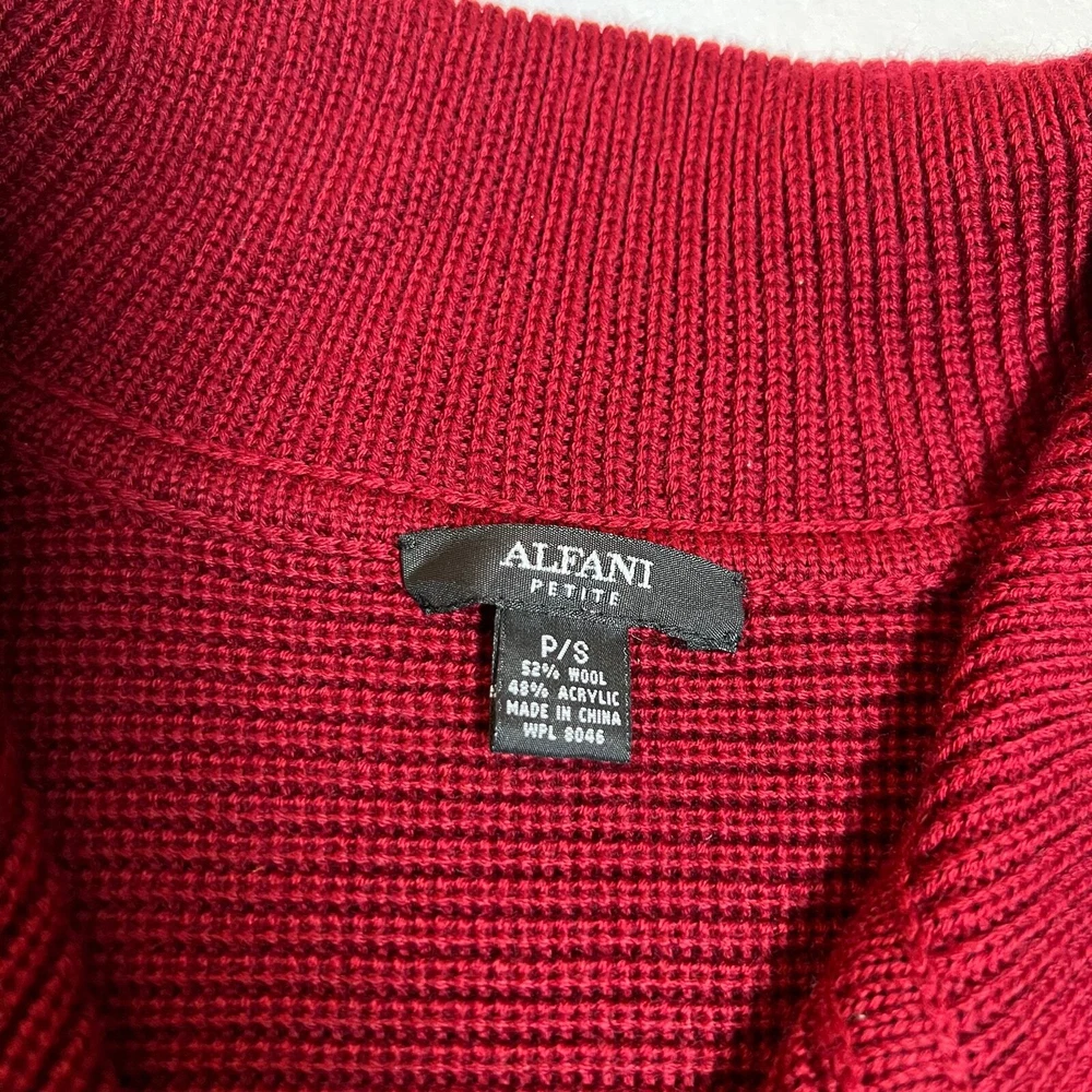 Alfani Wool Blend Knit Open Front Cardigan with Waist Tie Size Petite Small Cozy CONDITION: Pre-Owned. Excellent Used Condition. FLAWS/ALTERATIONS: No flaws COLOR: Red SIZE: Women’s Size Small Petite DETAILS: Collar Long sleeve Tie waist Open front Knit Wool blend MEASUREMENTS: Chest: 21.5" Front Length: 29.5" Back Length: 27" **All measurements are approximate and are taken flat** MATERIAL: 52% Wool 48% Acrylic Bundle 2 OR MORE items to save more! Reasonable offers are welcomed! TAGS: Casual Comfy Fall Winter Travel Vacation Contemporary Minimalist Feminine Girly Cozy Layer Academia Teacher Office Career Workwear Professional Holidays Christmas Corpcore Corporate Party Outerwear Outdoors Classic Staple Cabin Cabincore Snow Modest Colorful