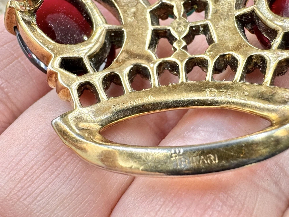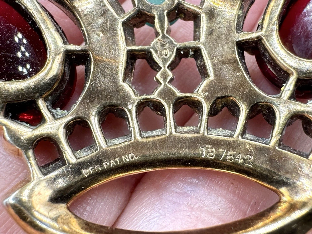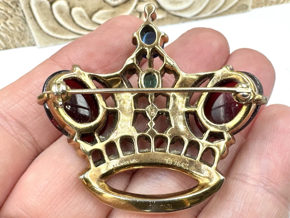 The Alfred Philippe Trifari Crown Jelly Belly Coronation Crown Brooch is a vintage piece of fashion jewelry signed by the renowned brand Trifari. This multicolor brooch features a beautifully designed crown shape with rhinestones and Lucite materials, exuding a sense of beauty, royalty, art, and fashion. Made with golden metal, this original piece is perfect for any occasion and is a true statement accessory for those who appreciate unique and elegant jewelry pieces. In good condition. This is from an estate sale, looks to be in good condition. I do not know the history of brooch, except it was from a Philippe collector. We do combine shipping.