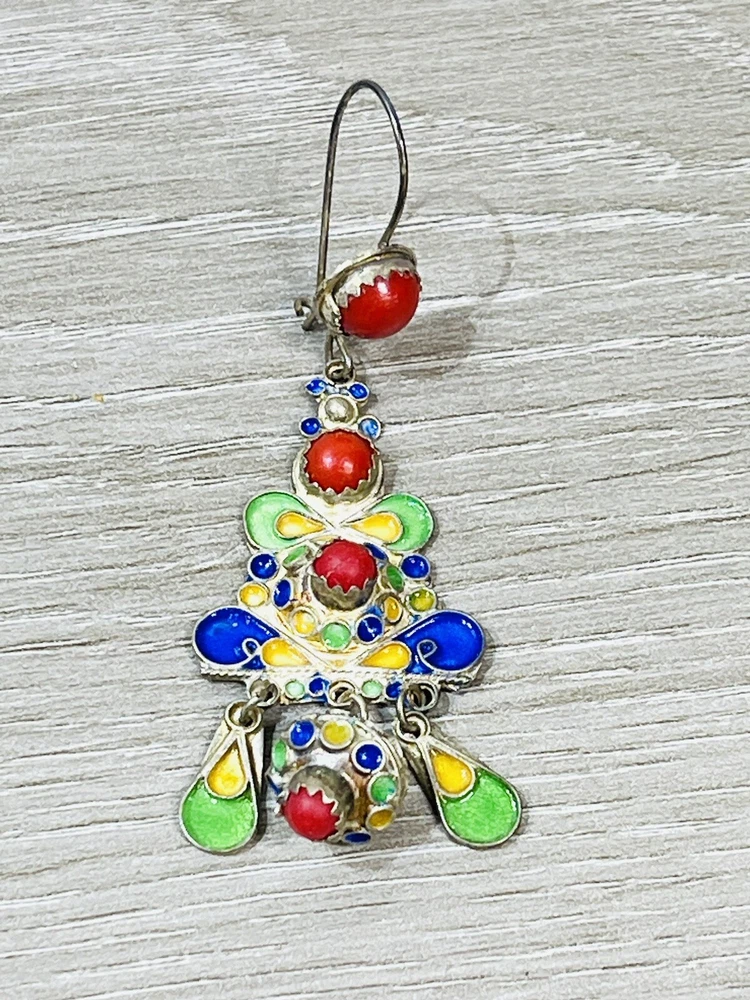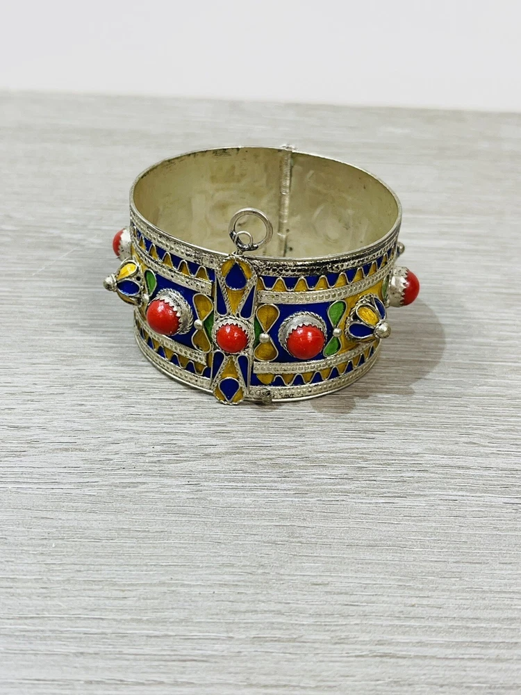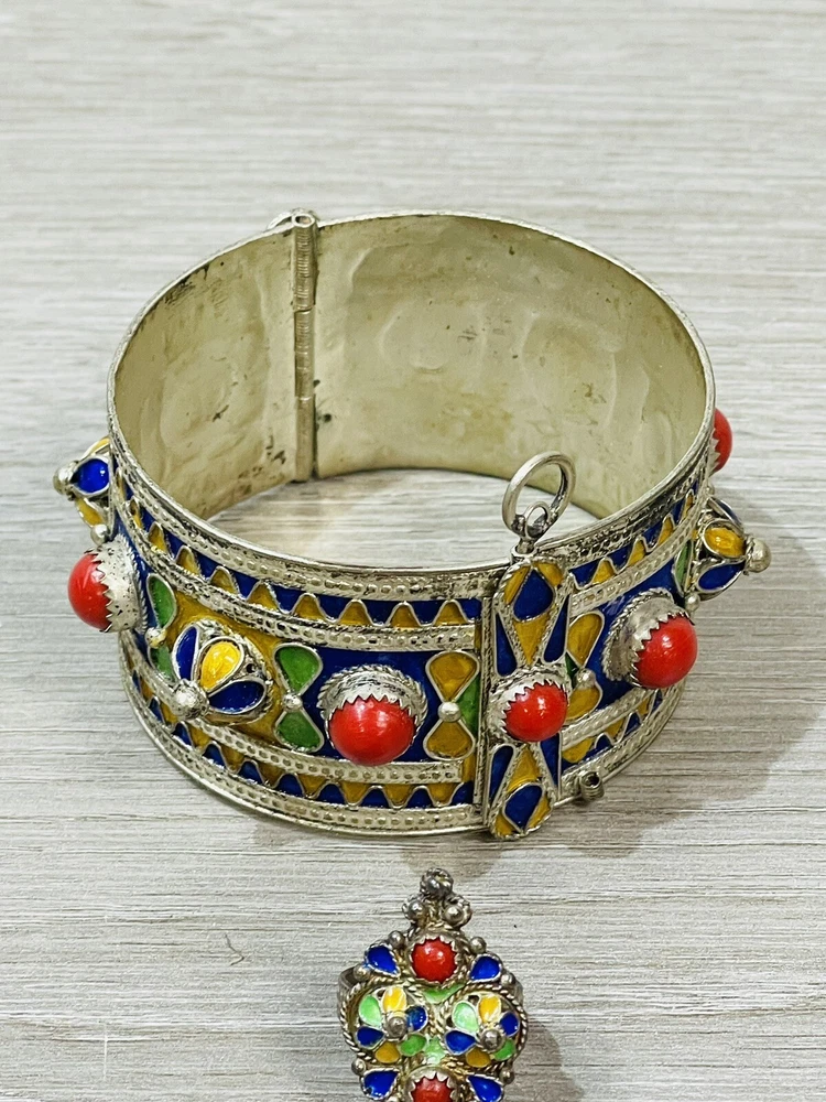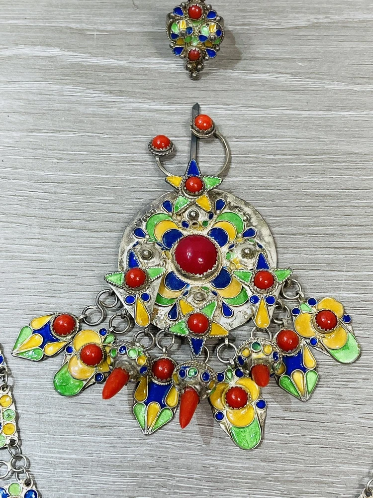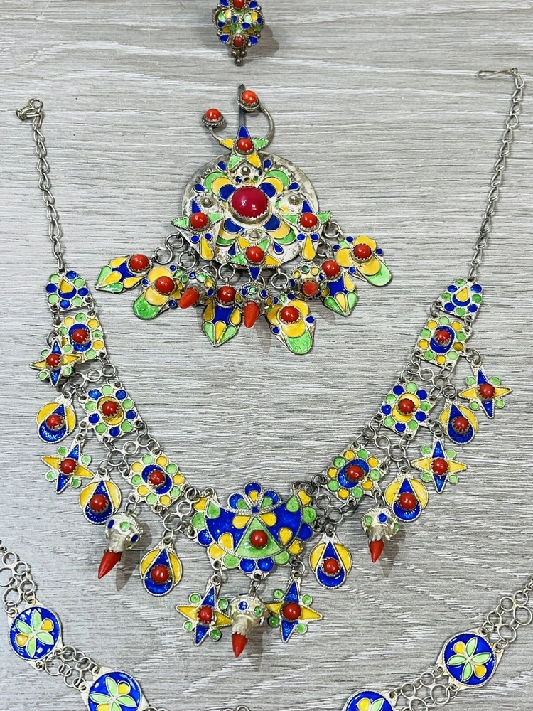 The six piece Algerian Berber Kabyle Sterling Silver Enamel Necklaces, Ring Bracelet, ear rings and Brooch Set Are all in very good condition they do show some signs of age and wear. And have been left unpolished to retain their natural patina.. the bracelet has an internal diameter of 2 1/2 inches, with an external measurement of 8 1/4 inches around. The earrings measure 2 1/2 inches long. both necklaces measure 16 inches long, with what I believe is a brooch or pendant, I’m not sure as it doesn’t have a typical fastener , it has a pointy end. It measures 4 1/2 inches by about 3 inches. The ring is a size 6 1/2.