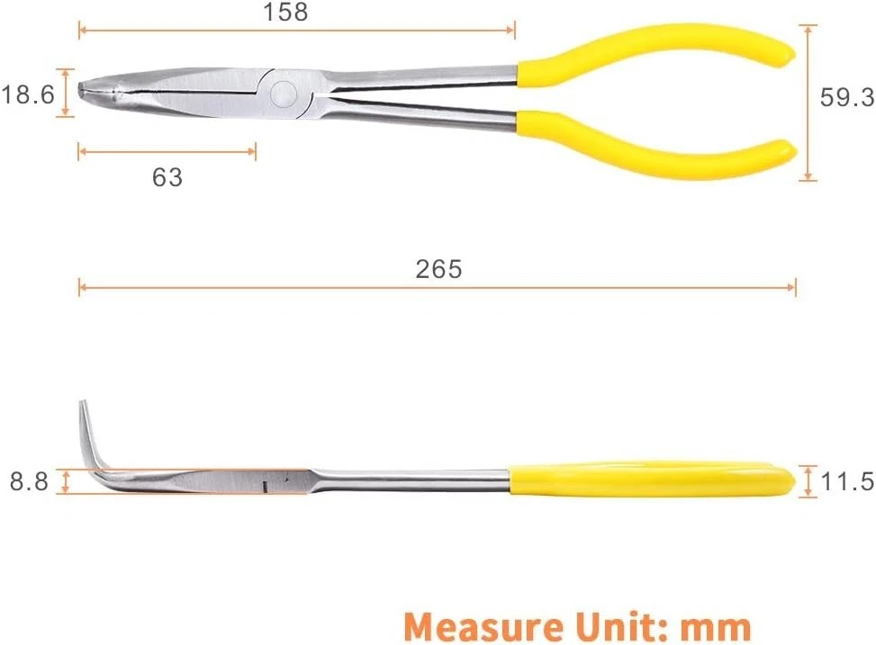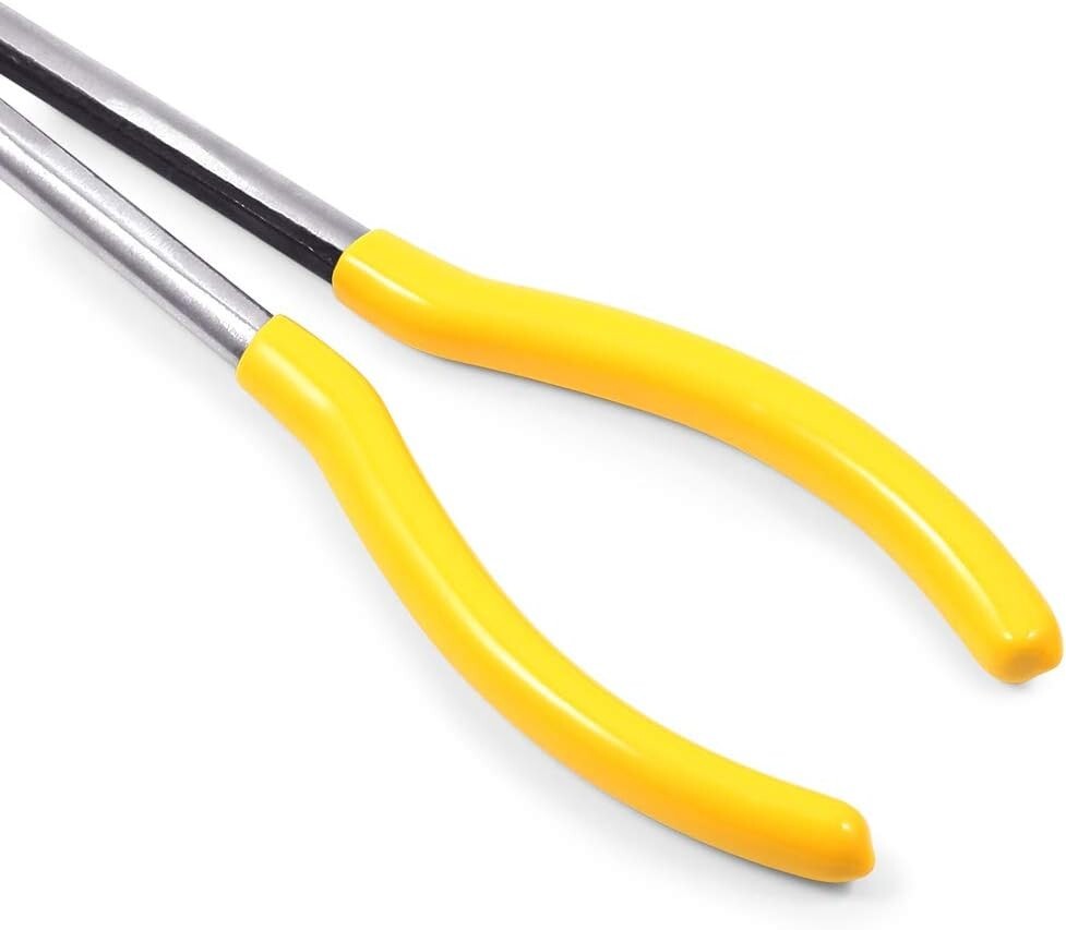 【USO】Diseño de alcance extendido para llegar mejor a áreas confinadas. Las mandíbulas dentadas de 90° son ideales para agarrar y doblar firmemente alrededor de obstrucciones. 【MATERIAL】Acero de alto carbono forjado y tratado térmicamente para mayor resistencia y durabilidad. Todos los alicates tienen un acabado con superficie pulida. 【AGARRE CÓMODO】Mangos delgados de PVC para un agarre cómodo y antideslizante. 【DIMENSIONES】(265 x 59,3 x 11,5) mm / (L x W x H). (Un poco de aceite en la superficie para mantener los alicates libres de óxido, no afectará el rendimiento, simplemente límpielo con un trapo o una toalla vieja). 【ACEITE ANTIÓXIDO】El aceite antioxidante puede aparecer en los alicates, puede protegerlos de la oxidación. No son productos sucios ni usados, puede limpiarlos con una toalla y no afectará la función.