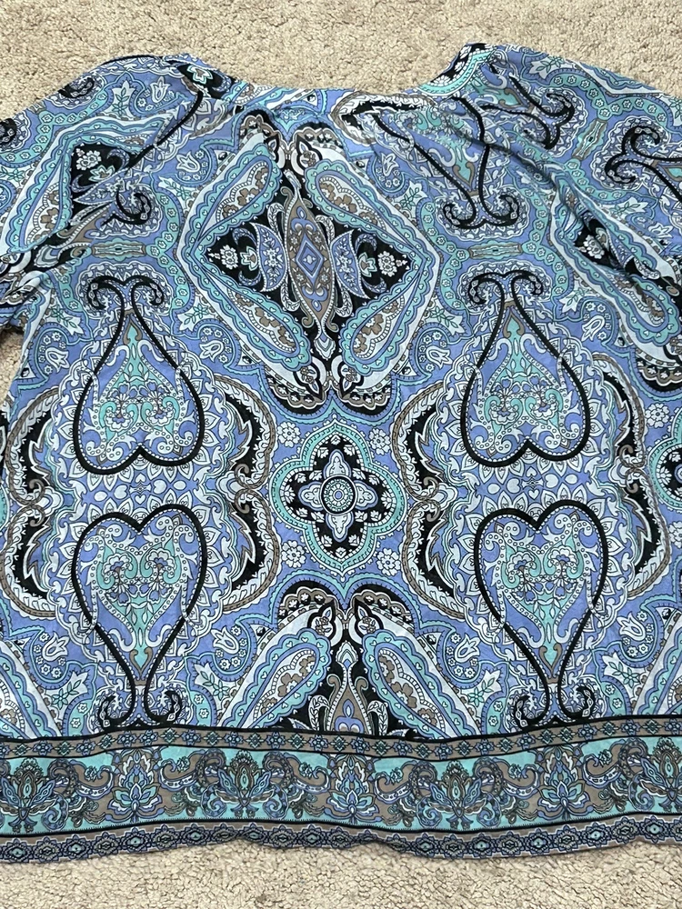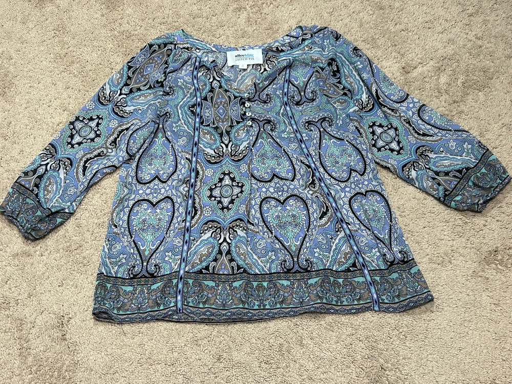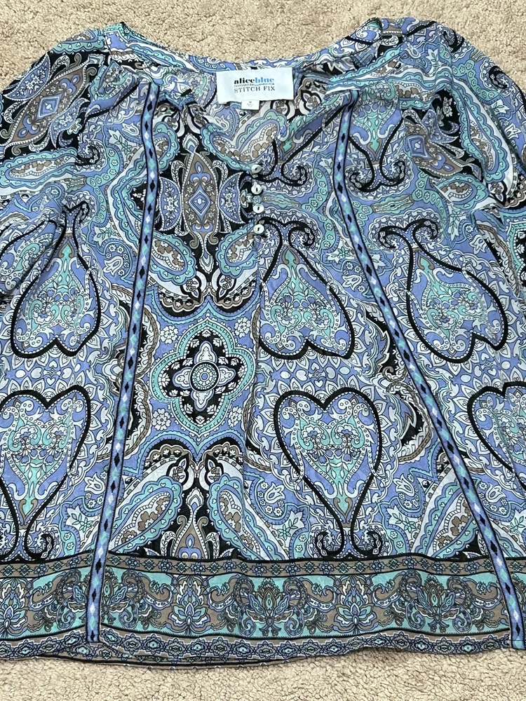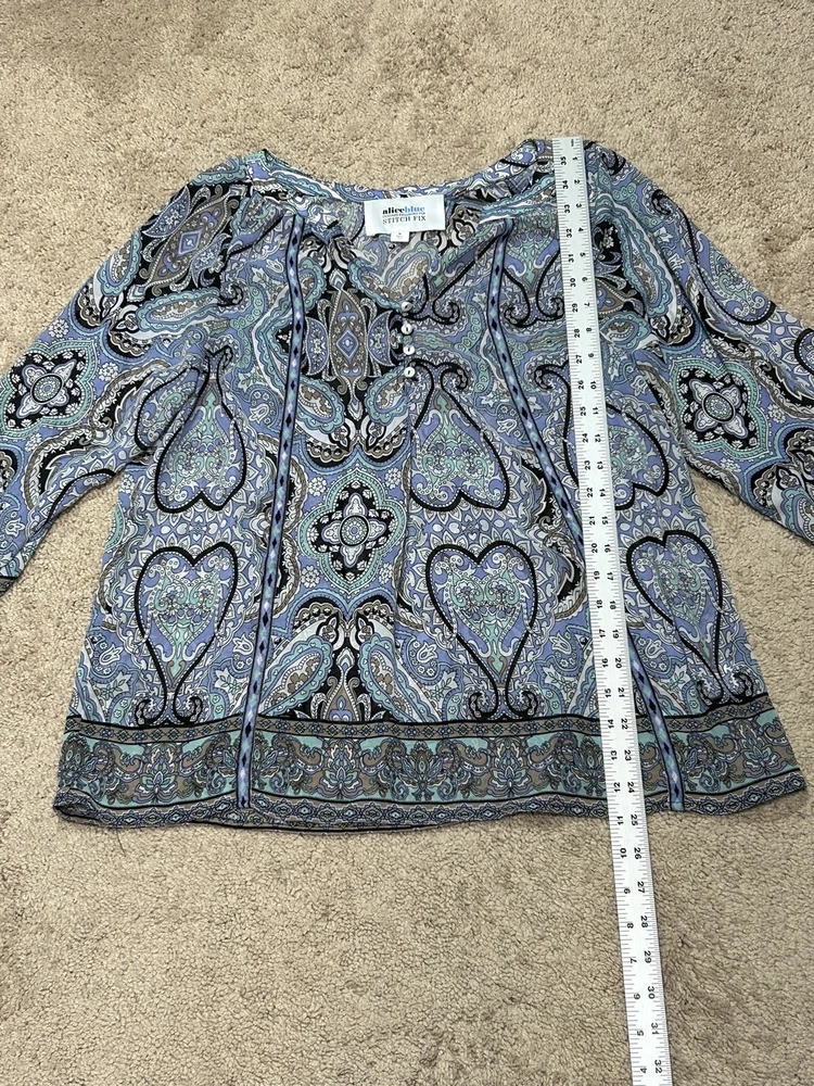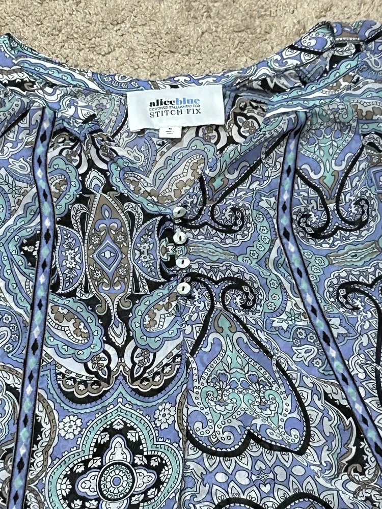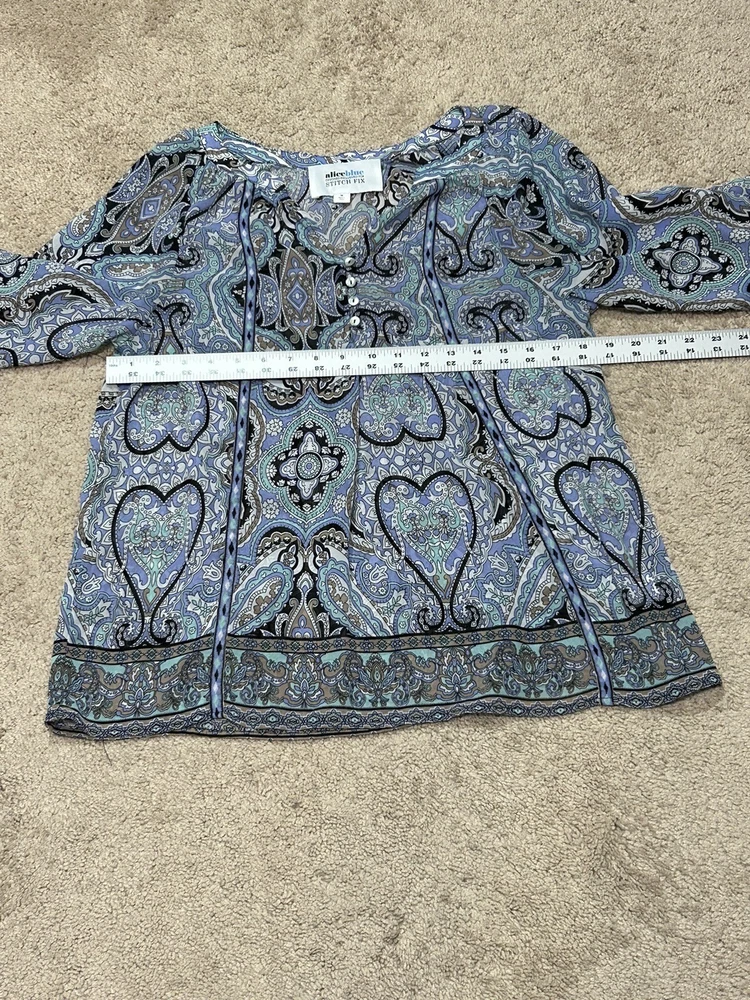 Clothing Description: Item is a pre-owned Alice Blue women's shirt in good condition. Items are carefully inspected and sealed after photos. We cannot check additional measurements or details for you. Please note, item measurements are approximate and in the photos. Previous washings may change the sizing. Please compare our measurement photos to your favorite garments to ensure fit. Colors remain vivid, we store our items in a smoke free environment If the item is pre-owned, it's cleaned per eBay standards. We do not use any freshener or scents. Shipping and Return Details We ship daily so that you receive your item quickly. We have a 30 day return policy. Please let me know if you are interested in combine shipping for multiple purchases. Please feel free to ask any questions you may and we will try our best to answer as quickly as possible.